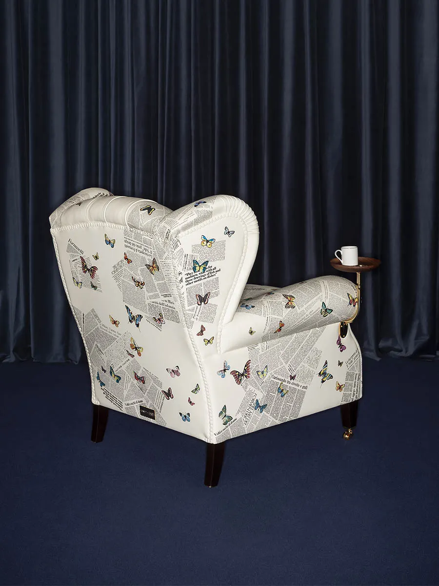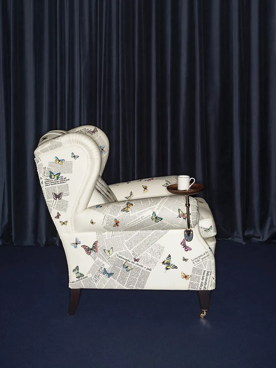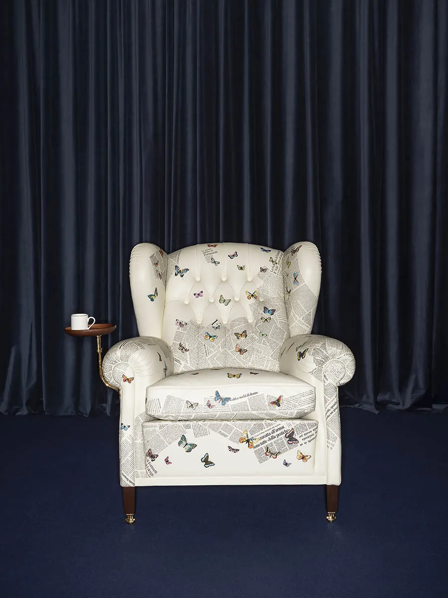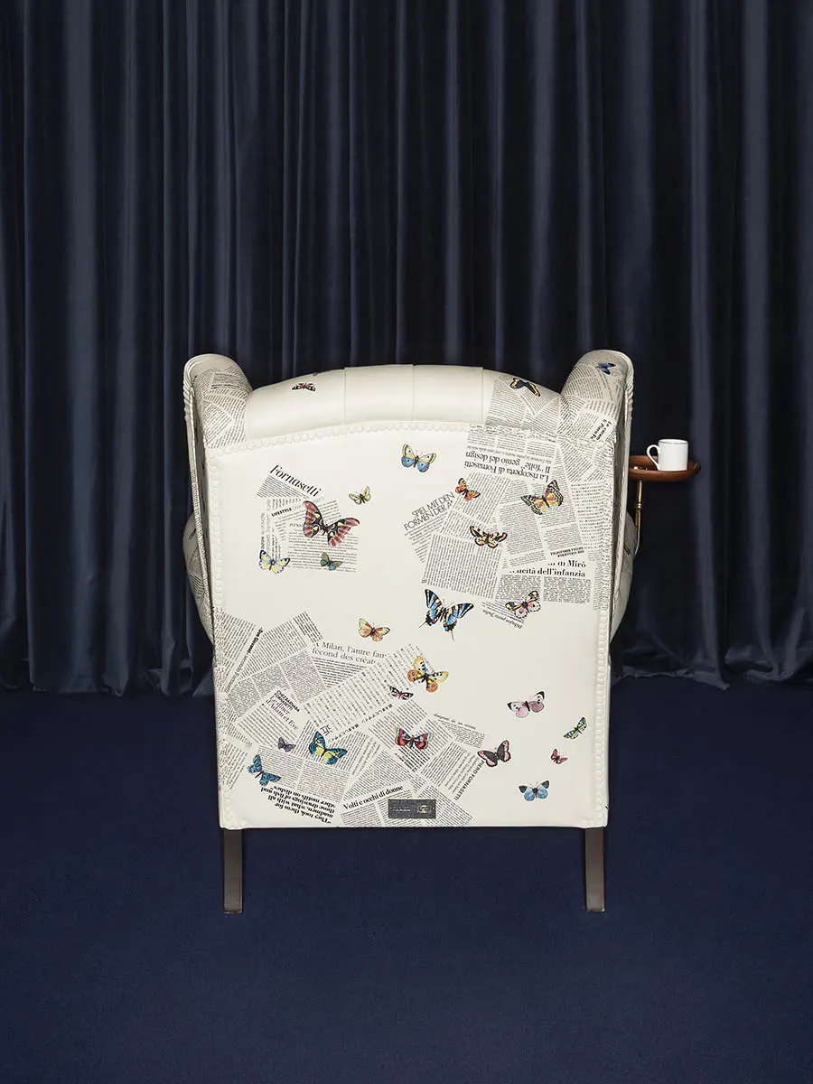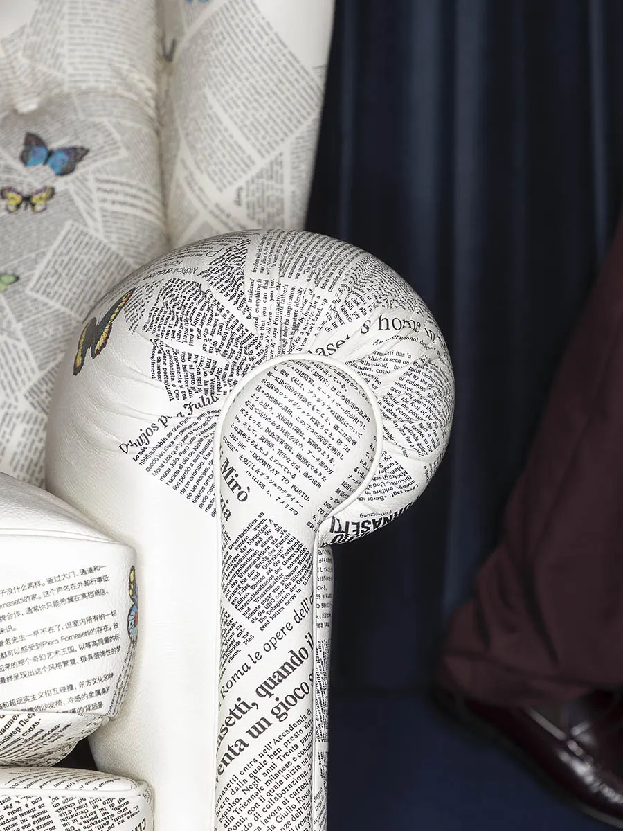 A seating that made the history of the company: 1919 is a bergère armchair made capitonné leather, in the catalogue for over a century. A classic article that for a hundred years has summed up the very essence of Poltrona Frau. Spacious, comfortable, welcoming, the 1919 leather armchair comes with a classic and timeless design. The "1919 Ultime Notizie" version is the brain-child of the partnership between Poltrona Frau and Fornasetti, another brand known worldwide for the design and decoration of unique and timeless furnishings. Created in 1950 by Piero Fornasetti, his son Barnaba redesigned, changed and breathed fresh life into the "Ultime Notizie" pattern. A playful trompe-l'œil that beckons the viewer to an "active" and imaginative vision: leather looks like paper and the paper had been initially conceived to be printed on silk. The visual lightness of the print is also an invitation to conceptual lightness: “Don't dwell on the news, because the news is volatile".