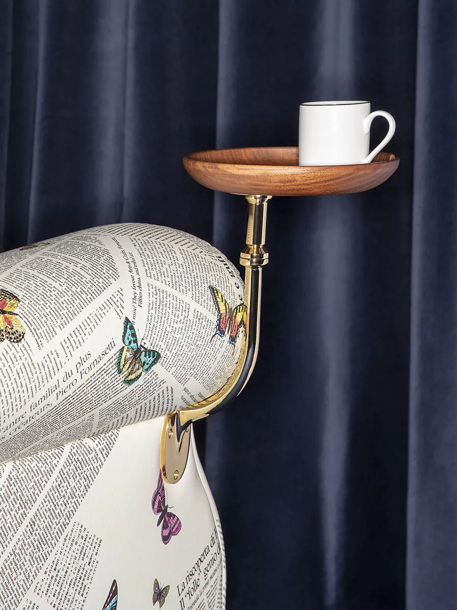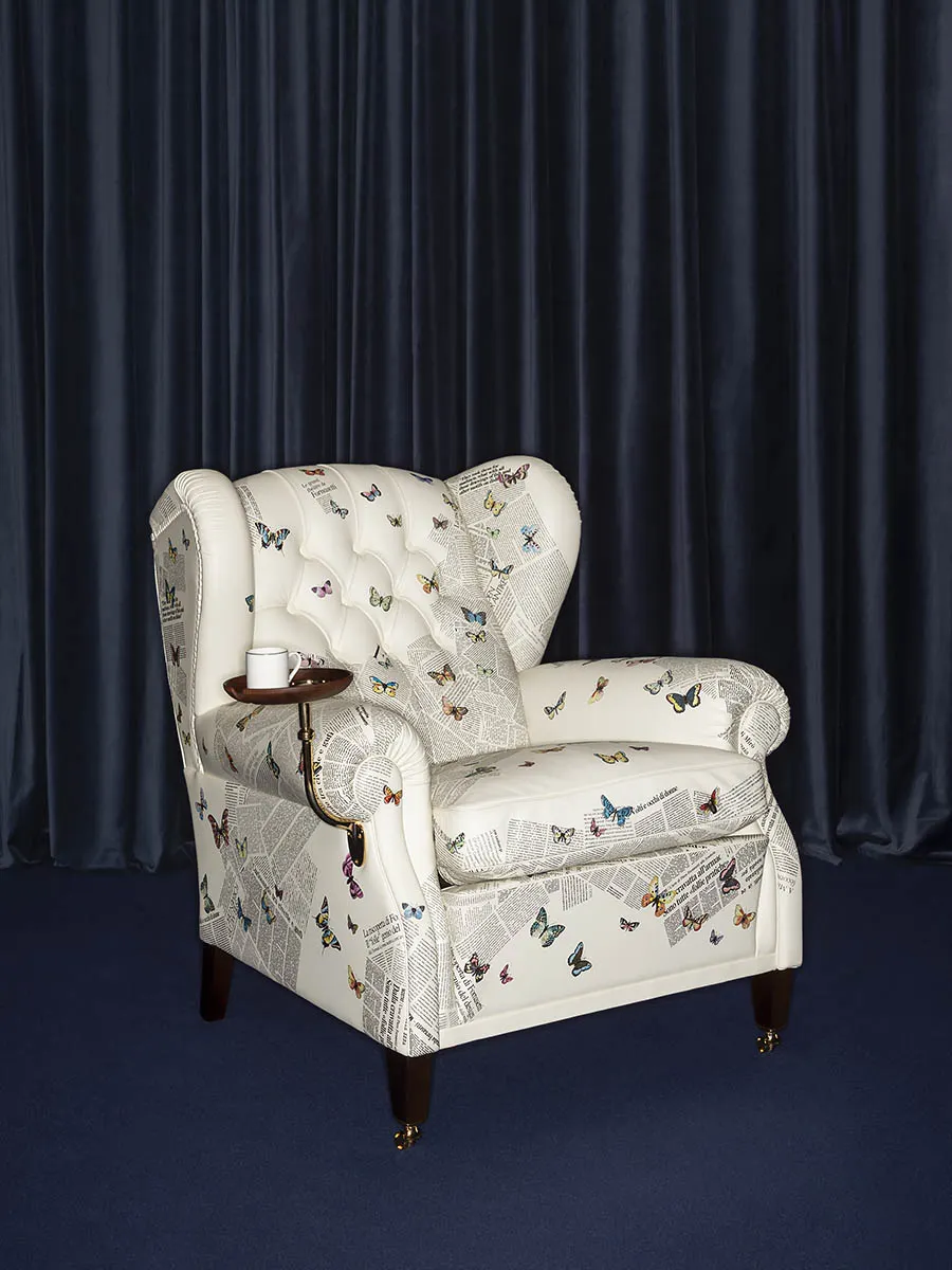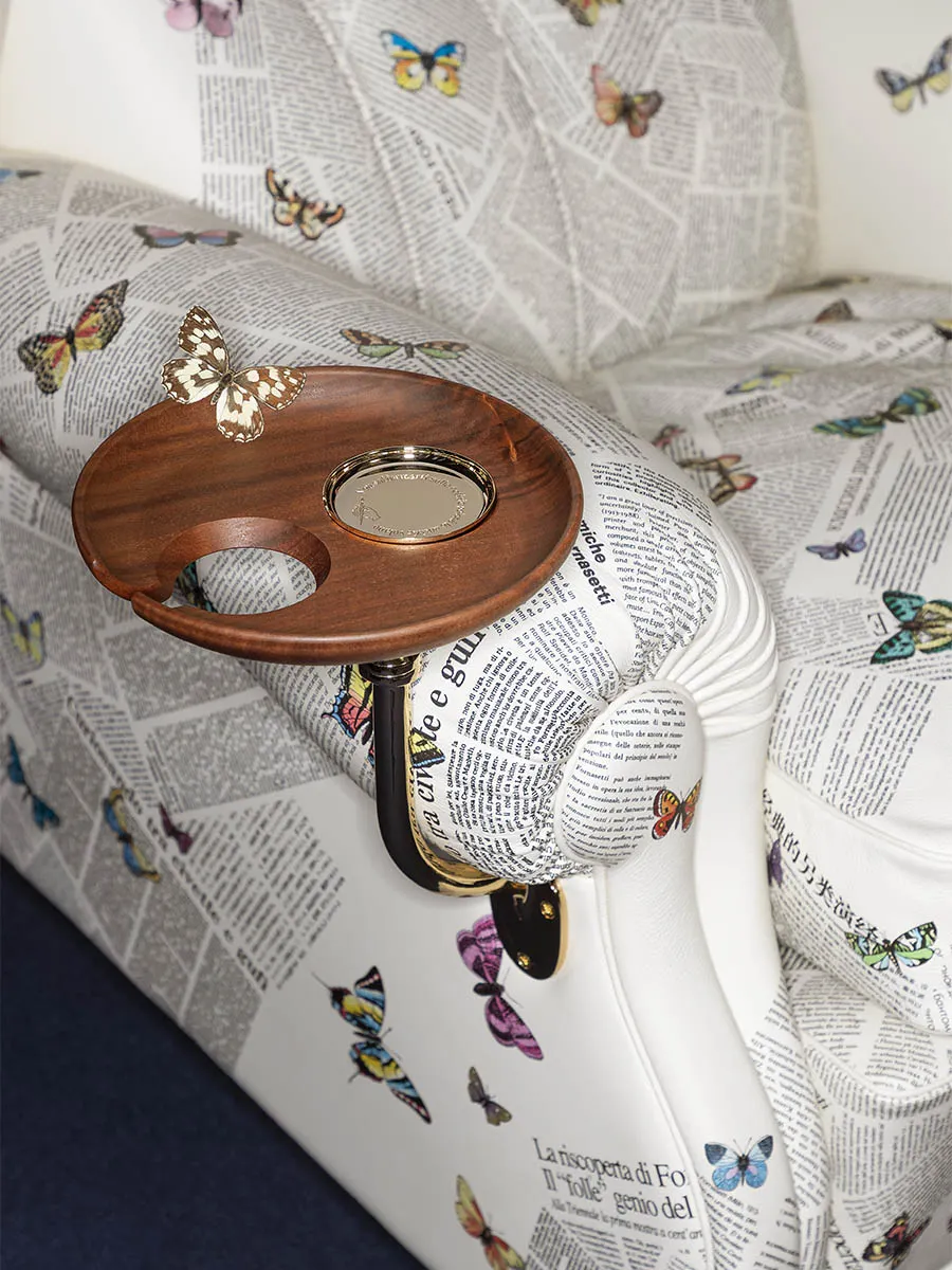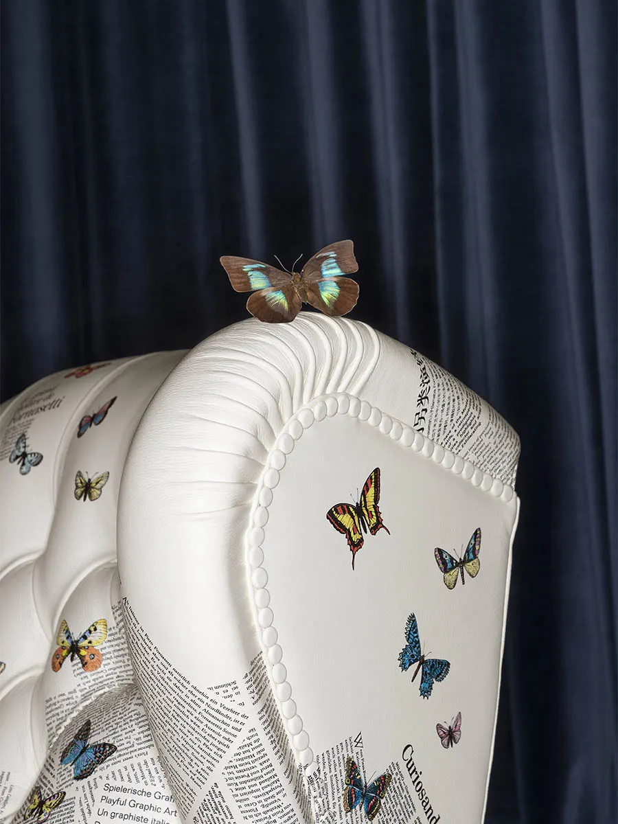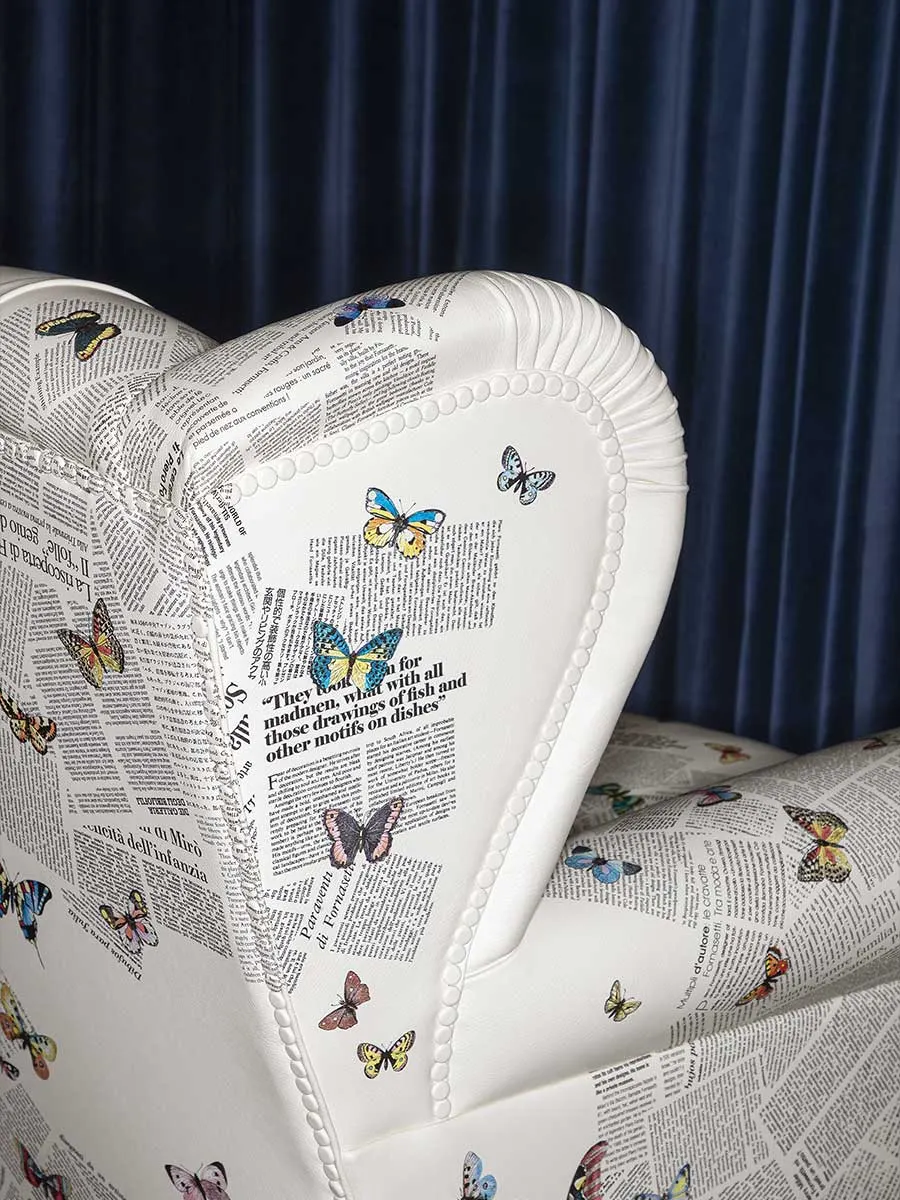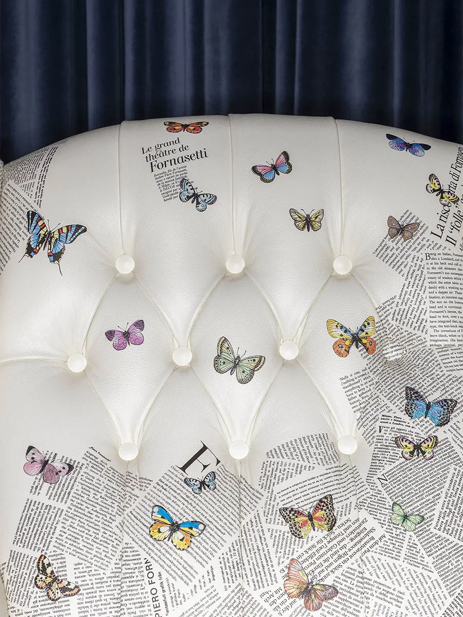 A seating that made the history of the company: 1919 is a bergère armchair made capitonné leather, in the catalogue for over a century. A classic article that for a hundred years has summed up the very essence of Poltrona Frau. Spacious, comfortable, welcoming, the 1919 leather armchair comes with a classic and timeless design. The "1919 Ultime Notizie" version is the brain-child of the partnership between Poltrona Frau and Fornasetti, another brand known worldwide for the design and decoration of unique and timeless furnishings. Created in 1950 by Piero Fornasetti, his son Barnaba redesigned, changed and breathed fresh life into the "Ultime Notizie" pattern. A playful trompe-l'œil that beckons the viewer to an "active" and imaginative vision: leather looks like paper and the paper had been initially conceived to be printed on silk. The visual lightness of the print is also an invitation to conceptual lightness: “Don't dwell on the news, because the news is volatile".