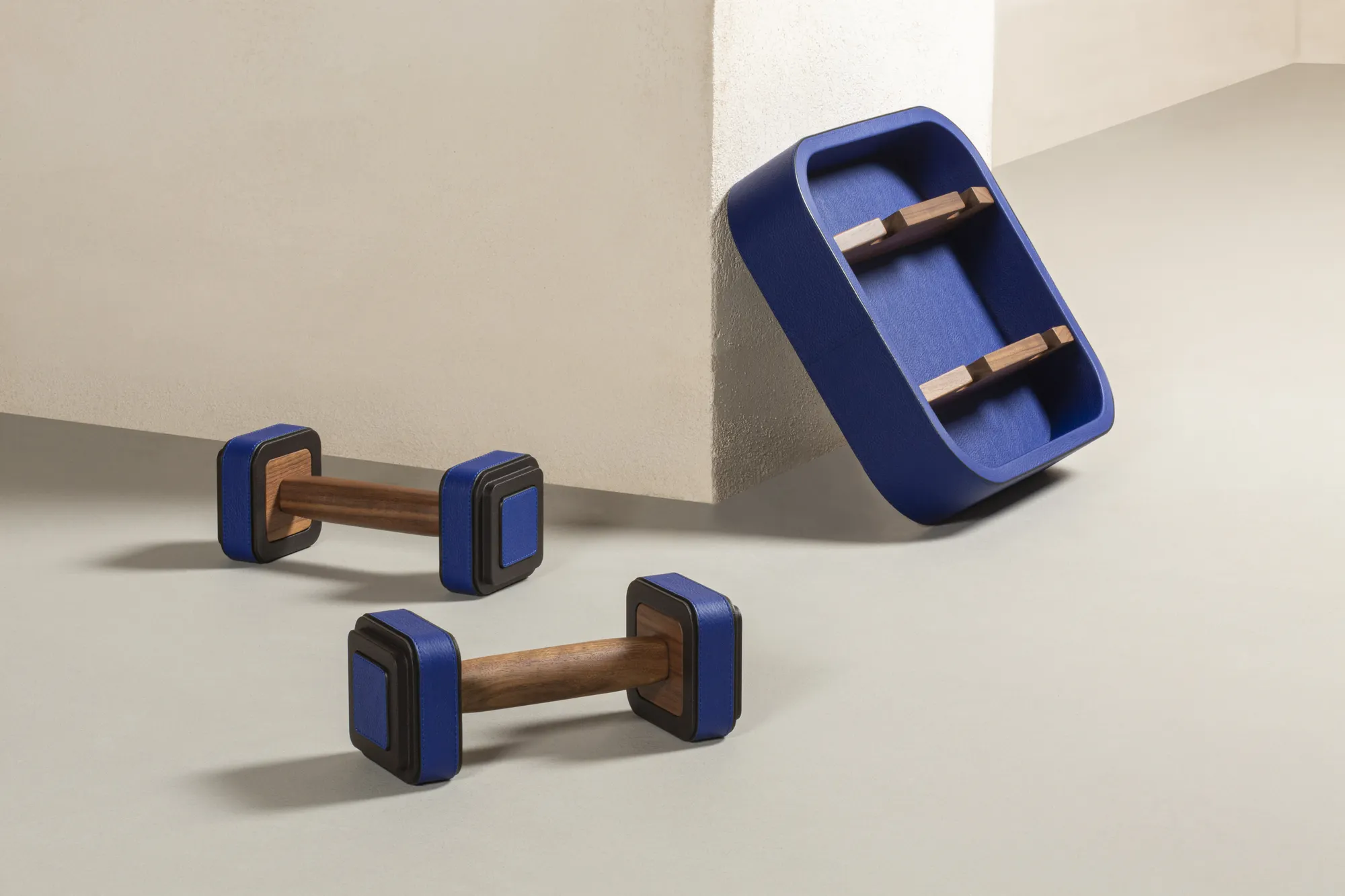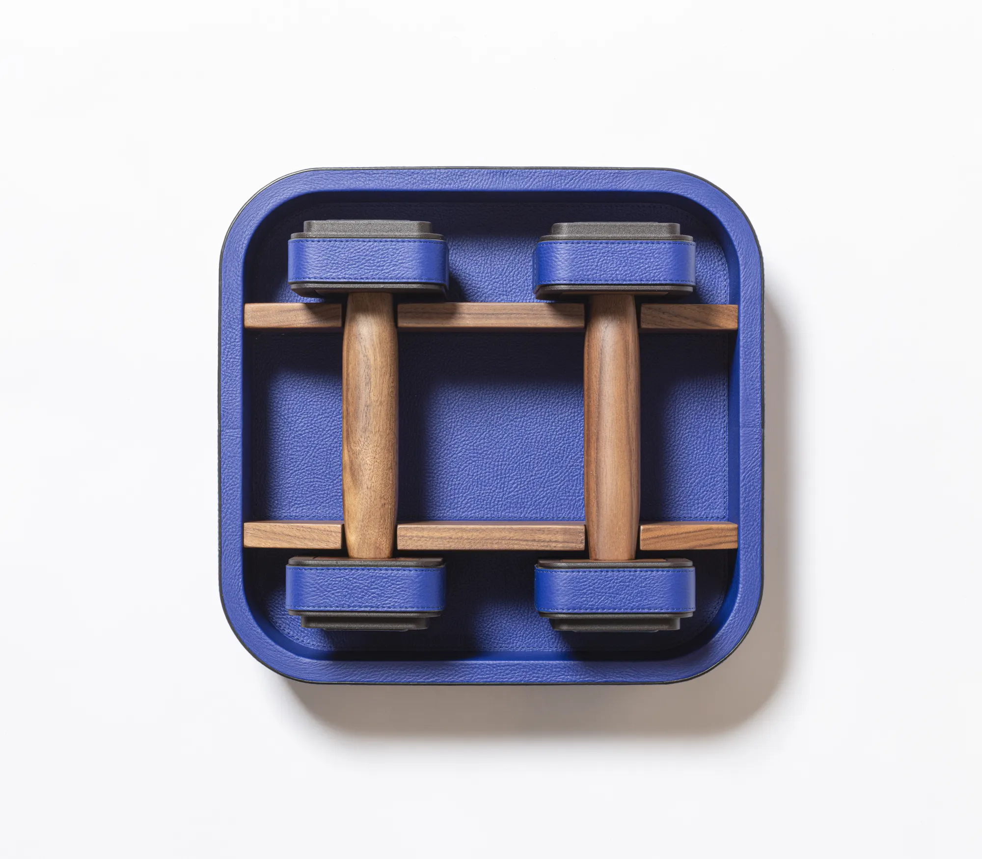 This pair of 2kg weights is designed to be both used for exercises and, when placed in its matching leather-covered holder with fine walnut wood inserts, as a home decor, being a stylish product that can be proudly showcased inside homes. Burnished brushed bronze weights featuring Pelle Frau® leather inserts and walnut wood grips.