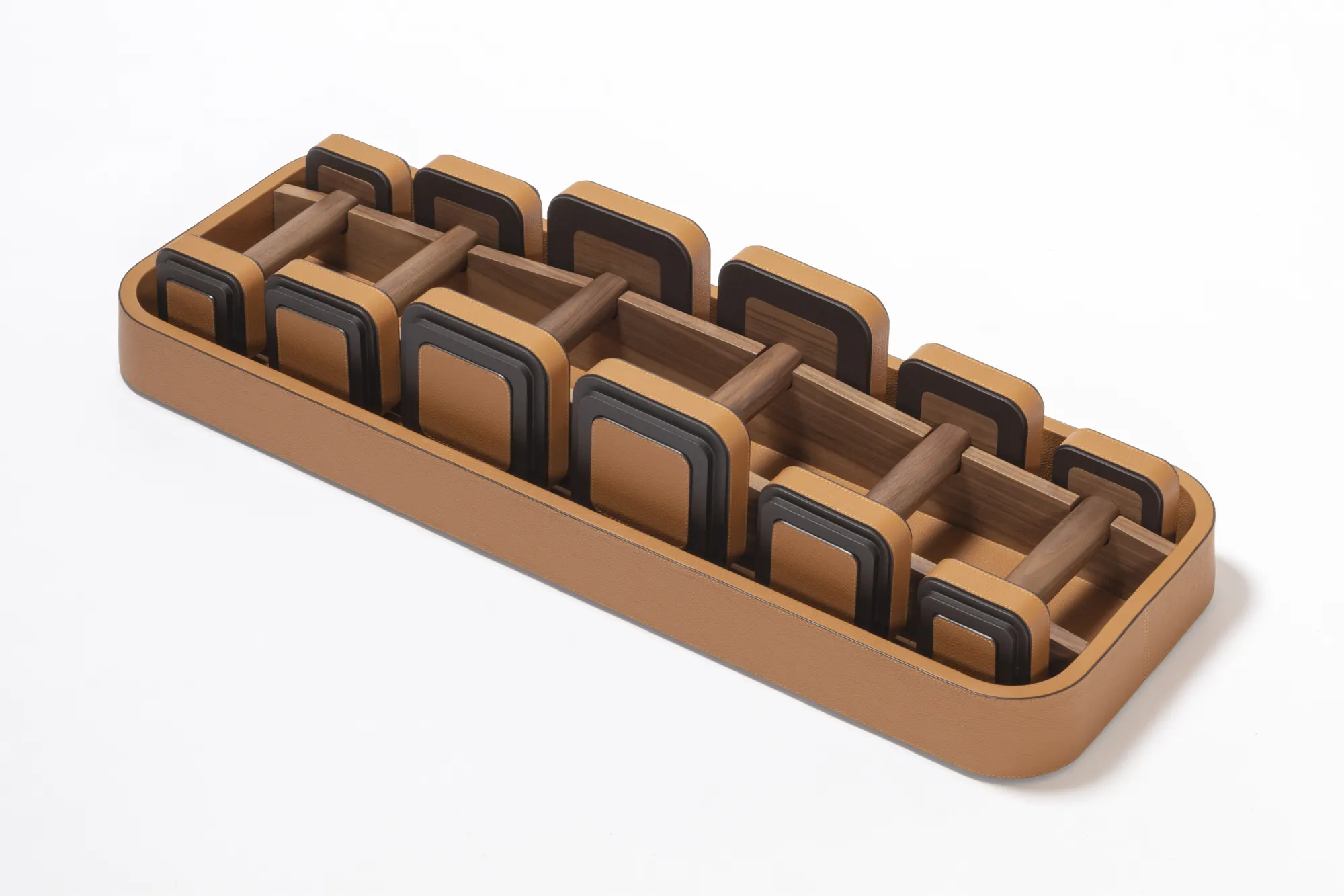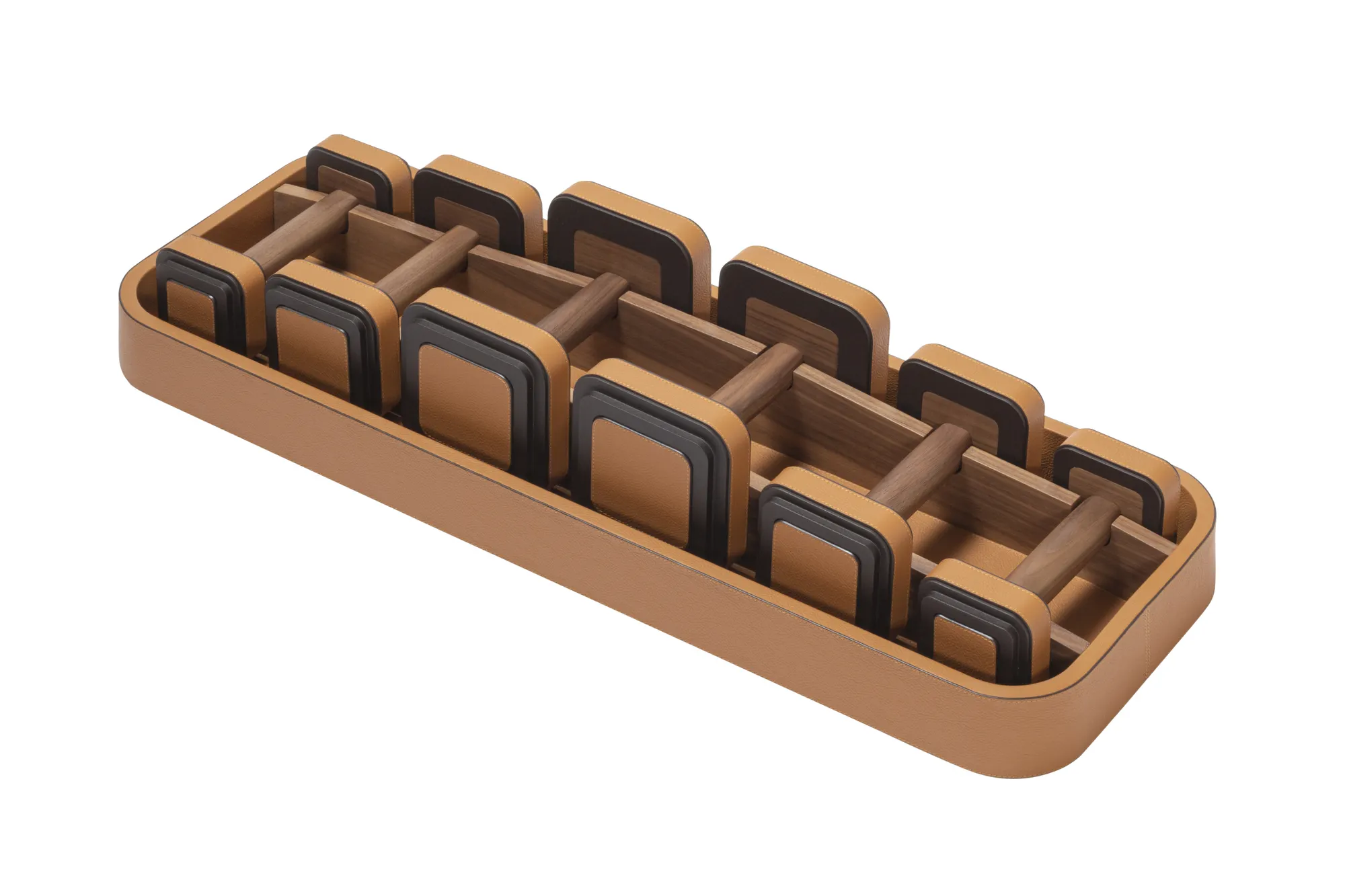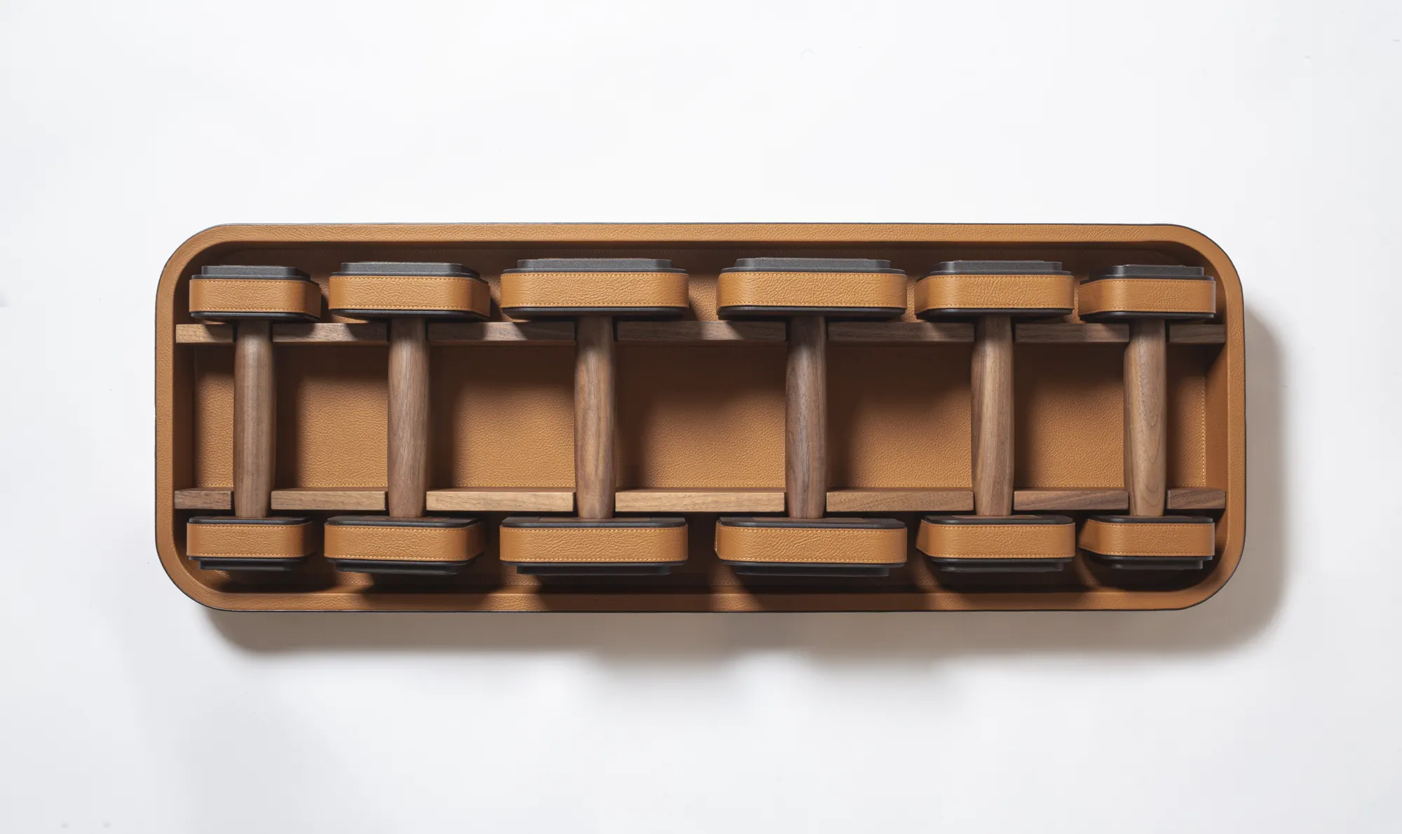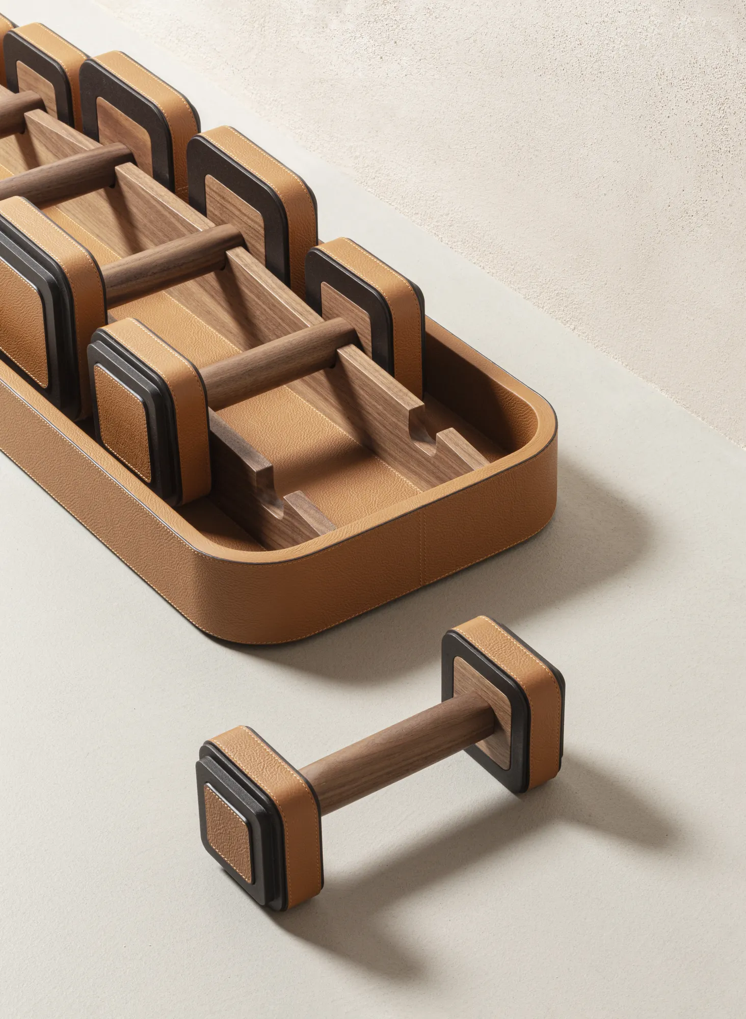 This set of weights (pairs of 2, 4, and 6 kg) is designed to be both used for exercises and, when placed in its matching leather-covered holder with fine walnut wood inserts, as a home decor, being a stylish product that can be proudly showcased inside homes. Burnished brushed bronze weights featuring Pelle Frau® leather inserts and walnut wood grips.