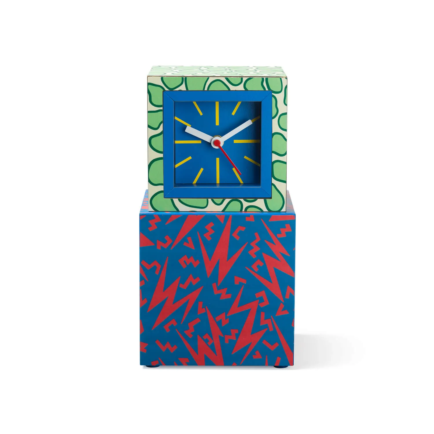 In the Acapulco table clock, designed by George Sowden, functional quality and rationality combine with the emotional impact of decorative and chromatic verve. Acapulco has solid geometric forms, two stacked cubes; nevertheless, the compositional rigor is broken up by the different sizing of the two solids, adorned by vibrant contrasting patterns. The extremely creative use of decorative laminate sets the character of this object-totem. The red face is underscored by the frame in the same color; red also appears in the lightning bolts of the pattern of the “box” below. The hands and the hour markers have forceful rays, without numbers; at the center the overlap of the three hands is emphasized by a blue circle. Table clock covered with decorative laminate. Limited edition of 30 pieces.