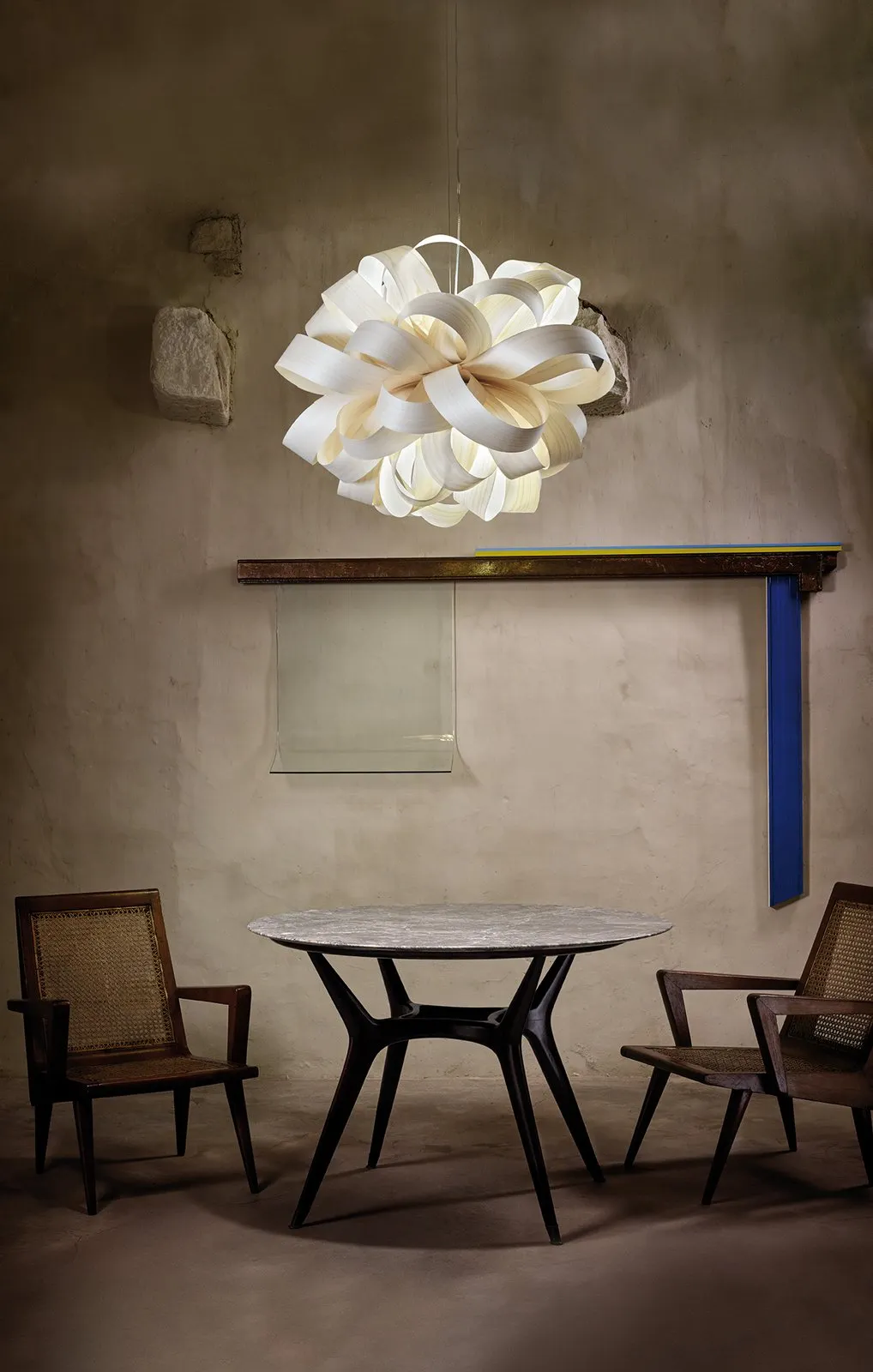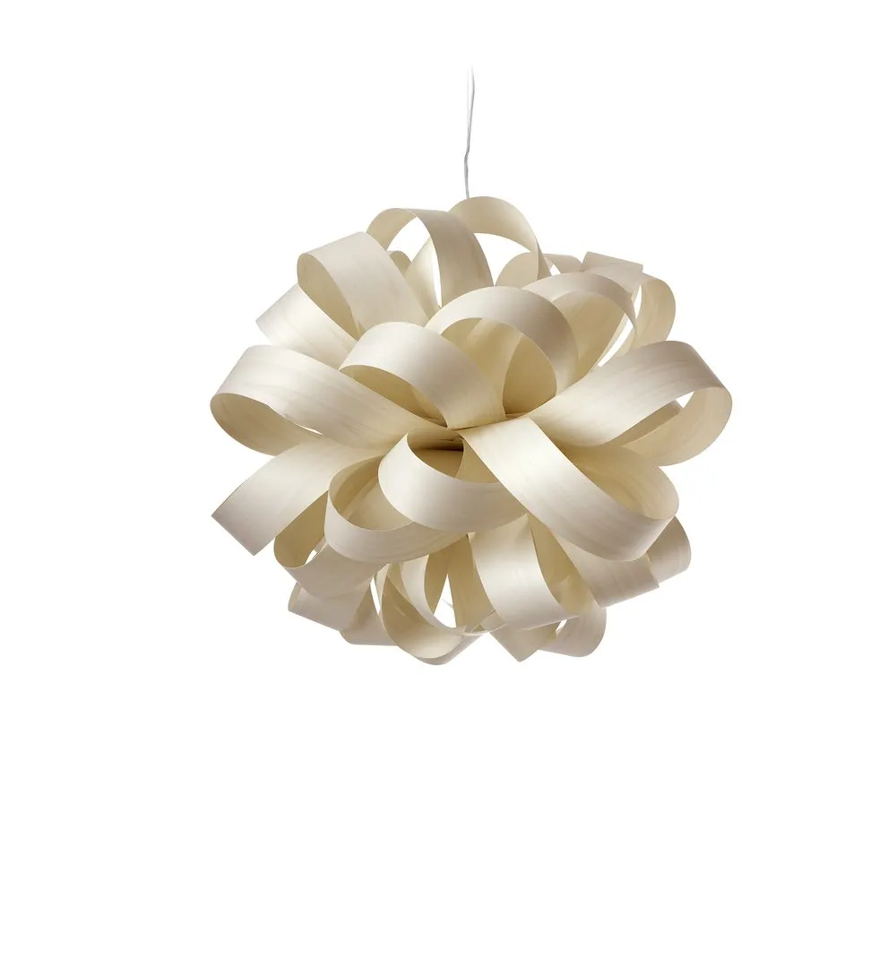 AGATHA BALL THE DRAMATIC LIGHT. Agatha’s elegant whorls of wood veneer strips combine to form an appealing suspension lamp. Designed by Luis Eslava Studio, the lamps’s concentric layers create an intriguing shape, one that sets Agatha apart. Gazing at those elegant whorls, we might visualise Agatha as a wonderfully ageing thespian: a shining light. The Agatha Ball is the clever coalescence of two Agatha Small lamps, with its whorls of wood veneer strips appearing like a captivating ball of light. The Agatha Ball is available in the following wood veneers: Ivory White, Natural Beech, Yellow, Orange, Grey, Pale Rose & Sea Blue. The canopy has a Matt Nickel finish.