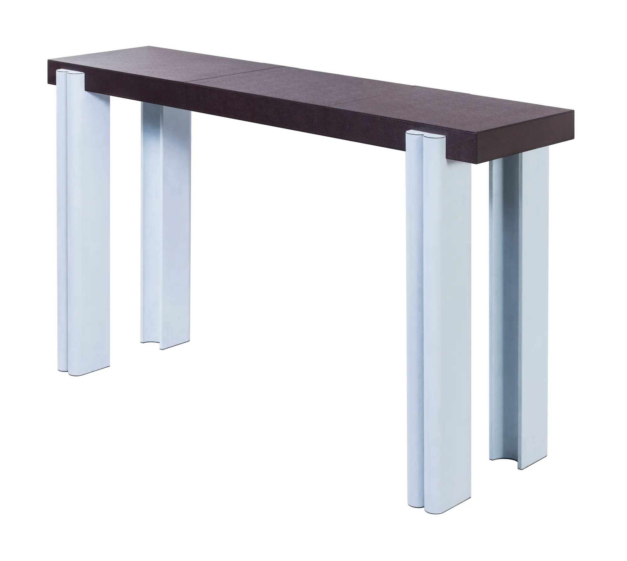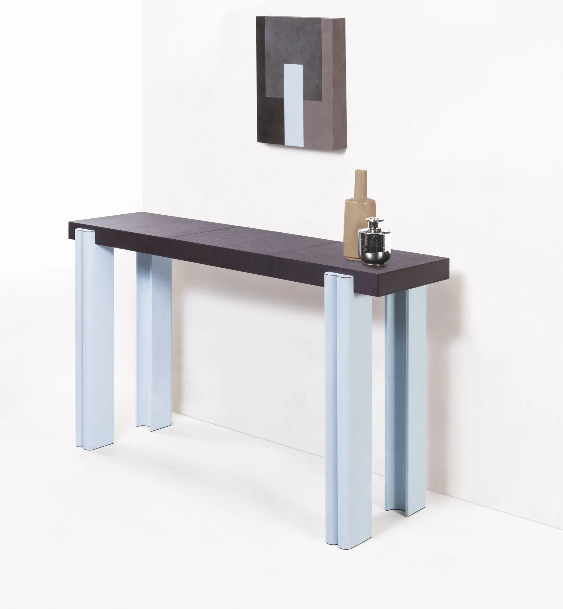 The innovative furniture collection is composed of geometric shapes with leather bound legs featuring unconventional proportions and rounded convex and concave forms the signature design is utilized in a bookend that boasts a strong sculptural quality. Just as in the architecture of Mies van der Rohe, the subtle detailing here never calls attention to itself and meets an inquisitive gaze with a fitting response.