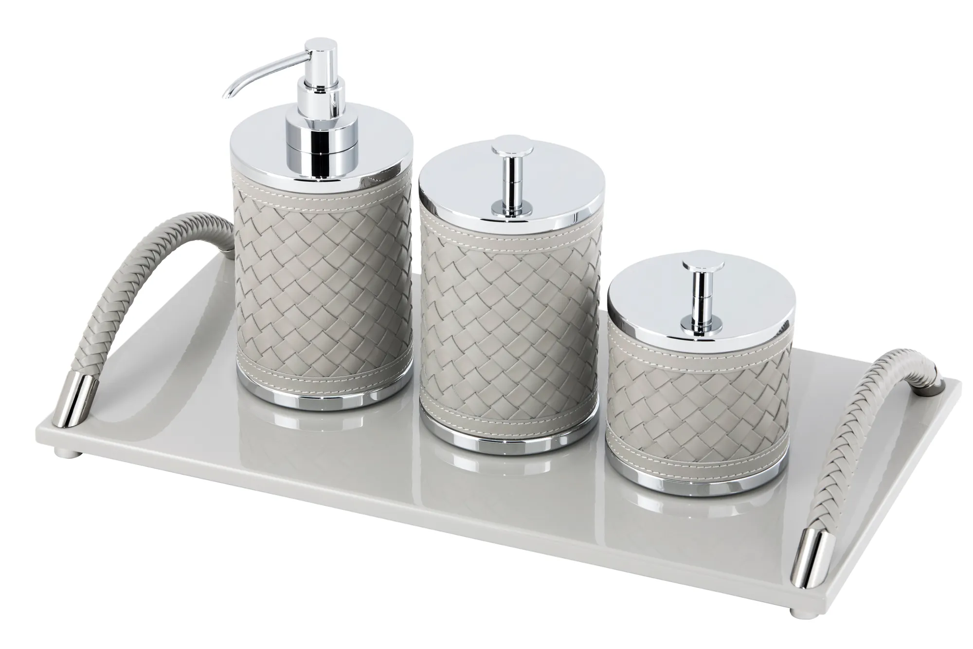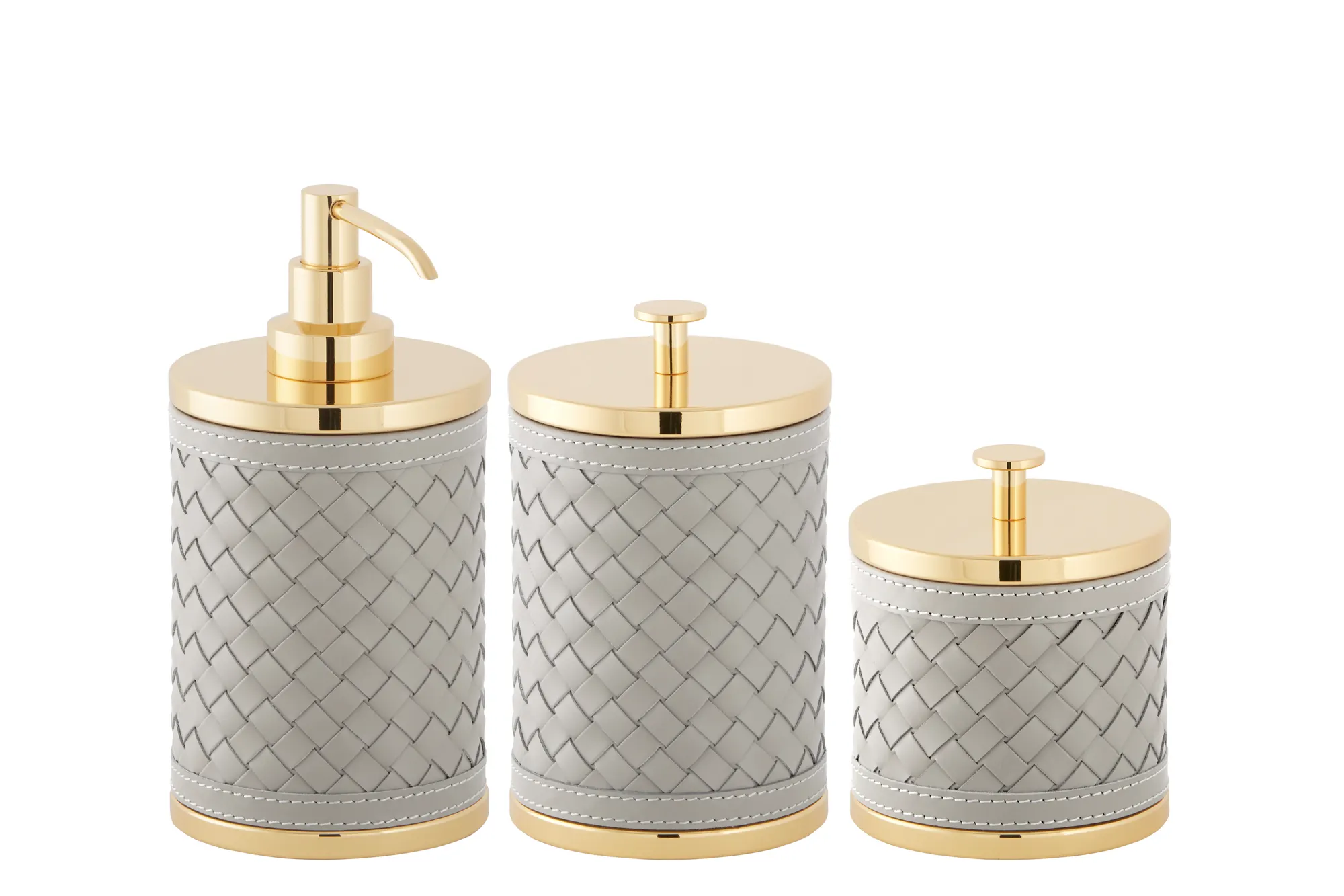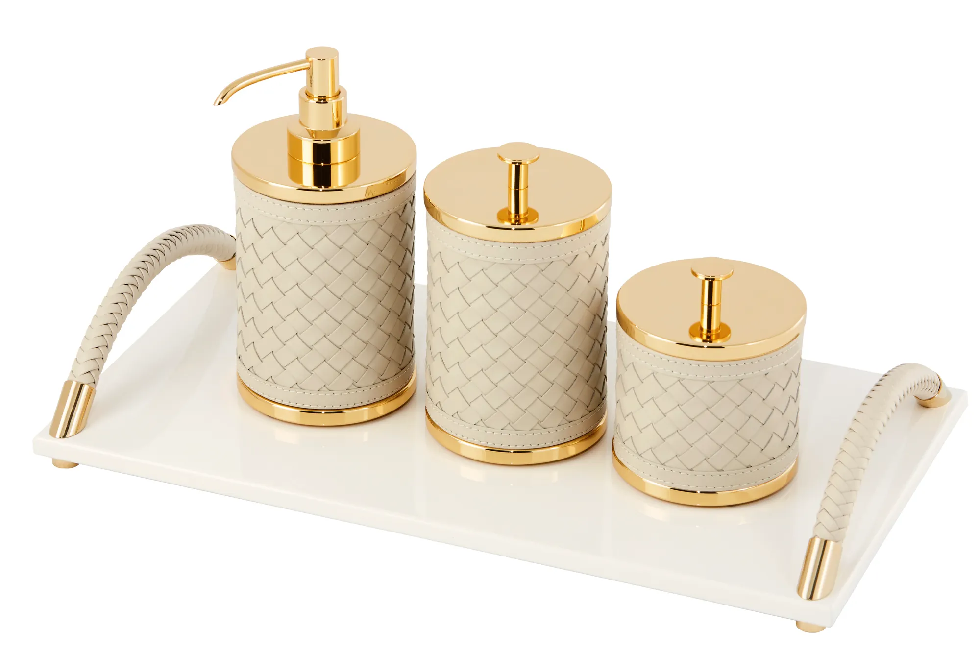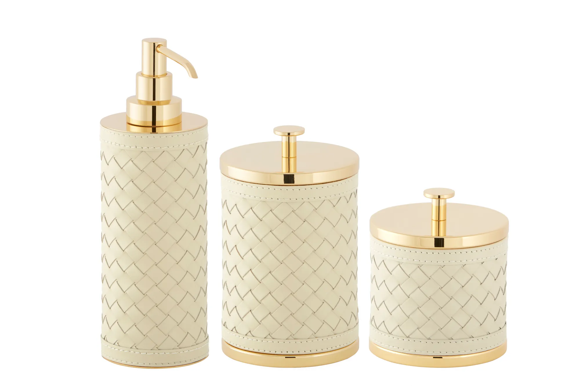 Each piece of this bathroom set is covered with handwoven leather and boasts a chrome or gold metal finish.