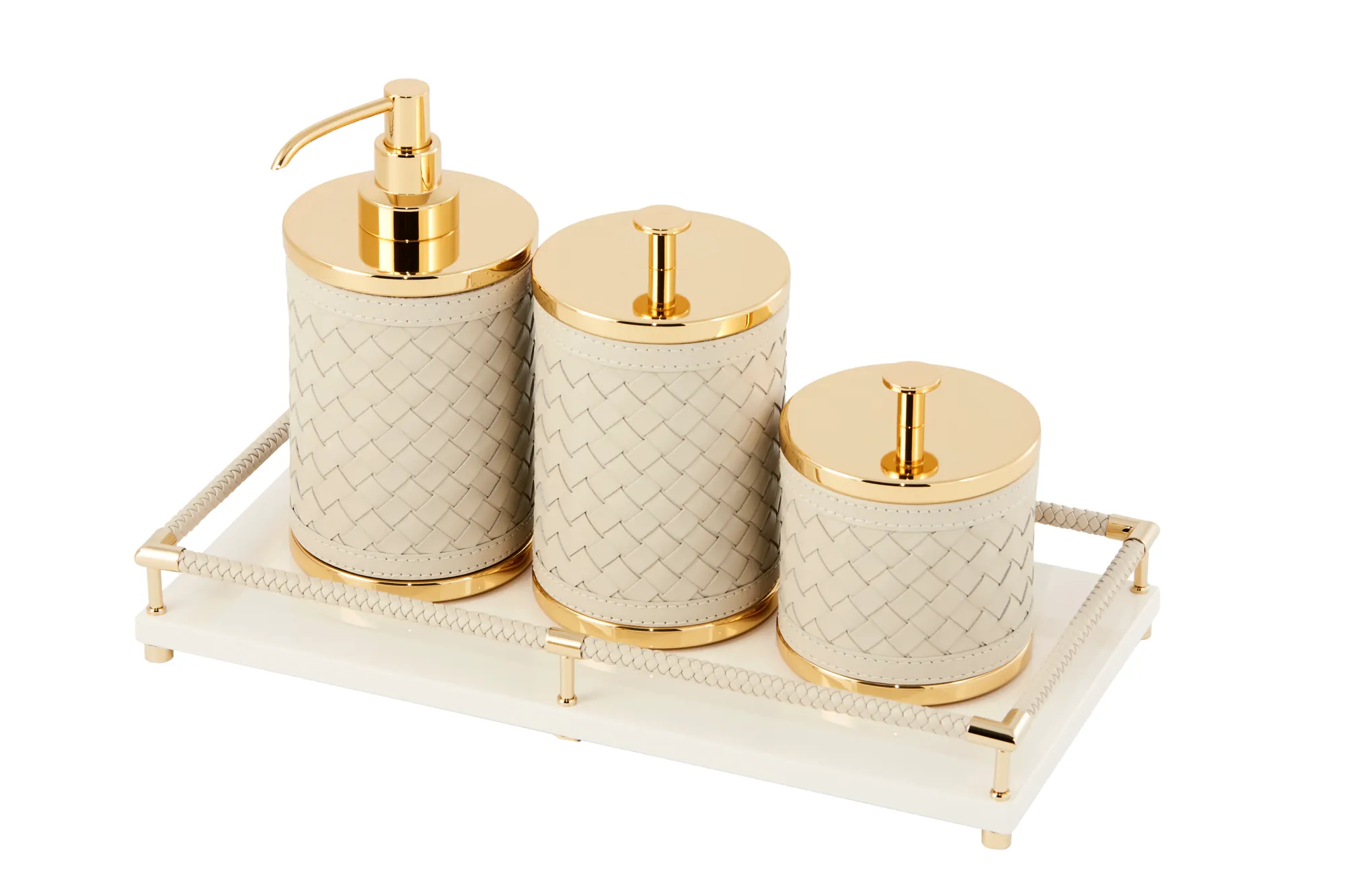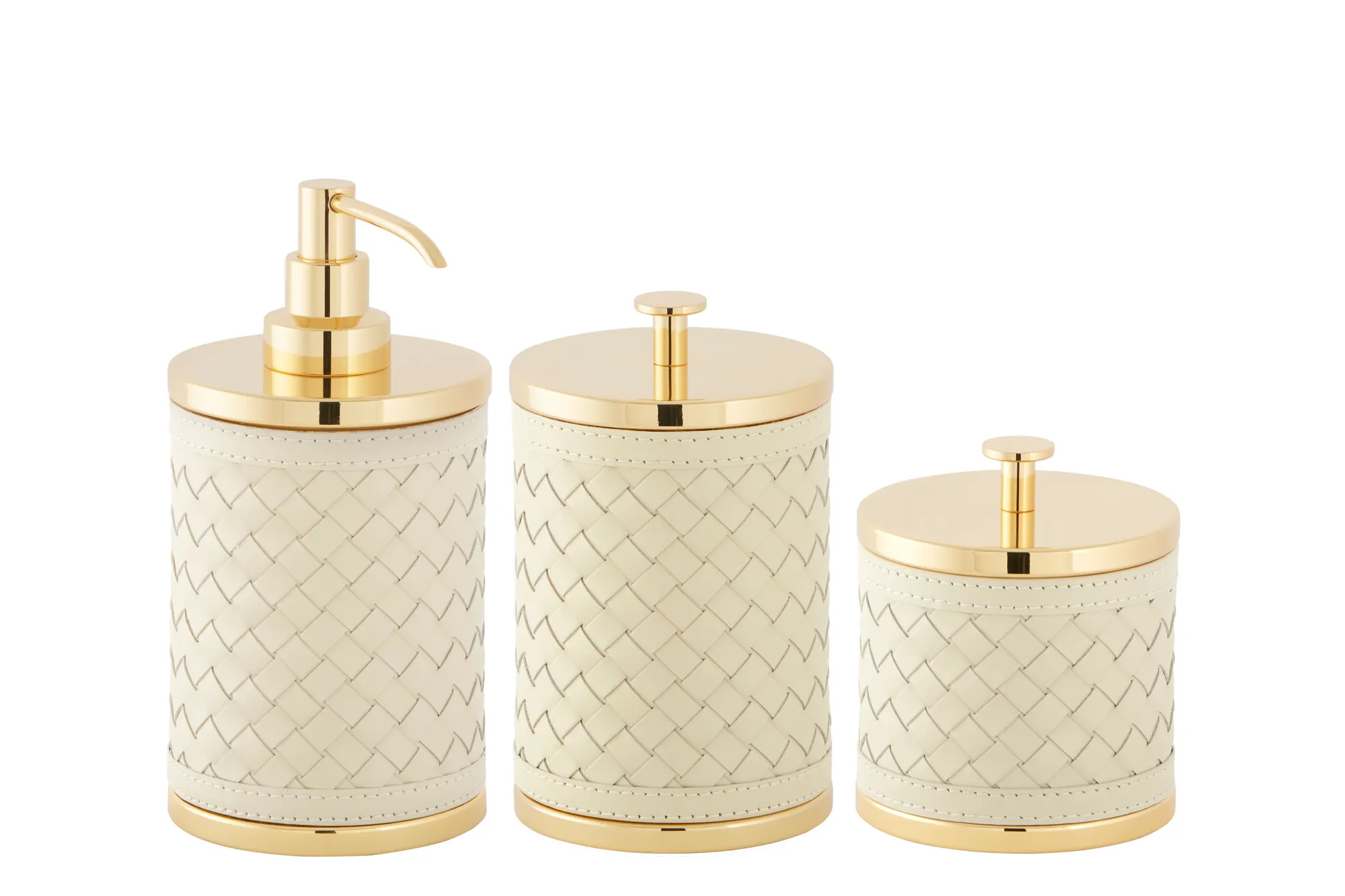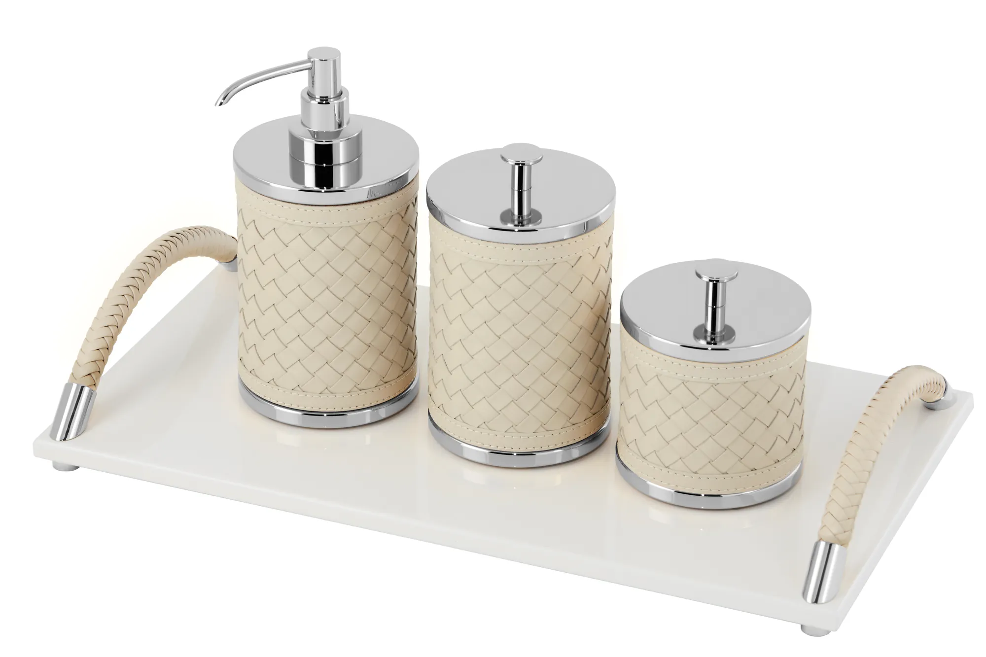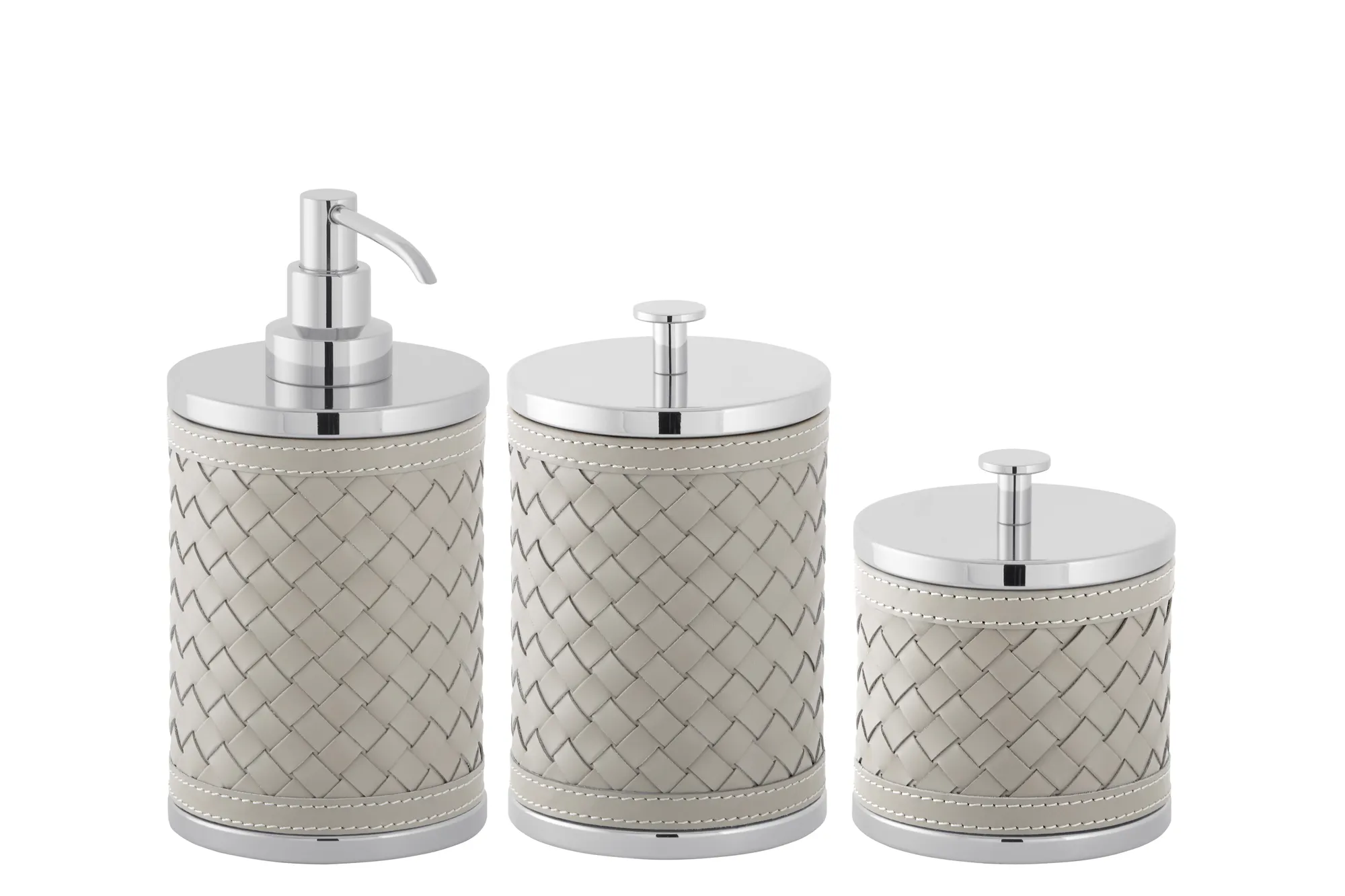 Each piece of this bathroom set is covered with handwoven leather and boasts a chrome or gold metal finish.