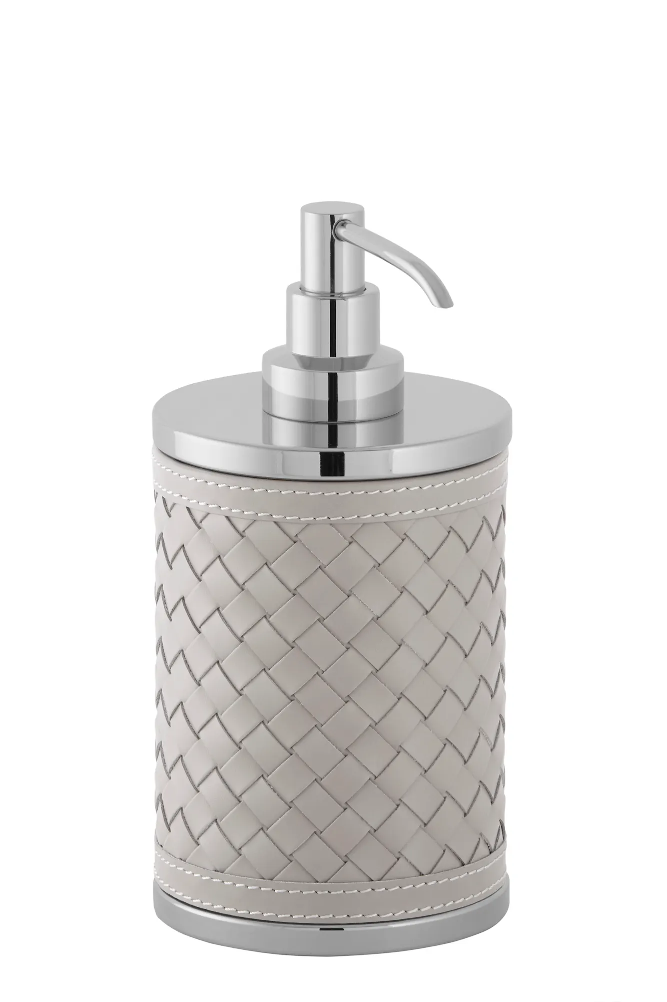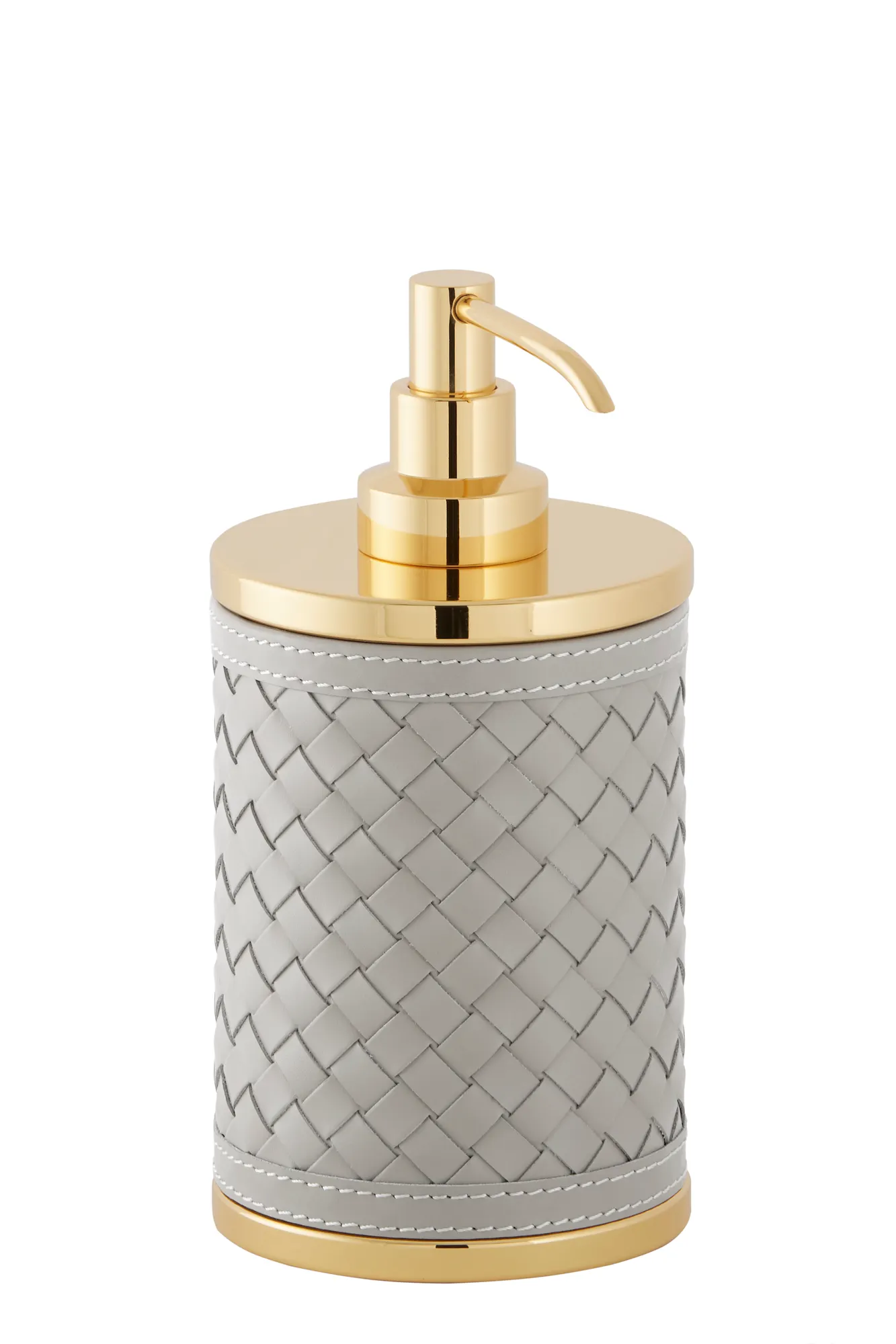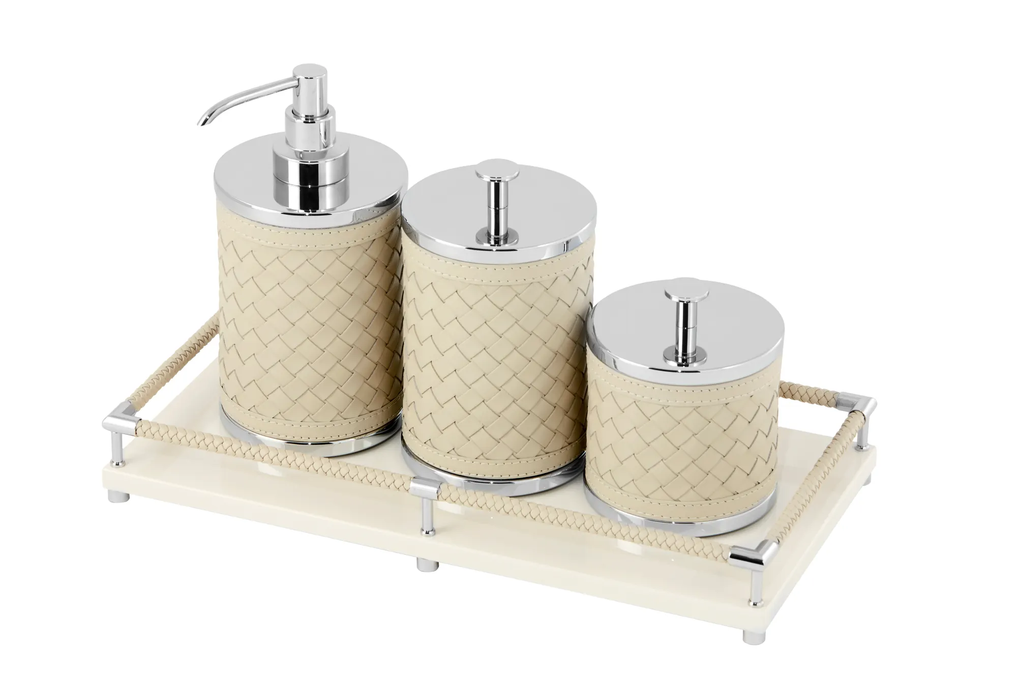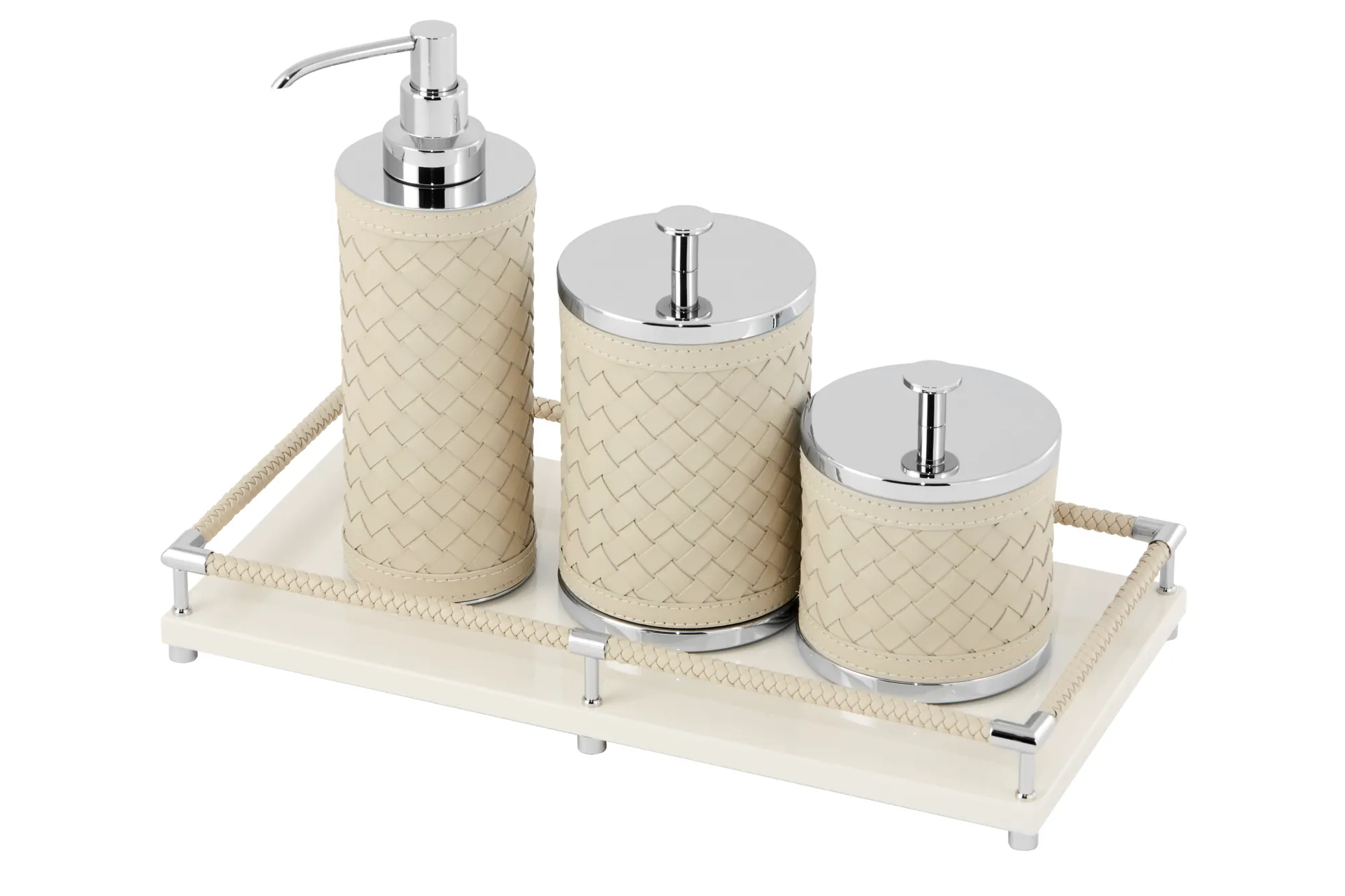 Each piece of this bathroom set is covered with handwoven leather and boasts a chrome or gold metal finish.