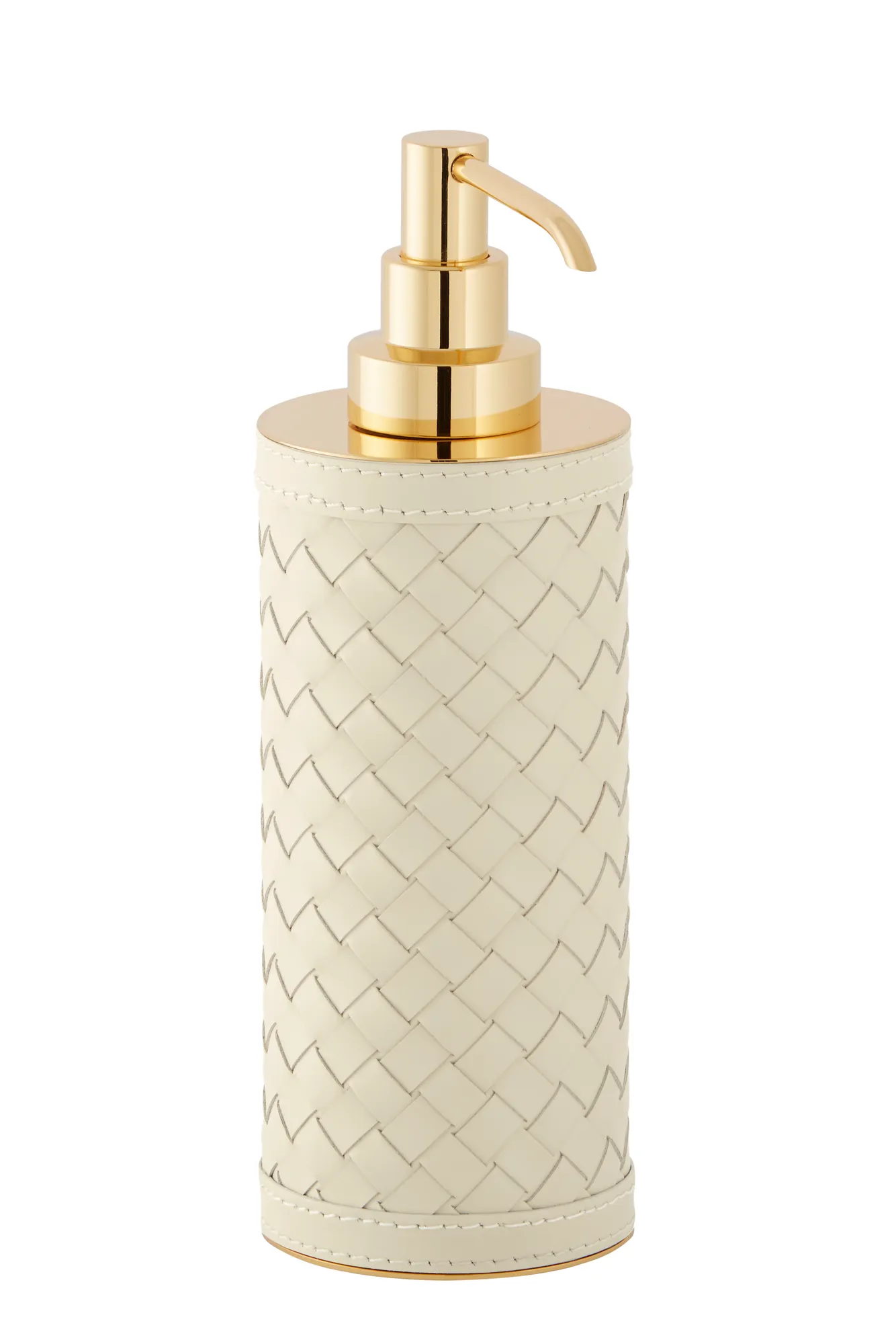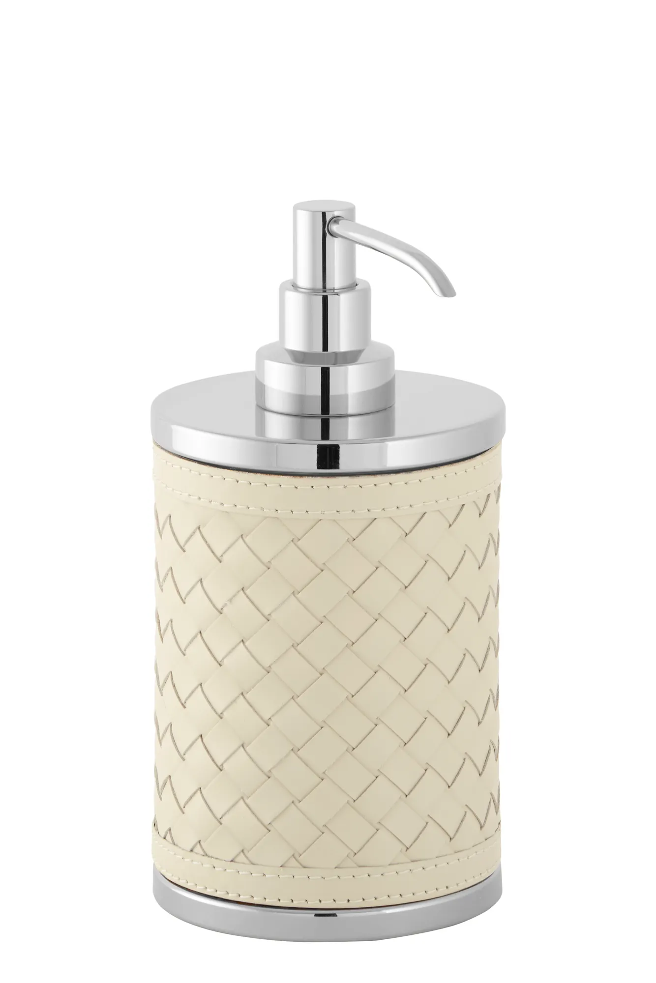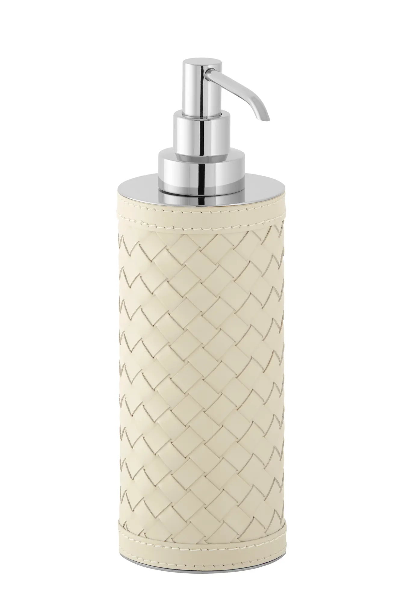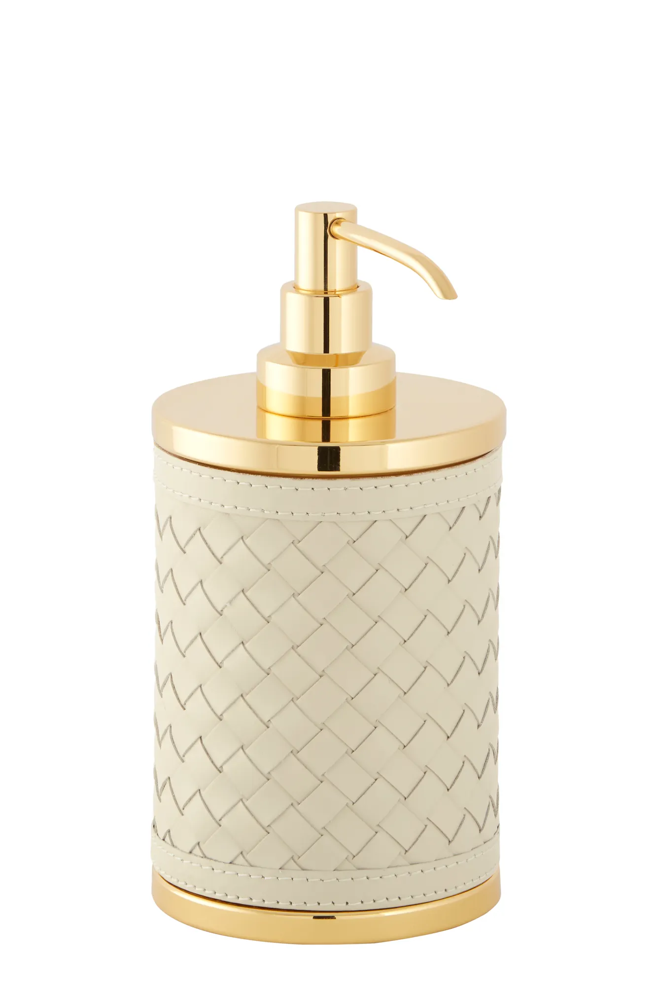 Each piece of this bathroom set is covered with handwoven leather and boasts a chrome or gold metal finish.