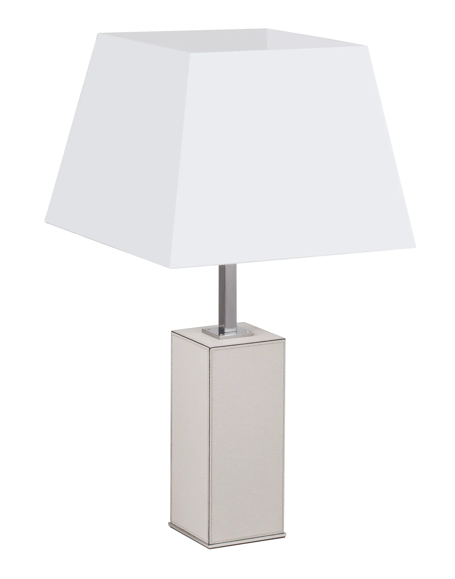 Leather covered wood base provided with capitals. Leather covered wood lamp holder fixed on a bronze base. White linen lampshade with fireproof diffuser.