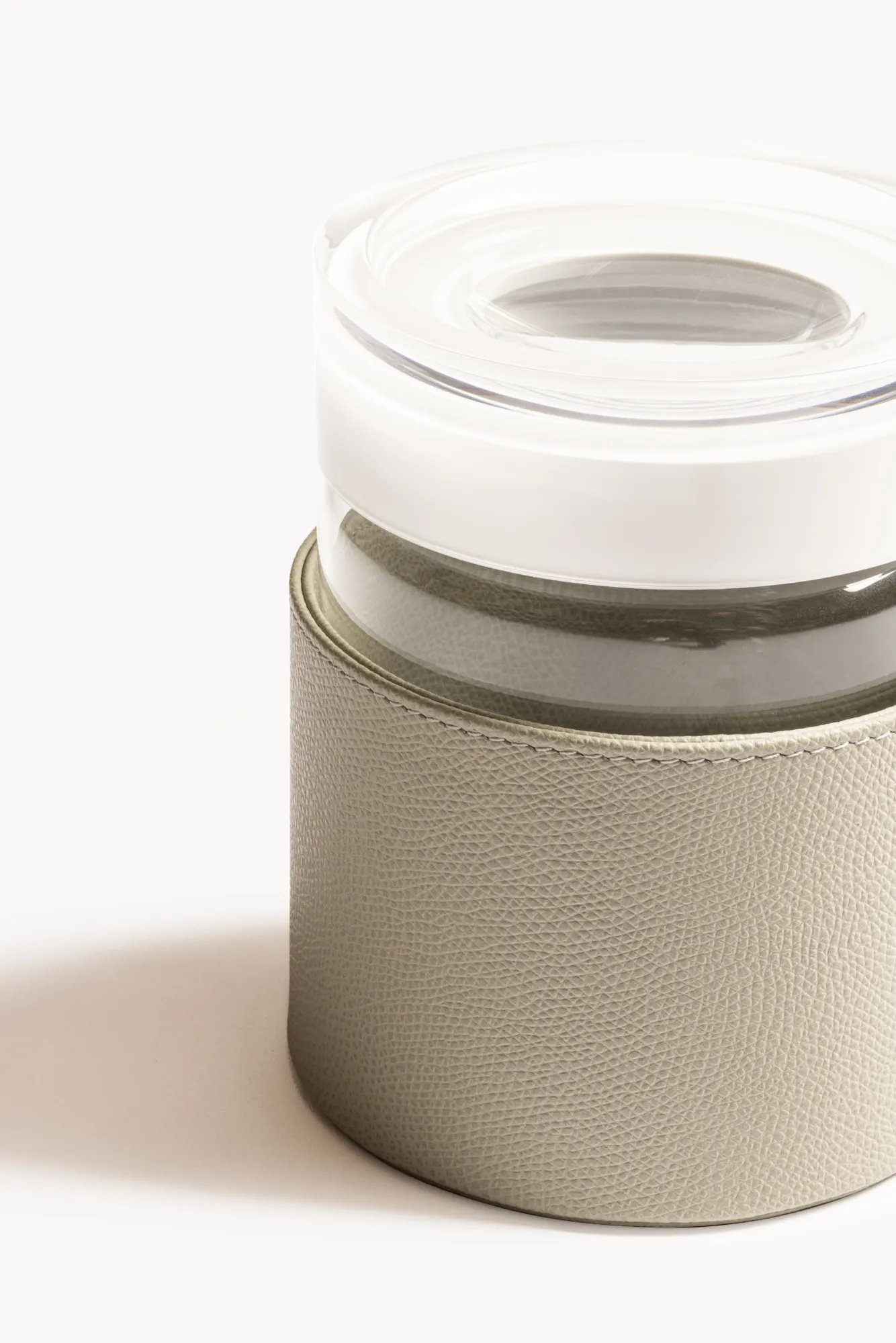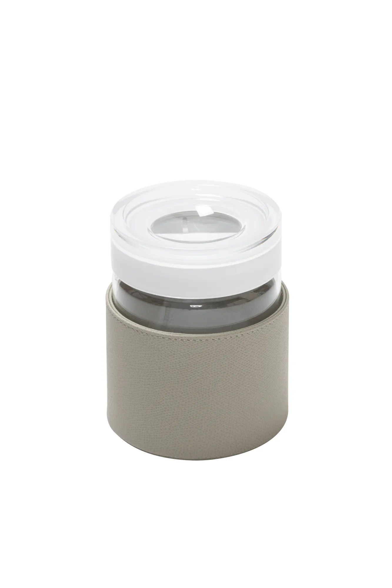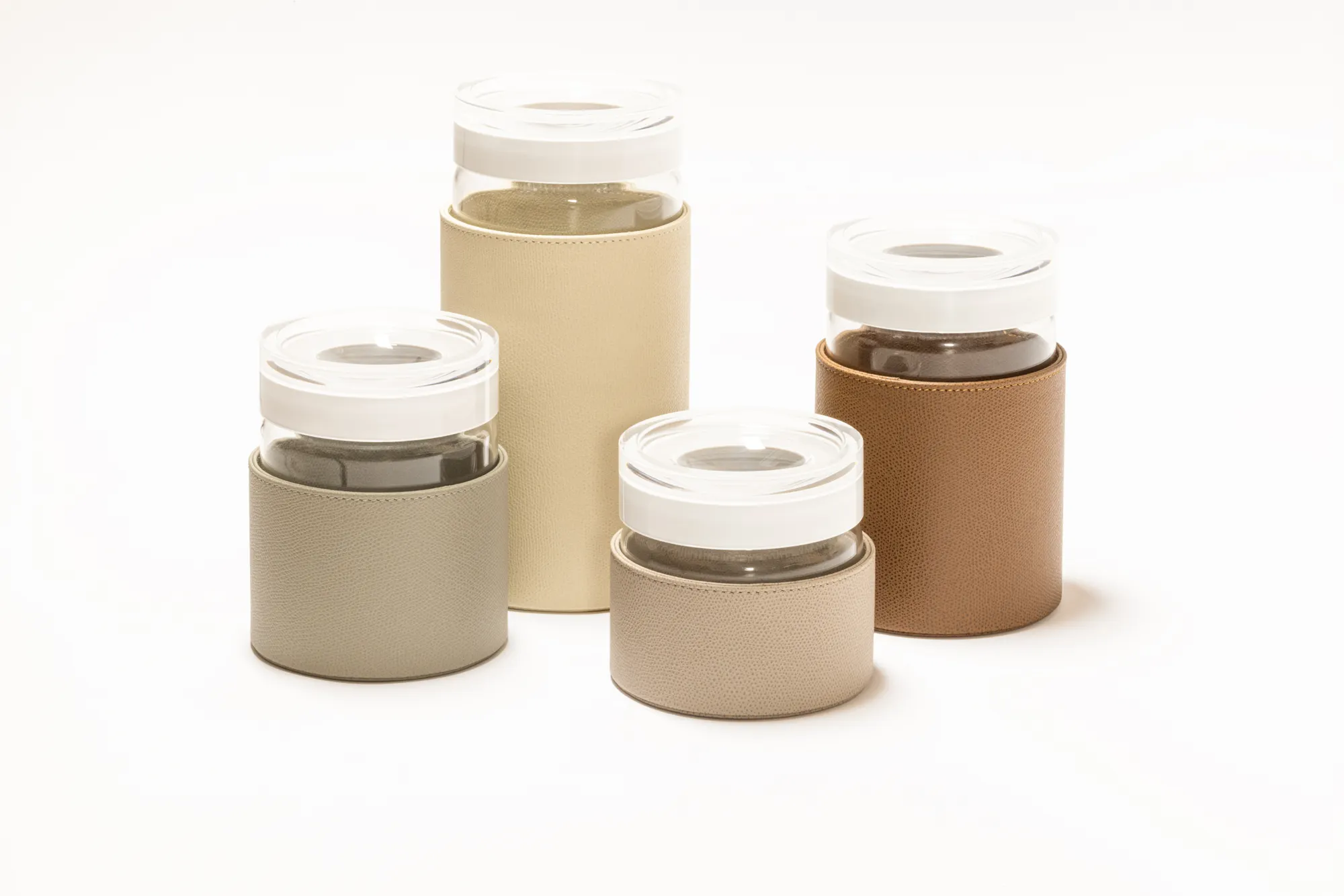 Leather-covered glass body provided with a two-tone plastic lid. It adapts perfectly to the most elegant kitchens.