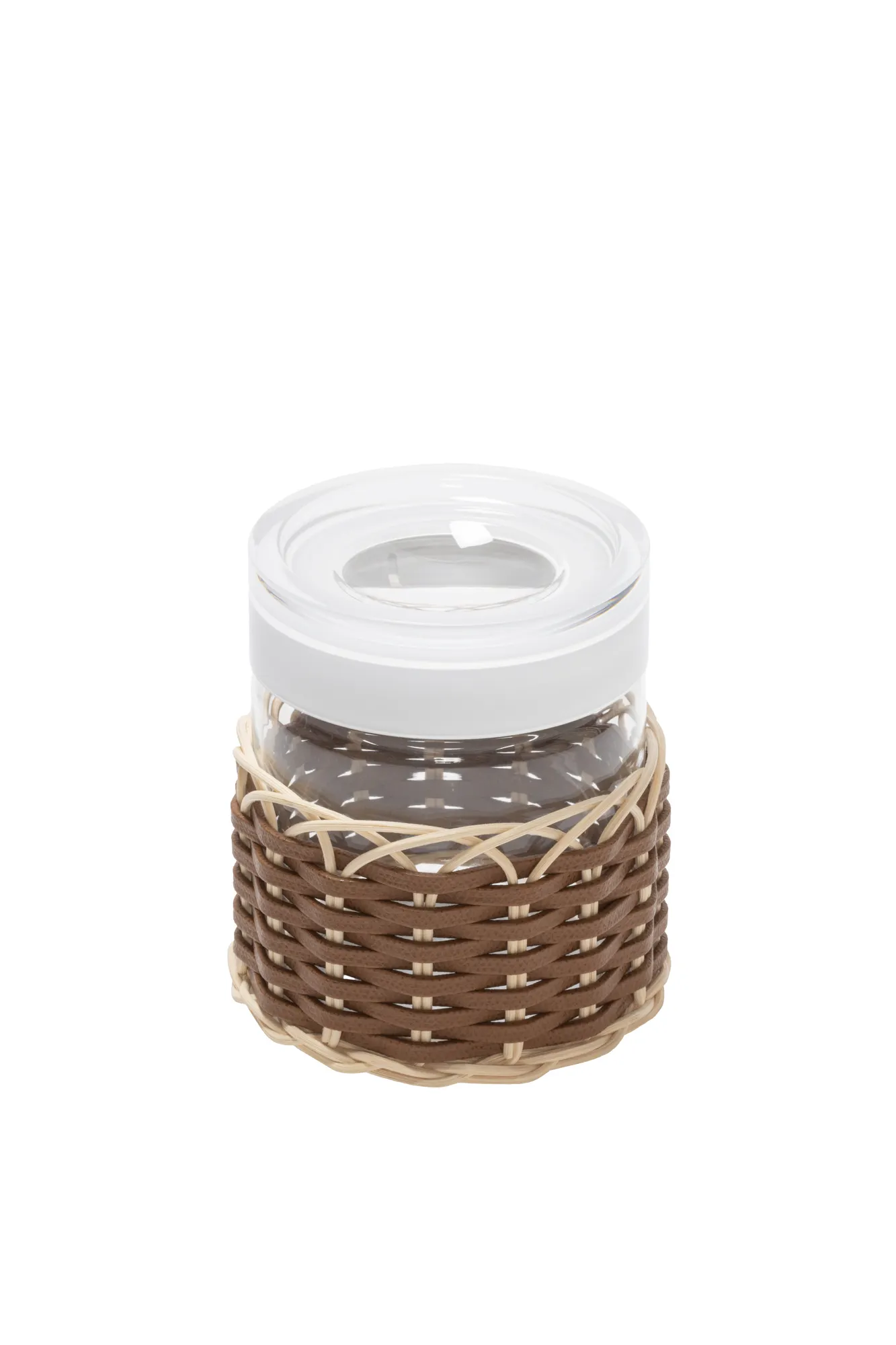 Glass body covered in woven leather and rattan provided with a two-tone plastic lid. It adapts perfectly to the most elegant kitchens.