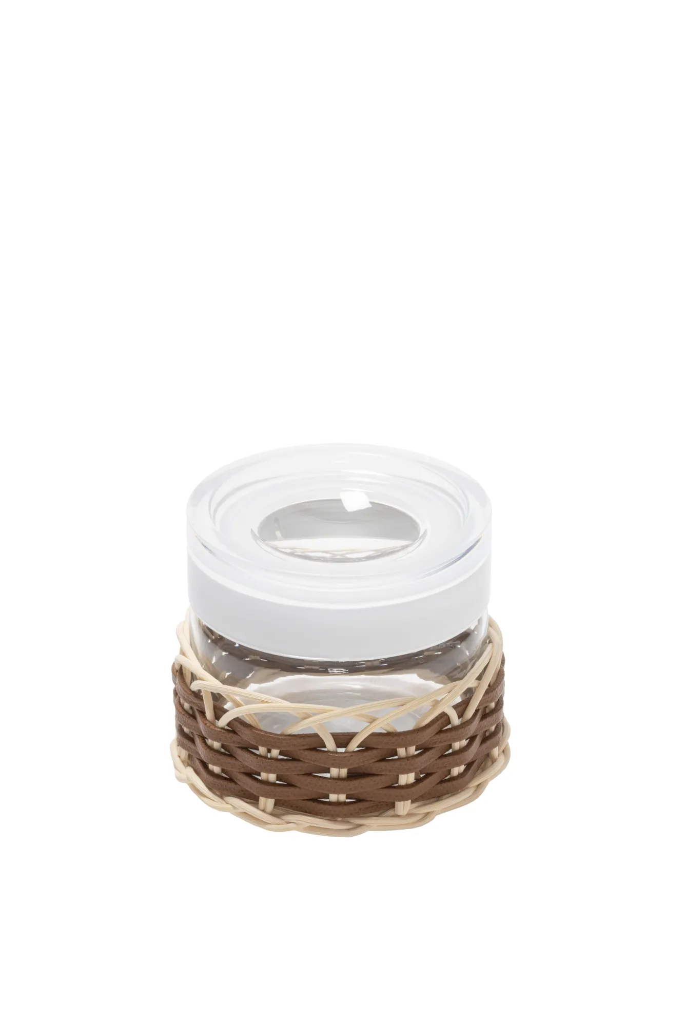 Glass body covered in woven leather and rattan provided with a two-tone plastic lid. It adapts perfectly to the most elegant kitchens.