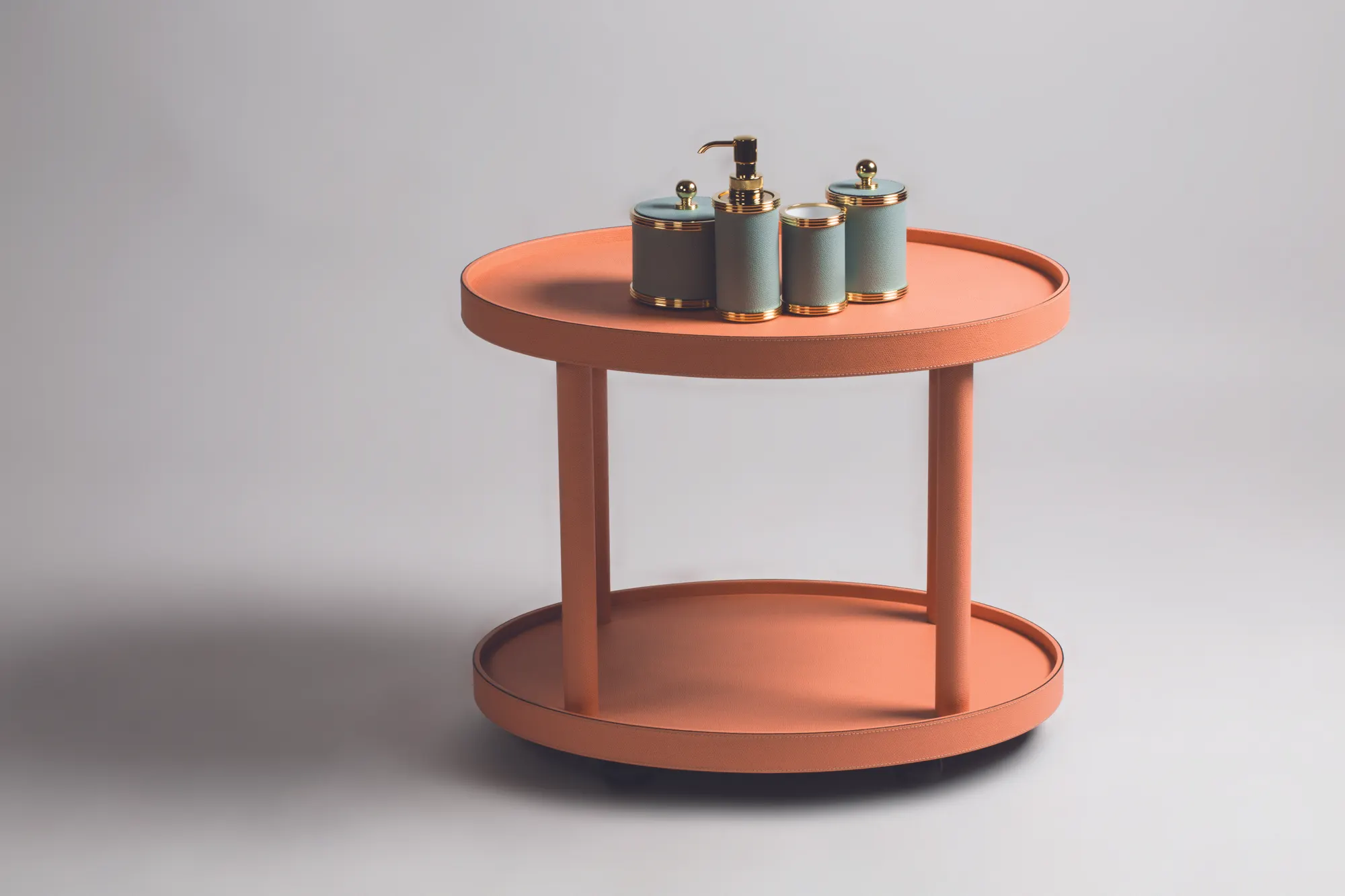Leather covered solid brass structure. Non-slip waterproof rubber base underneath. Metal finishes available: chrome / bronze / brass.