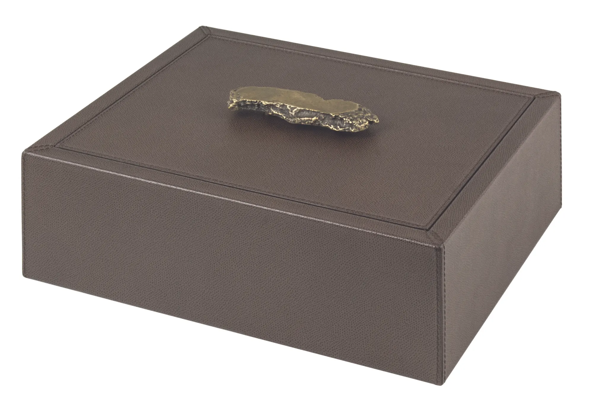 Leather covered wood base and handles with bronze finish. Cavity allows for simple stacking.