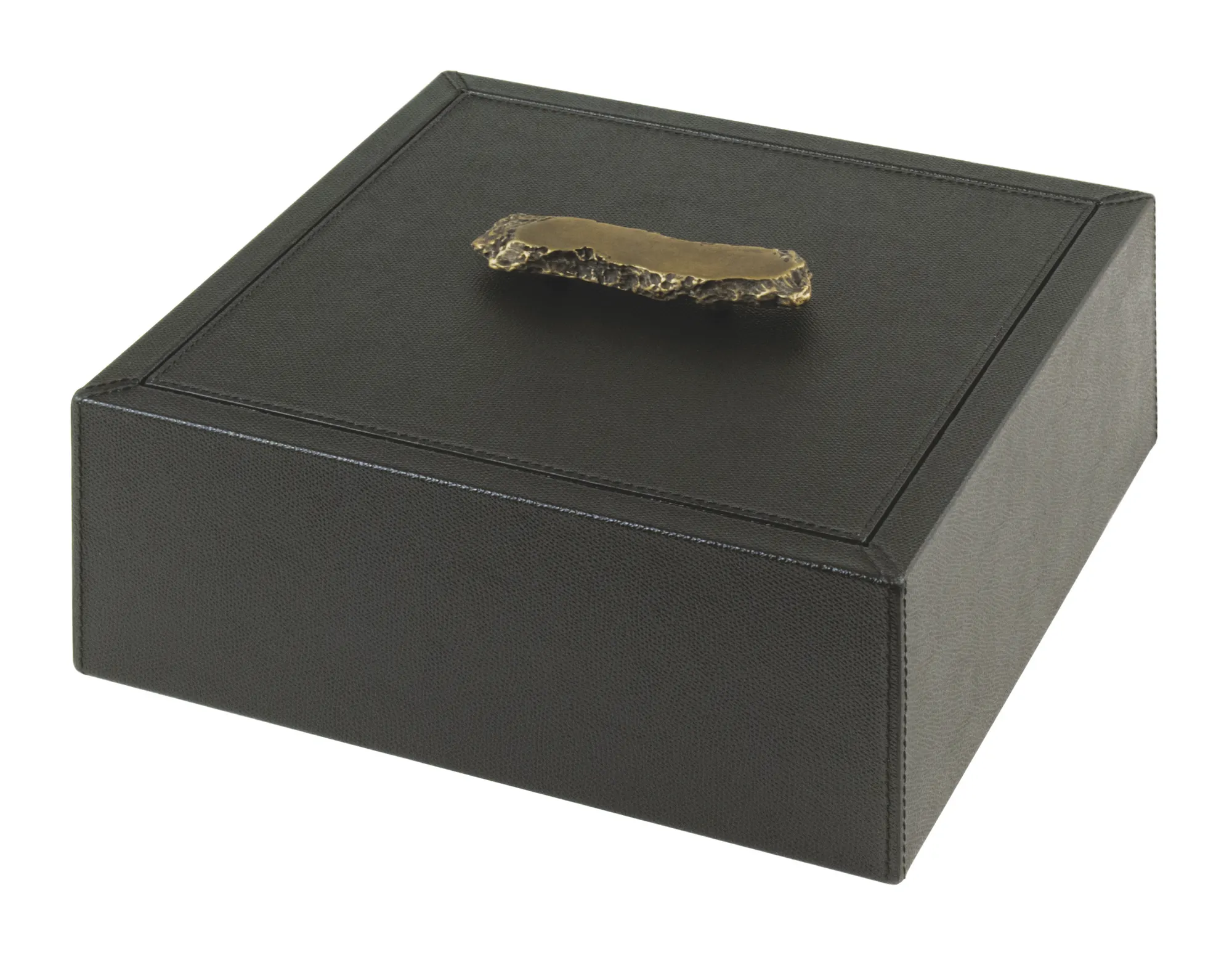 Leather covered wood base and handles with bronze finish. Cavity allows for simple stacking.