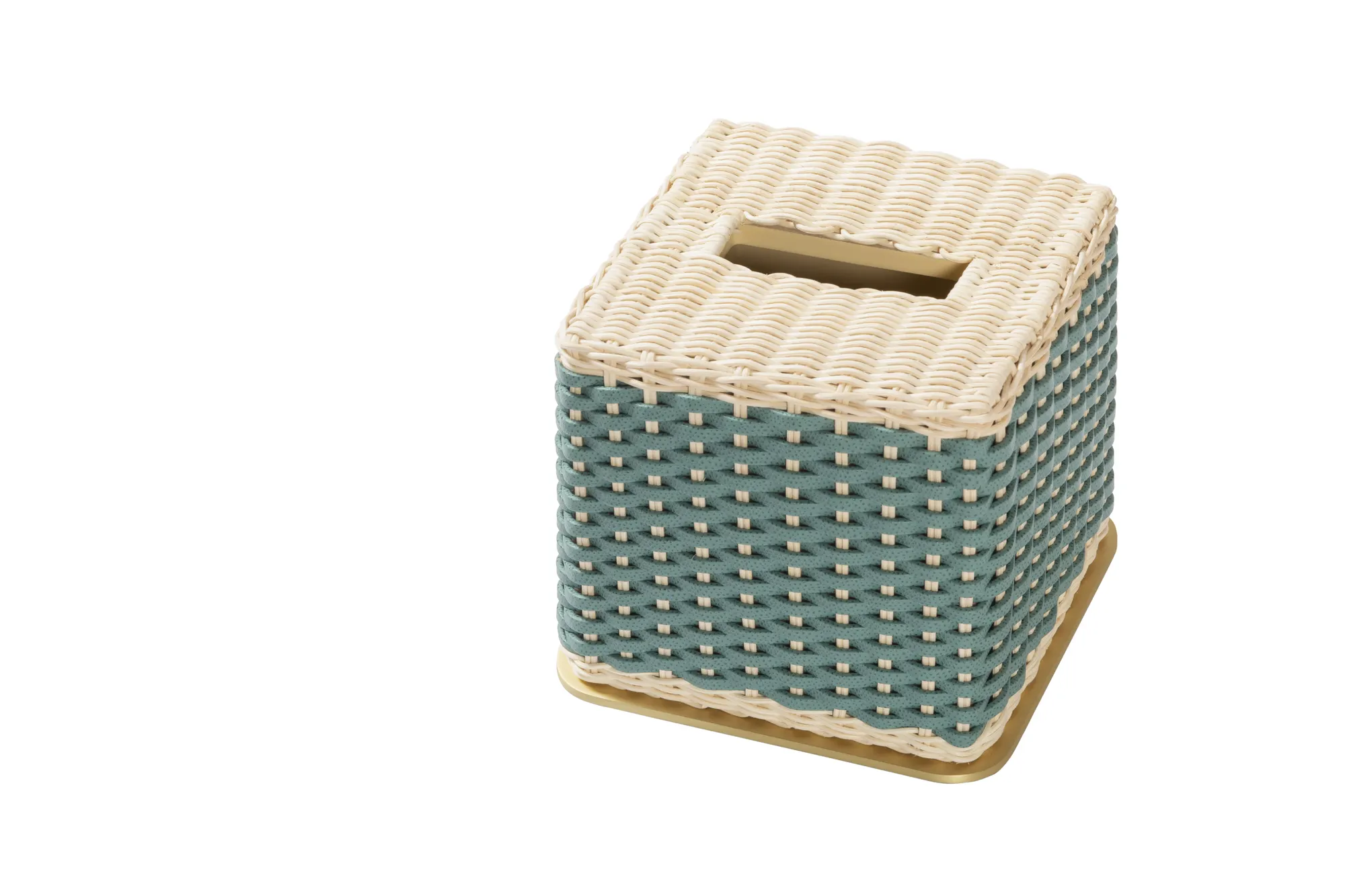 Wood structure covered in finely woven leather and rattan featuring a metal frame available in different finishes.