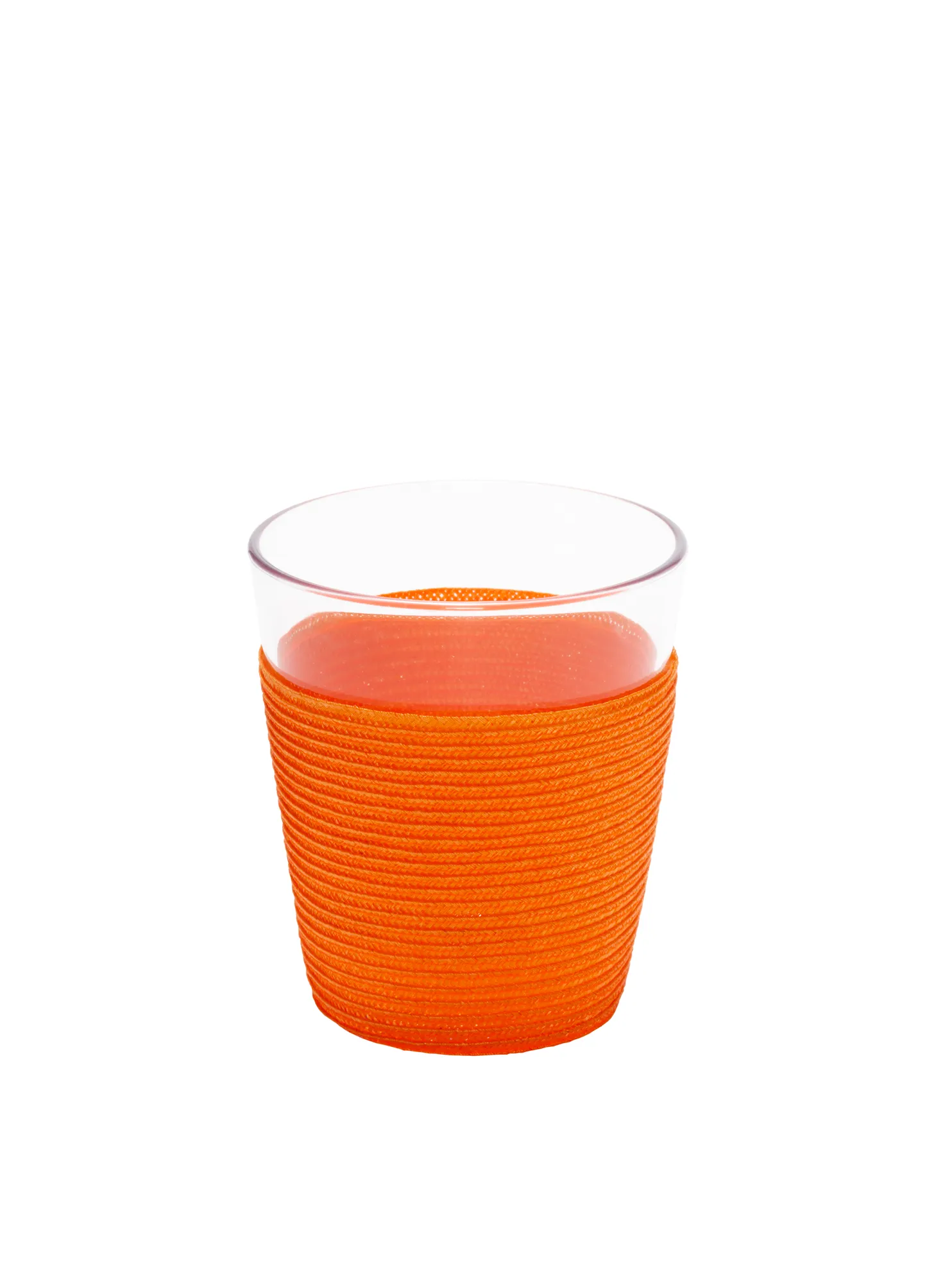 Transparent plastic glass partially dressed in Techstraw. The cover can be removed for an easy cleaning.