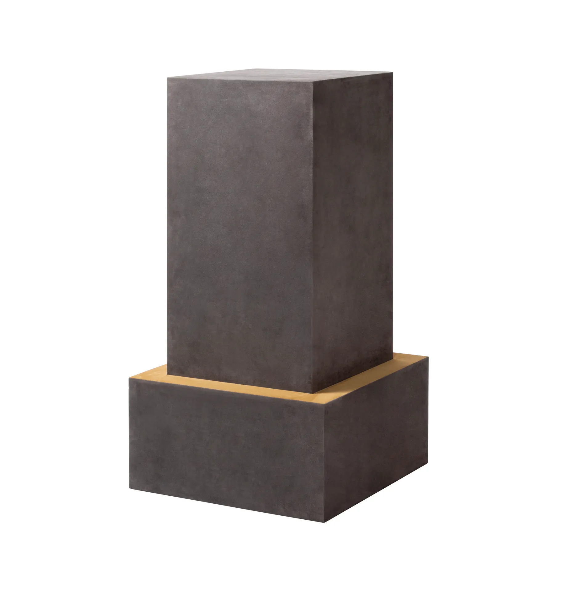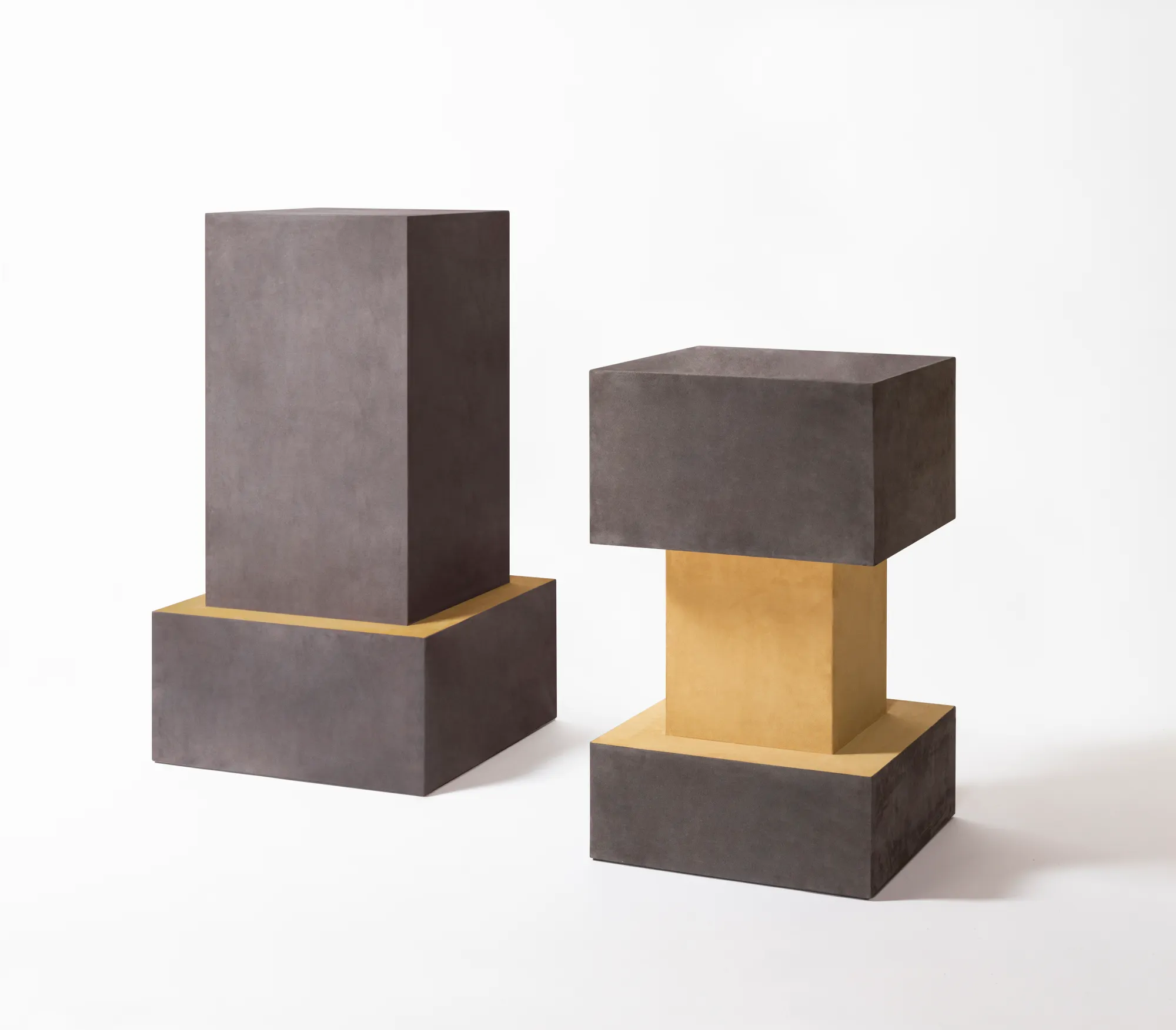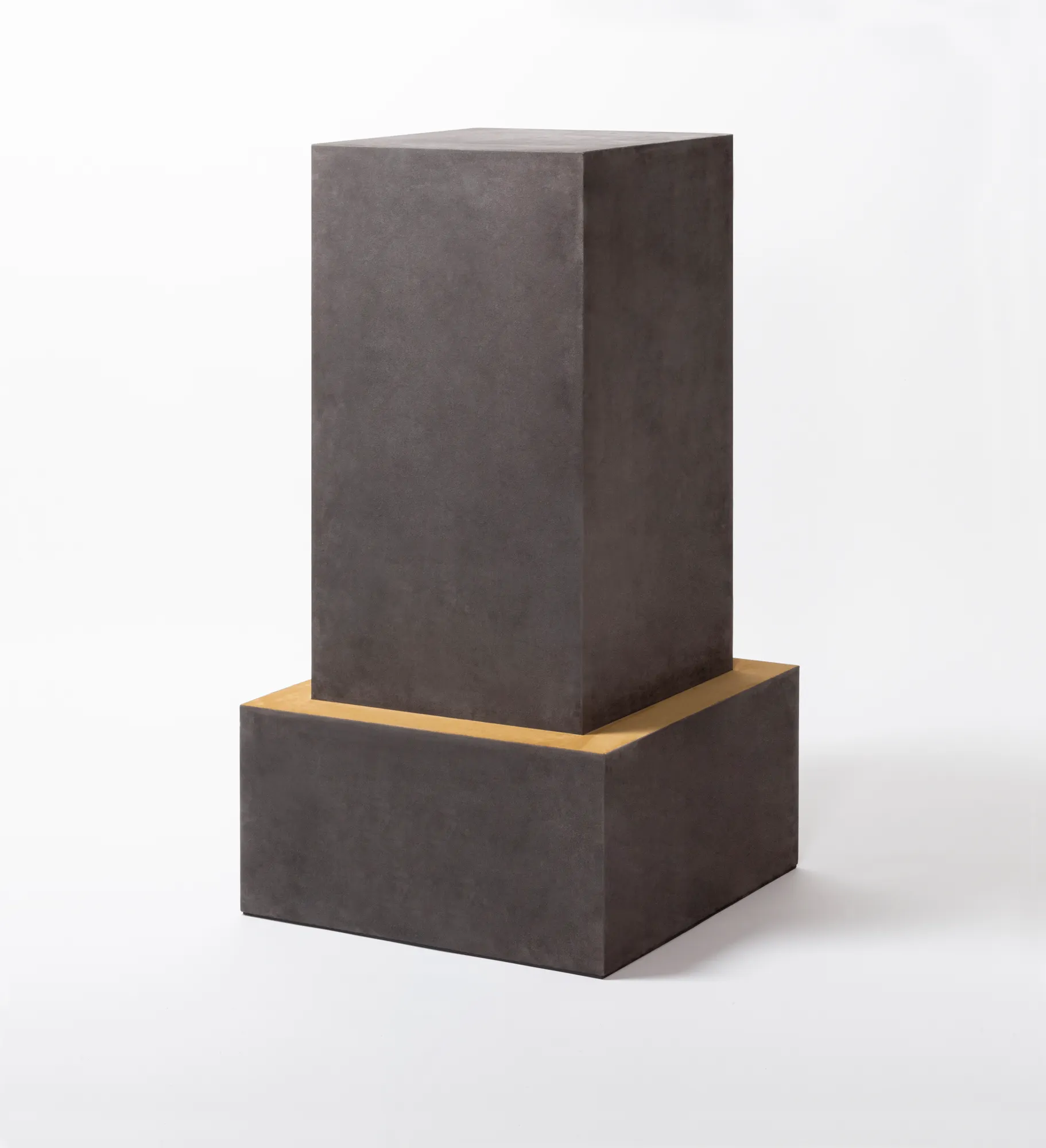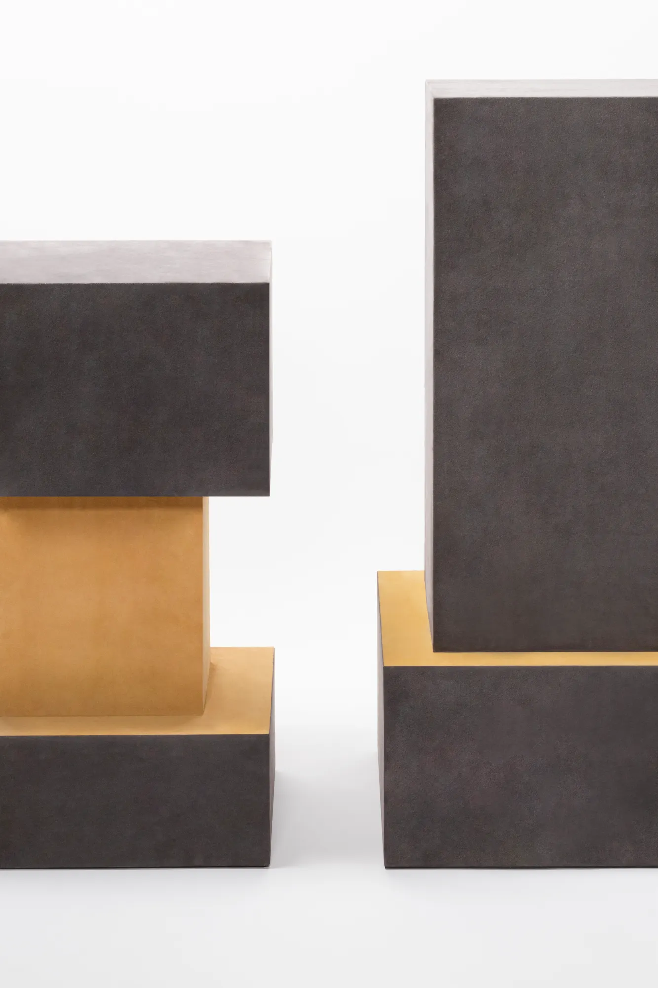 Leather-covered wood structure. The Ara plinths boast primal monolithic volumes with rigorously geometric lines which make them able to enhance anything on display and to be solid statement pieces themselves. Design by Simone Fanciullacci. Available only in suede. Other finishes can be chosen on request.