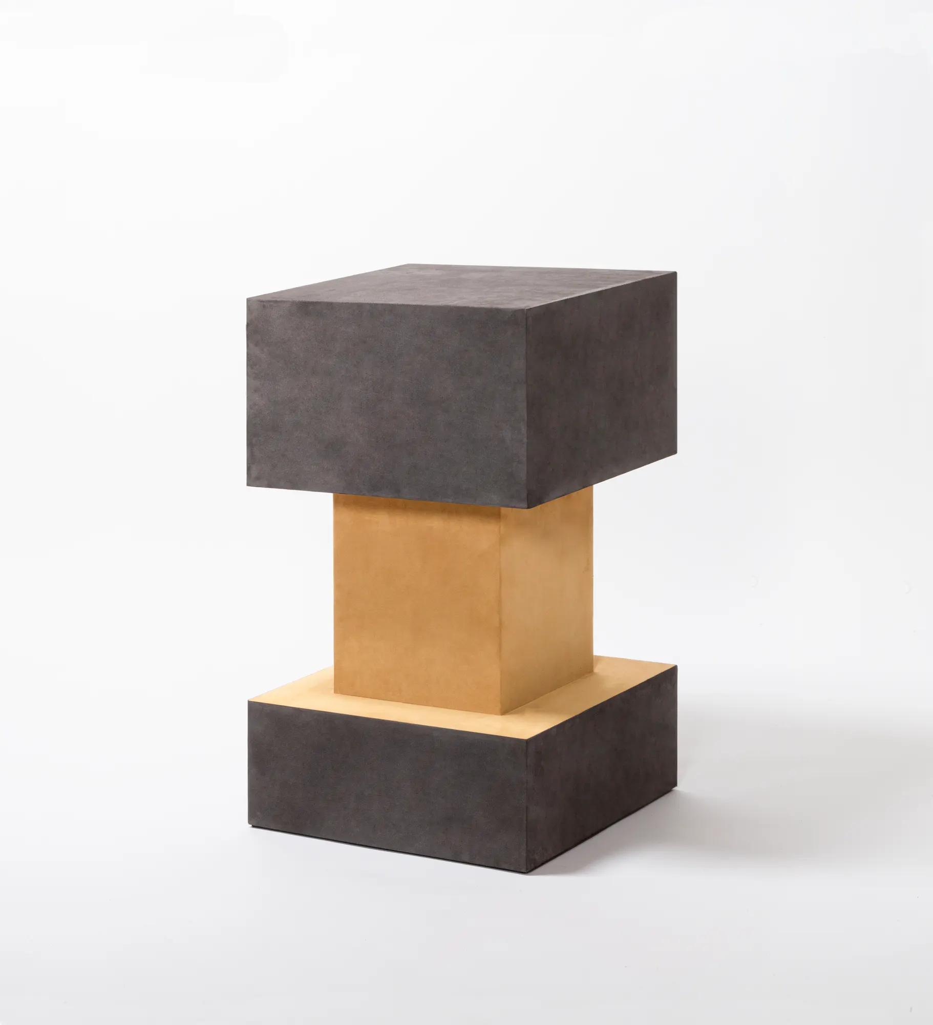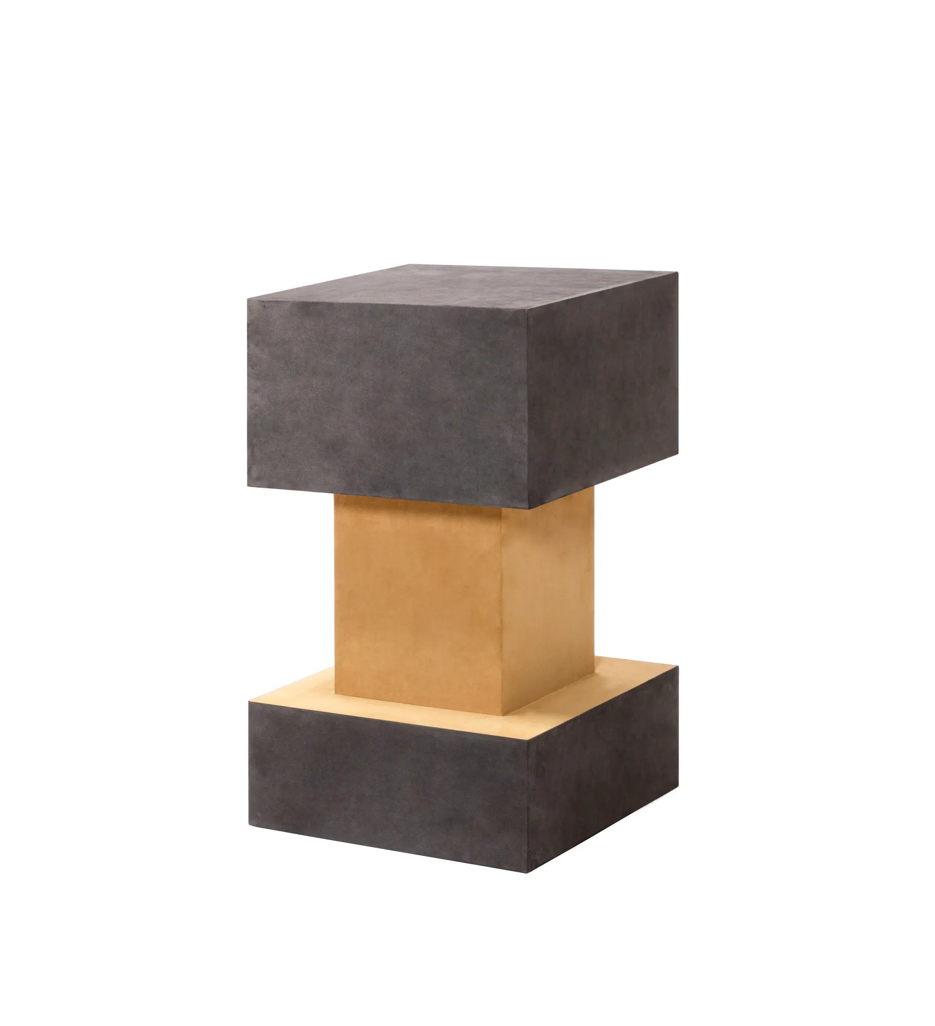 Leather-covered wood structure. The Ara plinths boast primal monolithic volumes with rigorously geometric lines which make them able to enhance anything on display and to be solid statement pieces themselves. Design by Simone Fanciullacci. Available only in suede. Other finishes can be chosen on request.