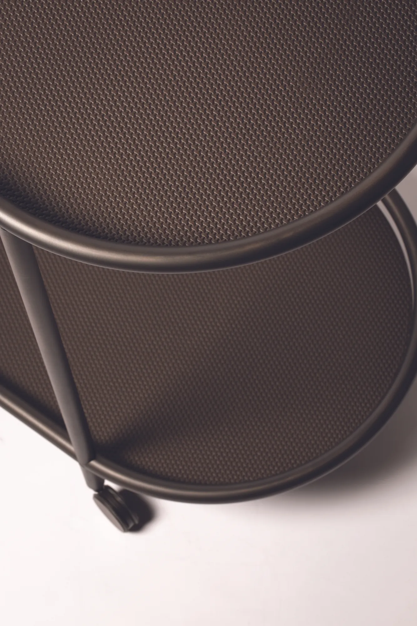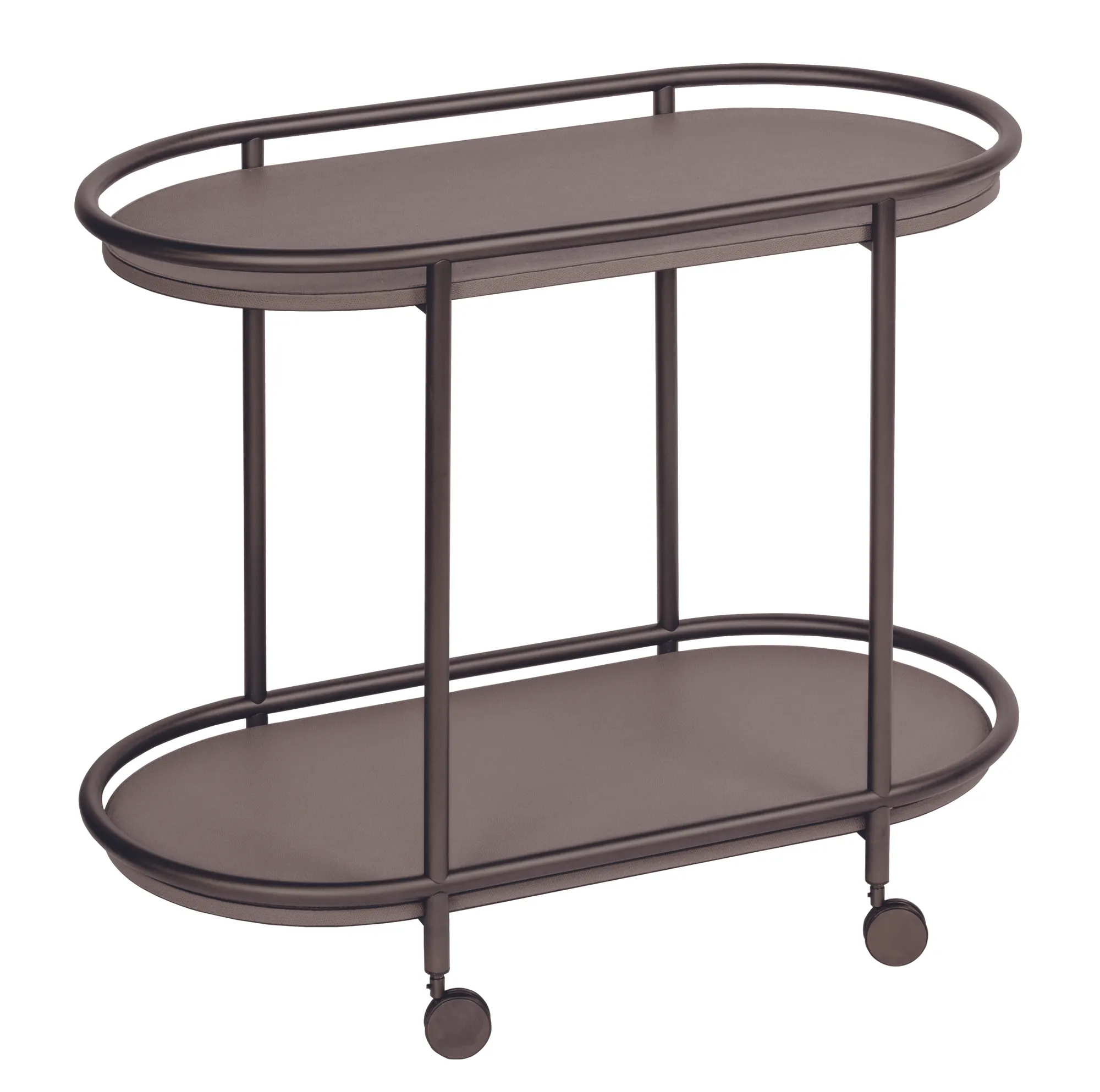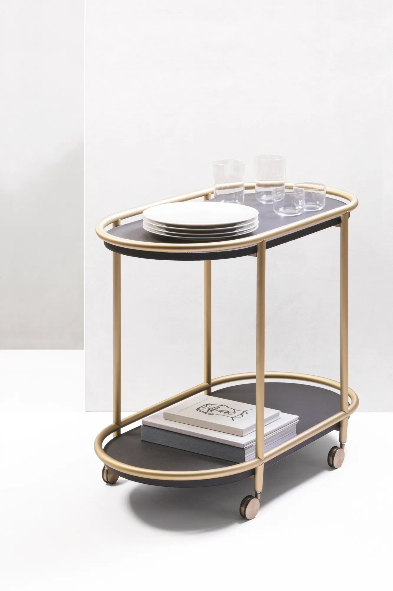 Leather covered four-wheel wood structure. Brass structure and wheels available in three finishes.