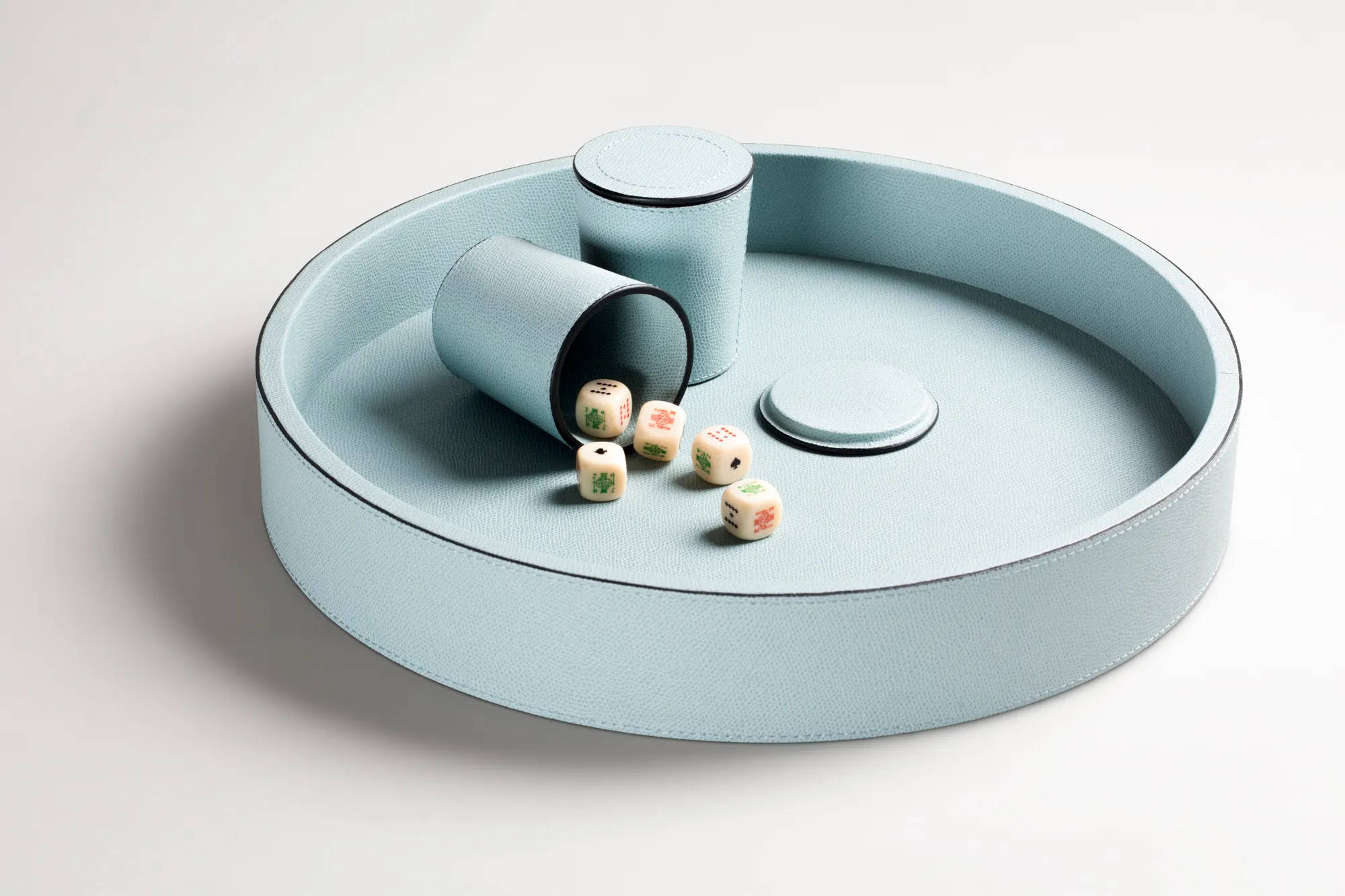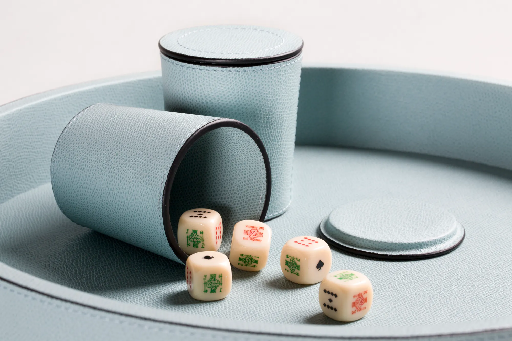Leather covered wood dice tray sold with 2 leather dice cups. Comes with 5 standard dice and 5 poker dice.