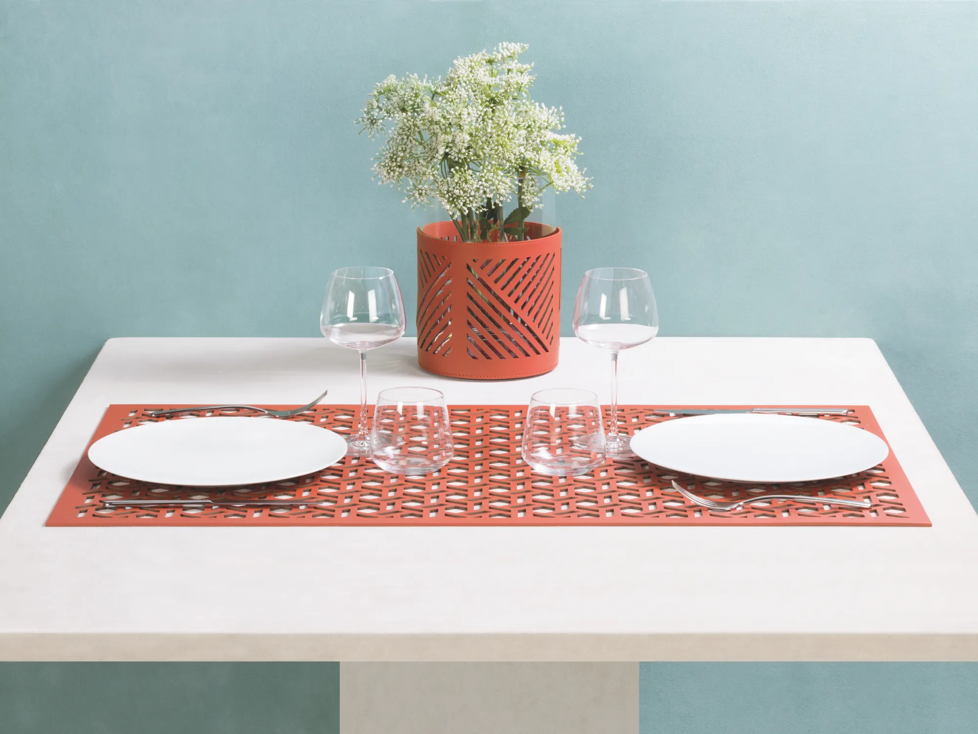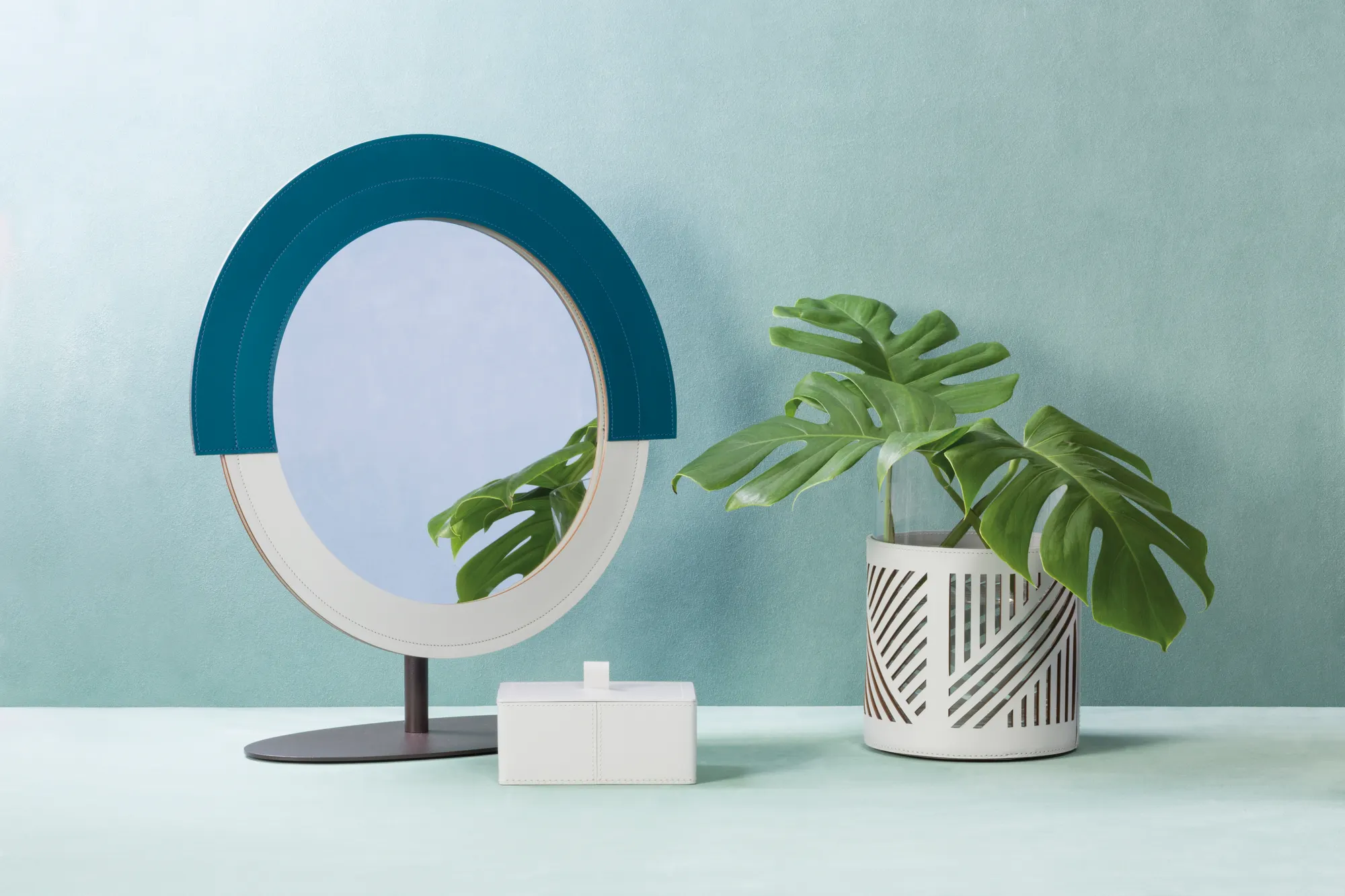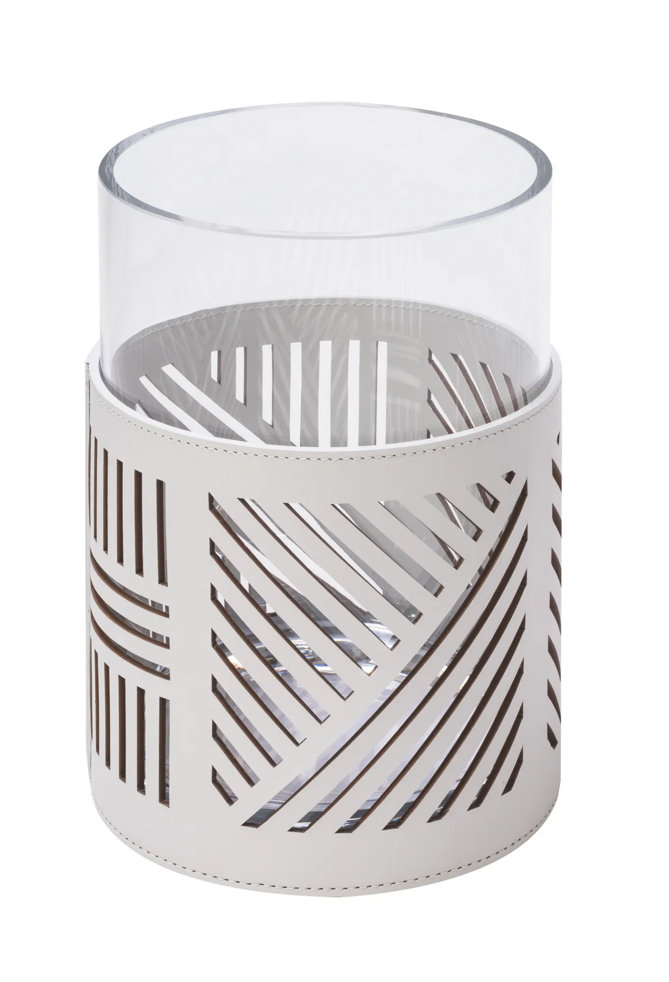 Transparent borosilicate glass partially dressed in finest regenerated leather with water-resistant and UV-resistant finish. The glass is removable for easy cleaning.