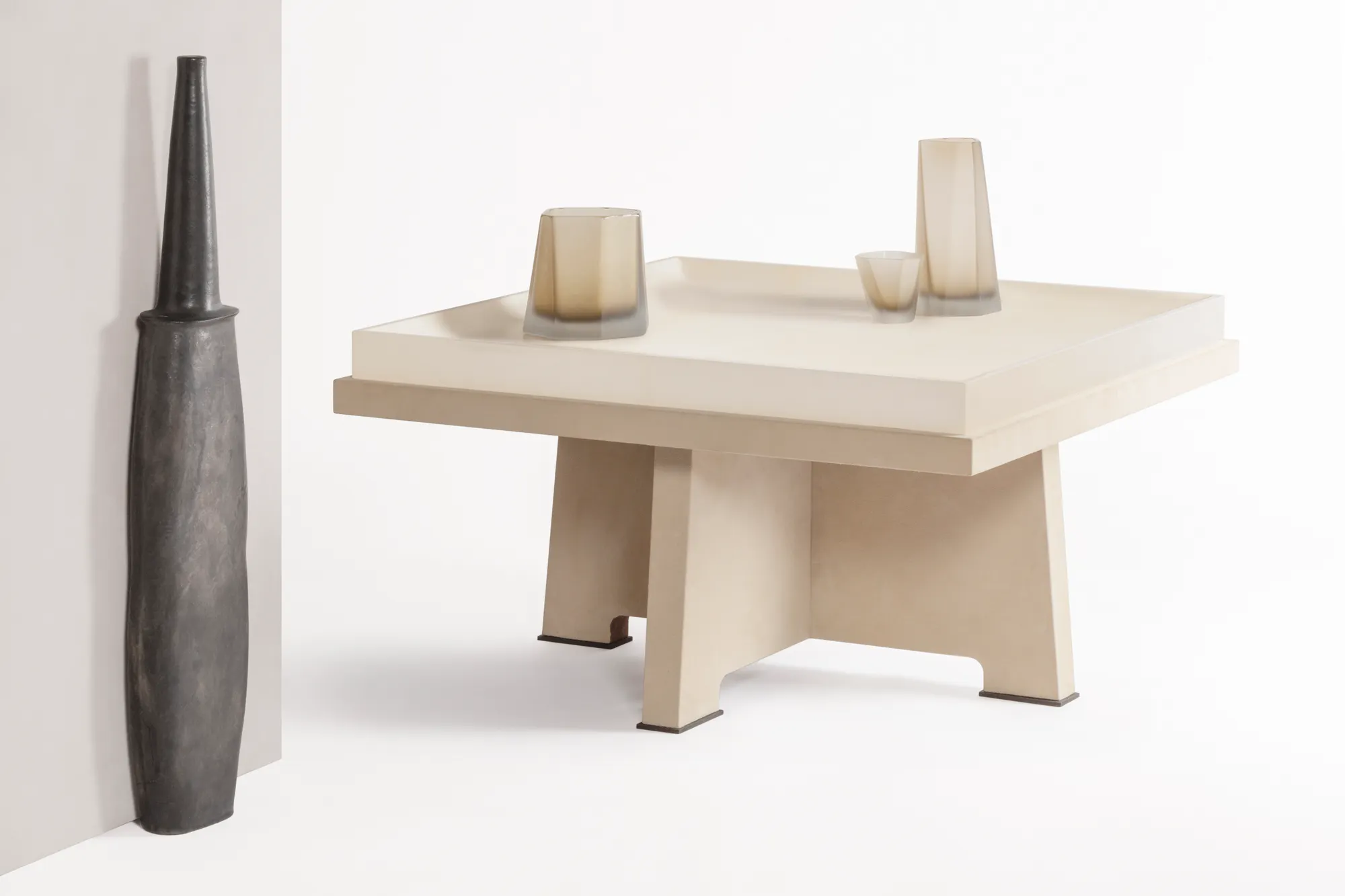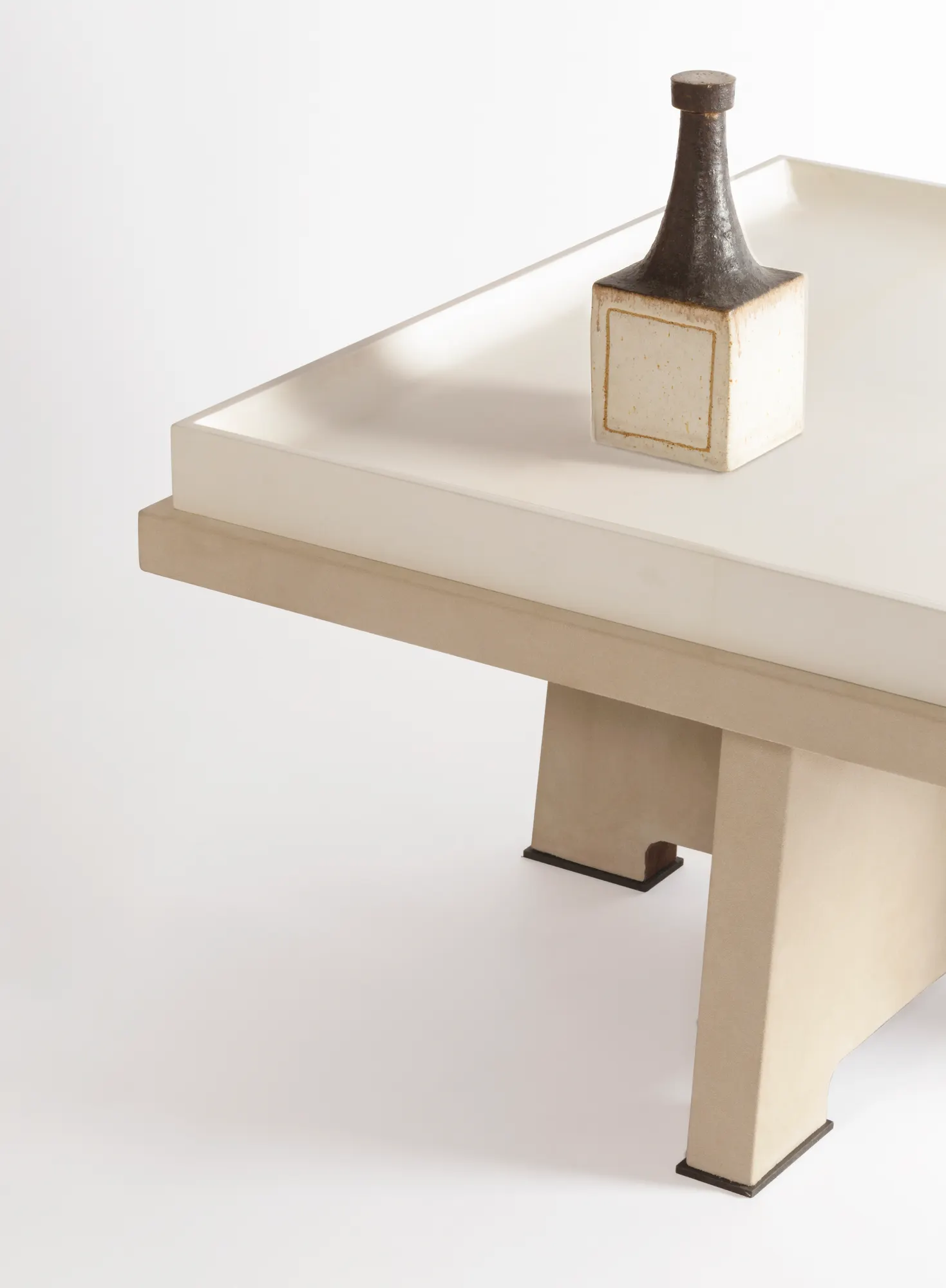 The charming strength of the Attica collection is due to the combination of the highly geometric aesthetics with velvety leathers, appealing textured parchment and unique wood grains. Each Attica piece is an inimitable creation where materials, edges and curves play a calm symphony of symmetry and balance. Available with top in parchment or in leather. Leather-covered wood base + bronze decorative feet.