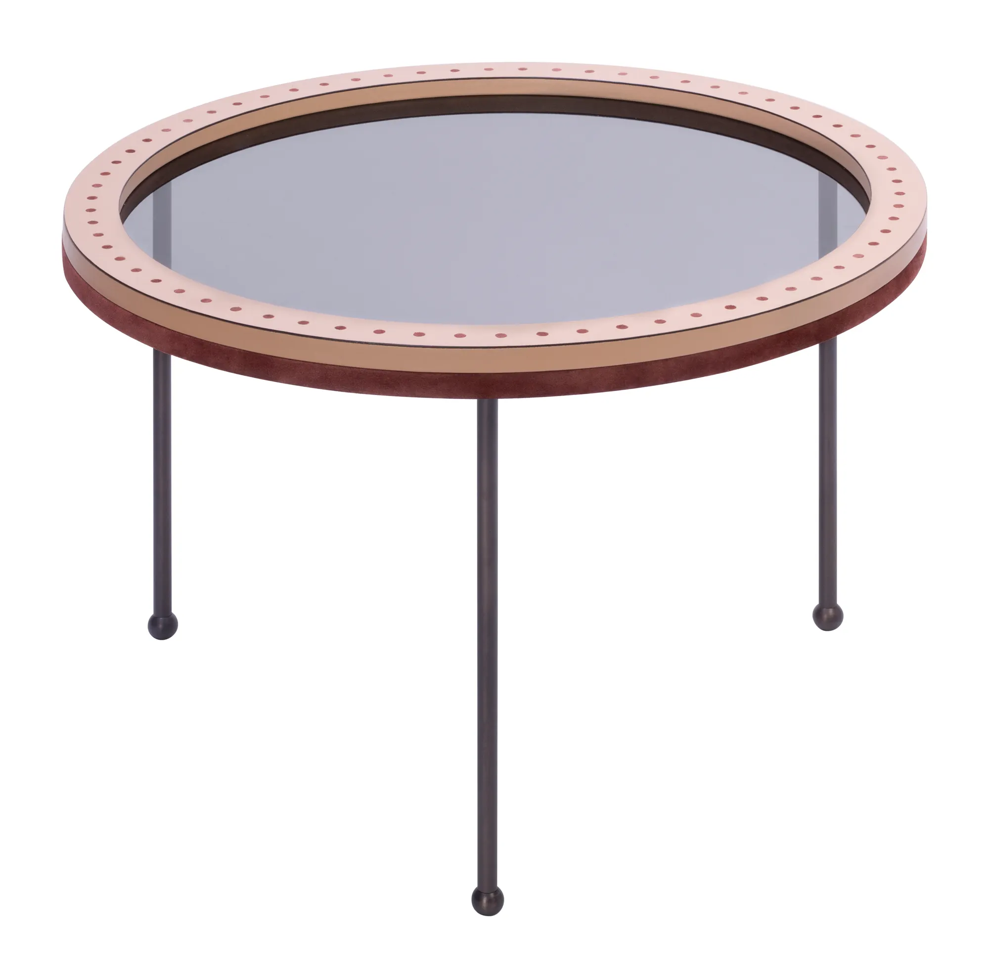 A collection of round nesting tables charactized by bronze legs and smoked glass surfaces, circled by a thick leather edge in a reference to portholes of the greatest Italian ocean liner designs of the 1950s. It features a subtle leather inlay that accentuates its nautical appearance and adds a touch of understated opulence.
