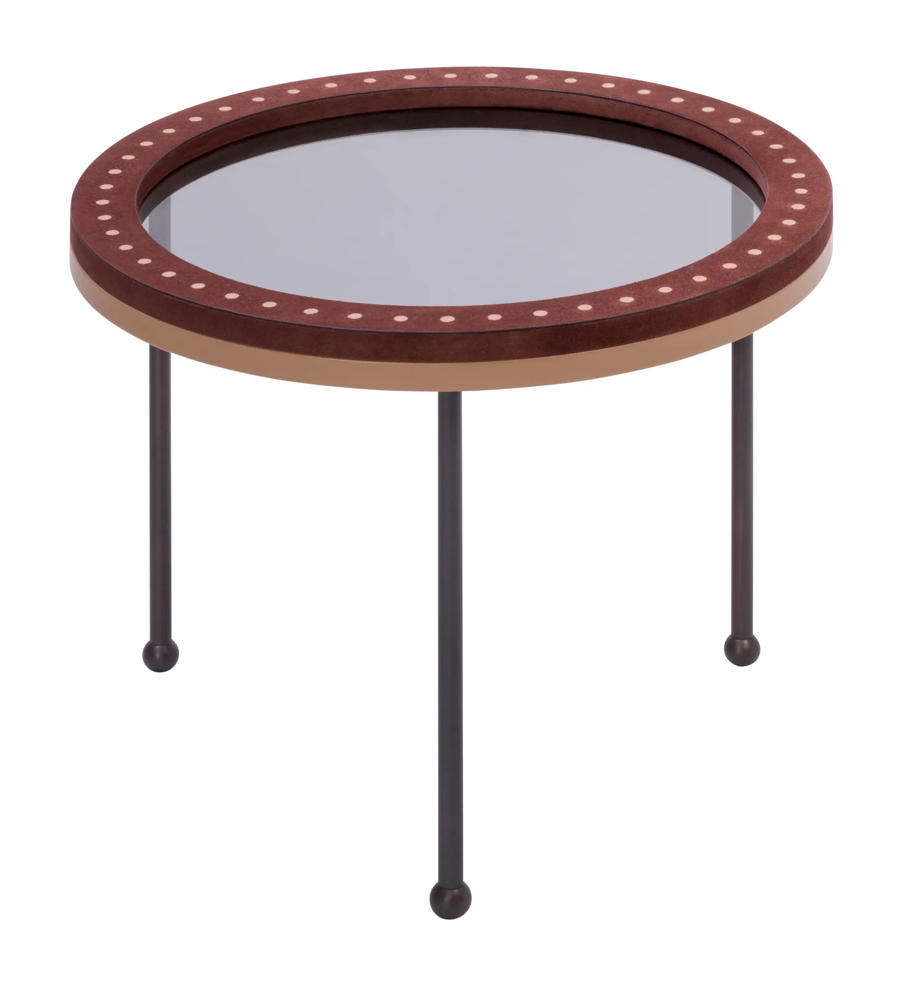 A collection of round nesting tables charactized by bronze legs and smoked glass surfaces, circled by a thick leather edge in a reference to portholes of the greatest Italian ocean liner designs of the 1950s. It features a subtle leather inlay that accentuates its nautical appearance and adds a touch of understated opulence.