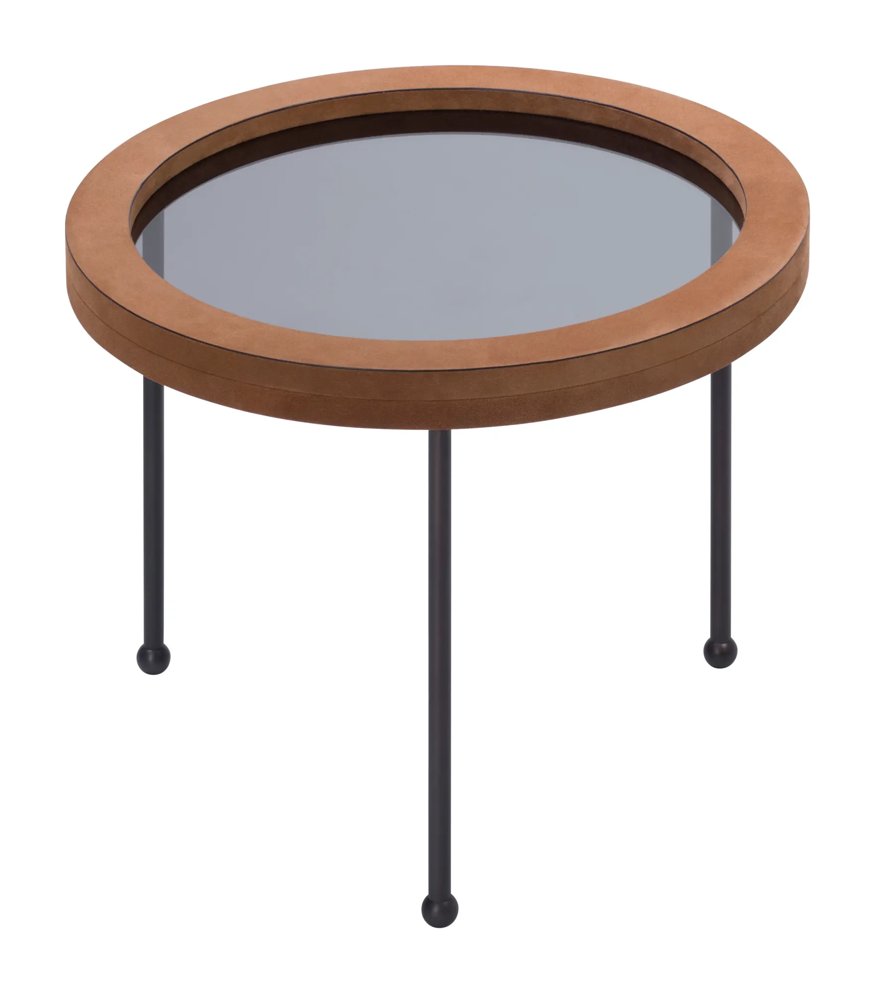 A collection of round nesting tables charactized by bronze legs and smoked glass surfaces, circled by a thick leather edge in a reference to portholes of the greatest Italian ocean liner designs of the 1950s.