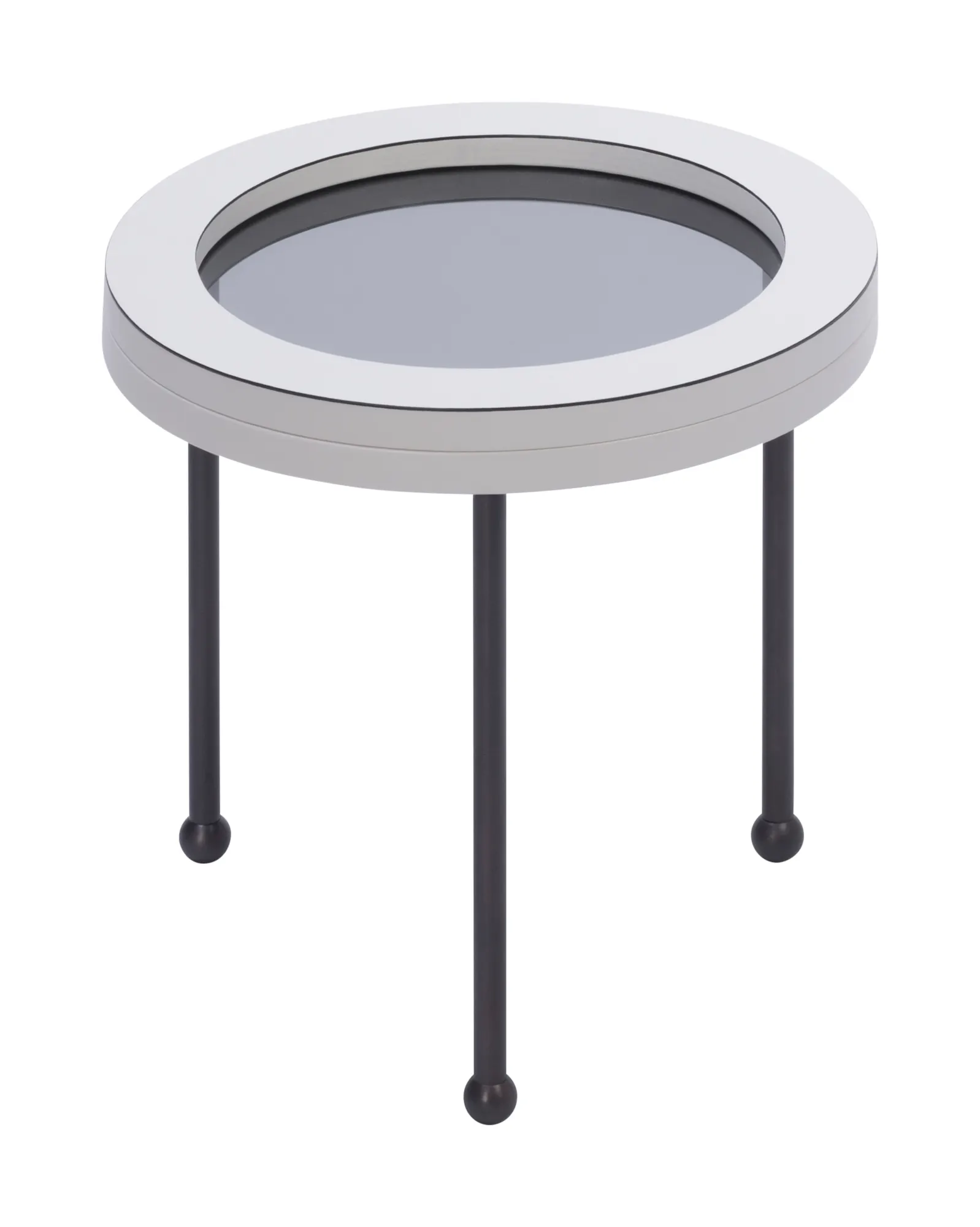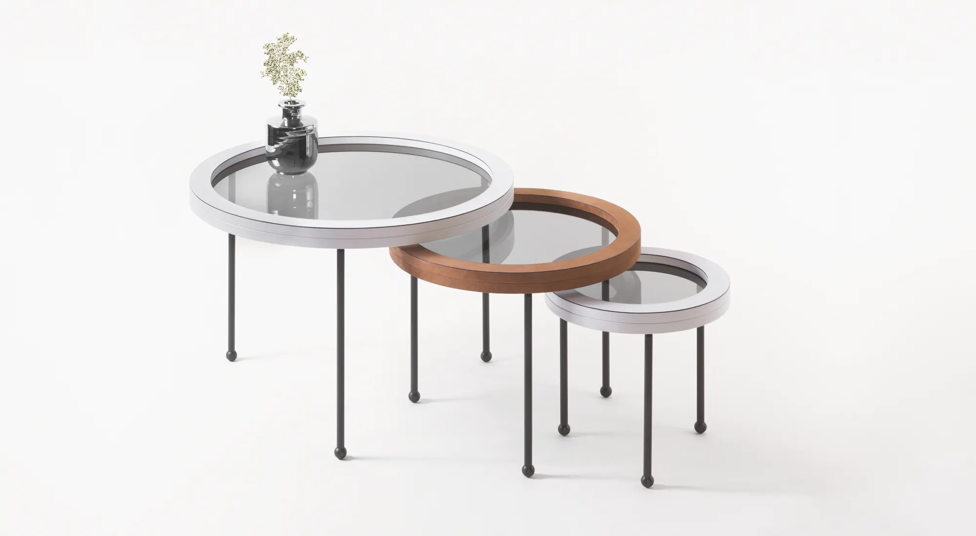 A collection of round nesting tables charactized by bronze legs and smoked glass surfaces, circled by a thick leather edge in a reference to portholes of the greatest Italian ocean liner designs of the 1950s.
