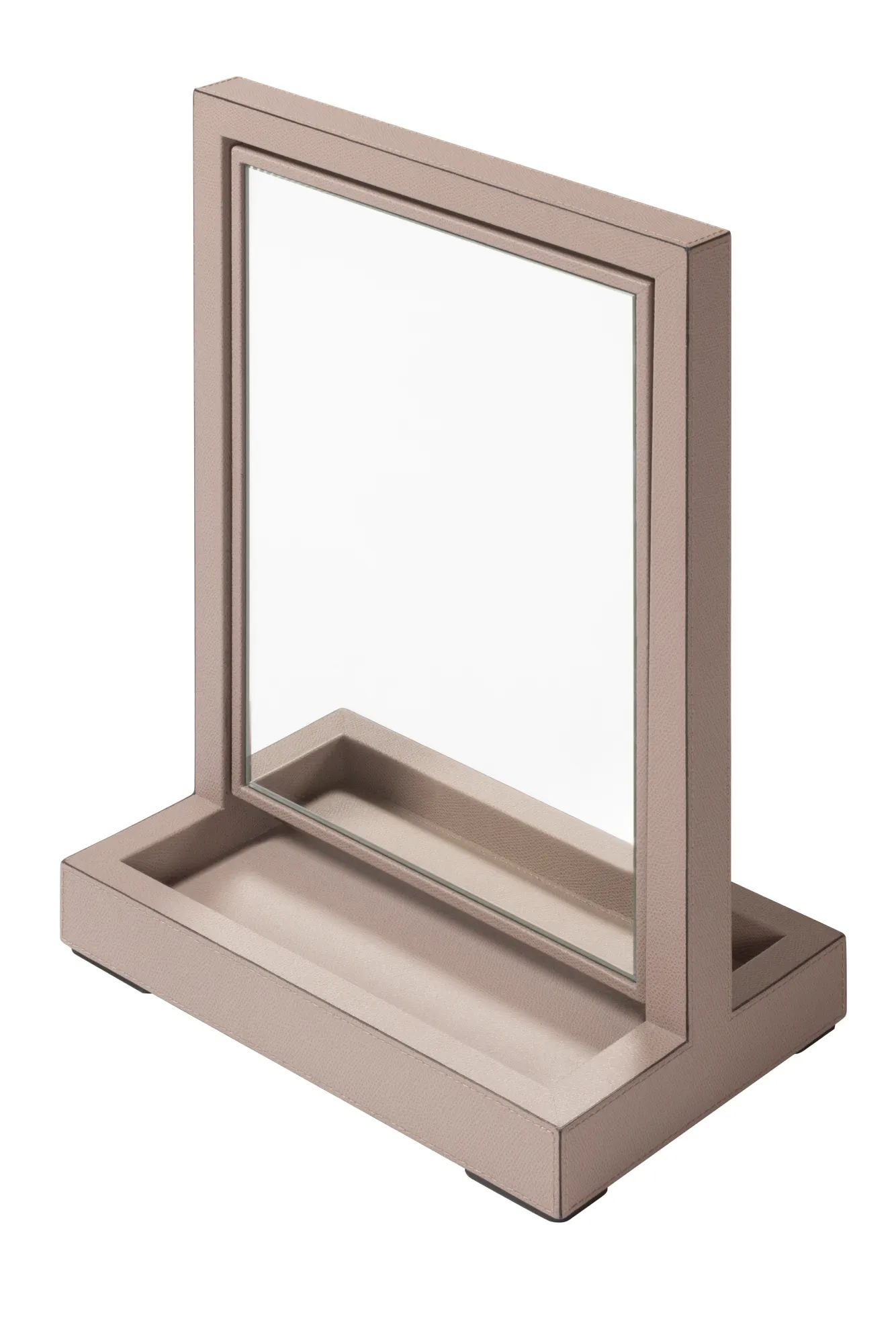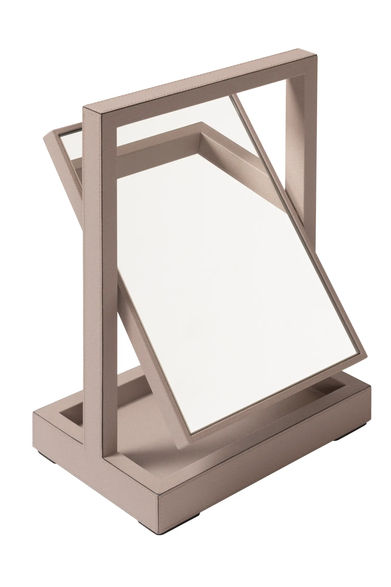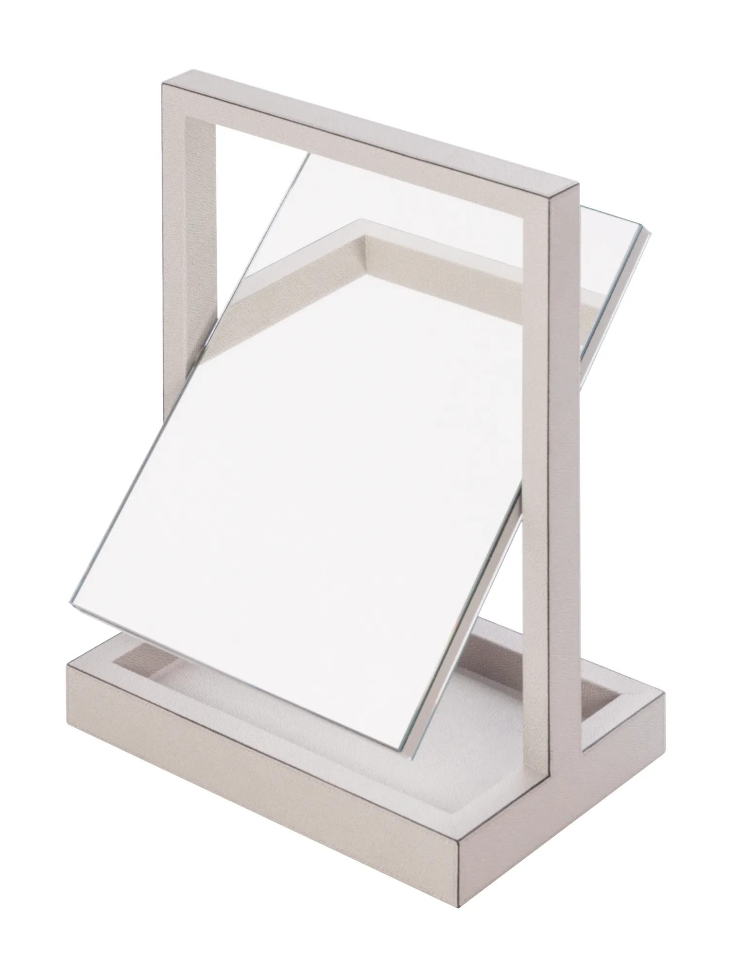 Leather covered wood base fixed on a metal plinth and metal mirror-holding structure. The mirror rotates for a choice of magnification or standard reflection. Includes a valet tray and features a heavy base that ensures stability.