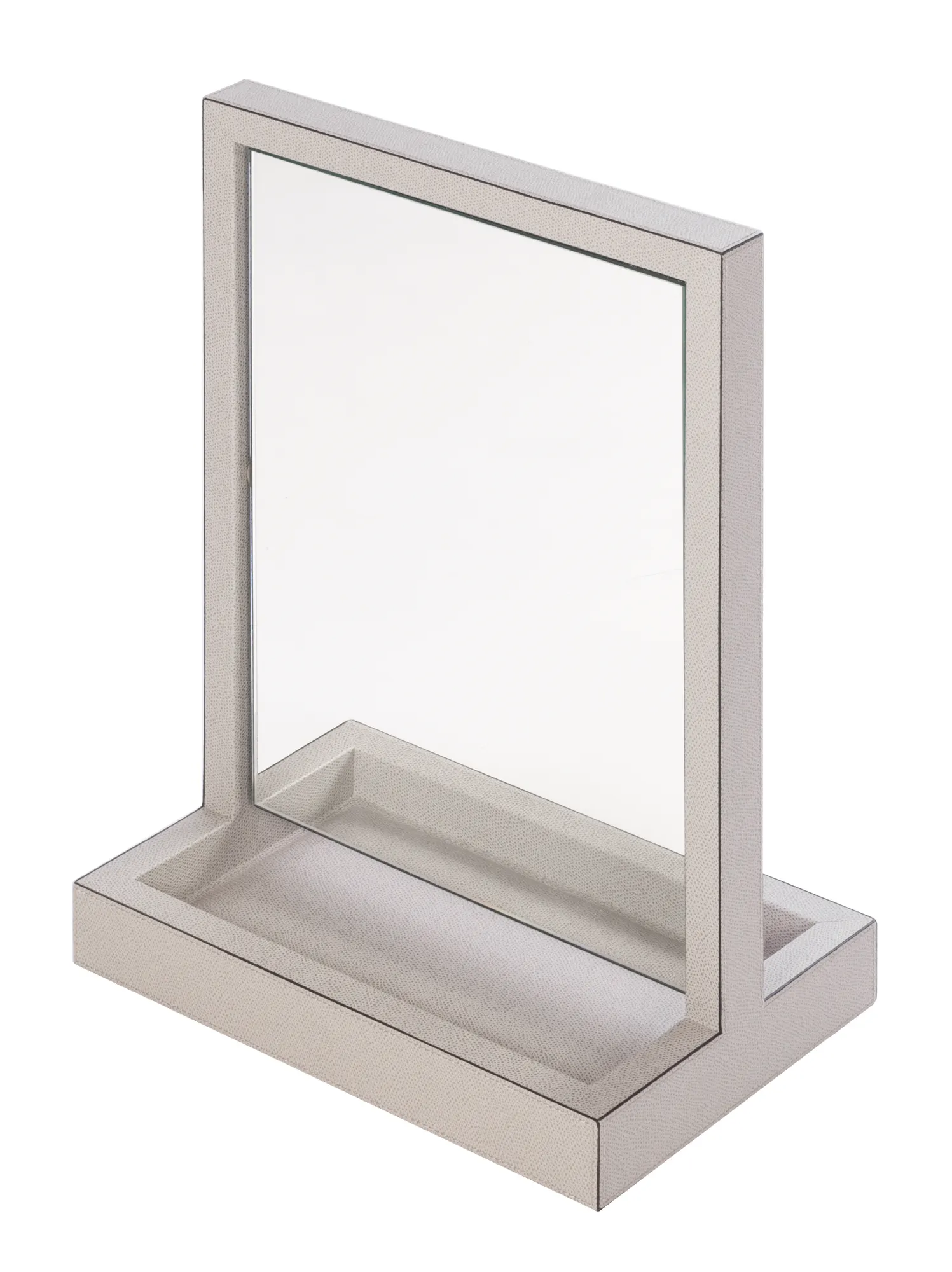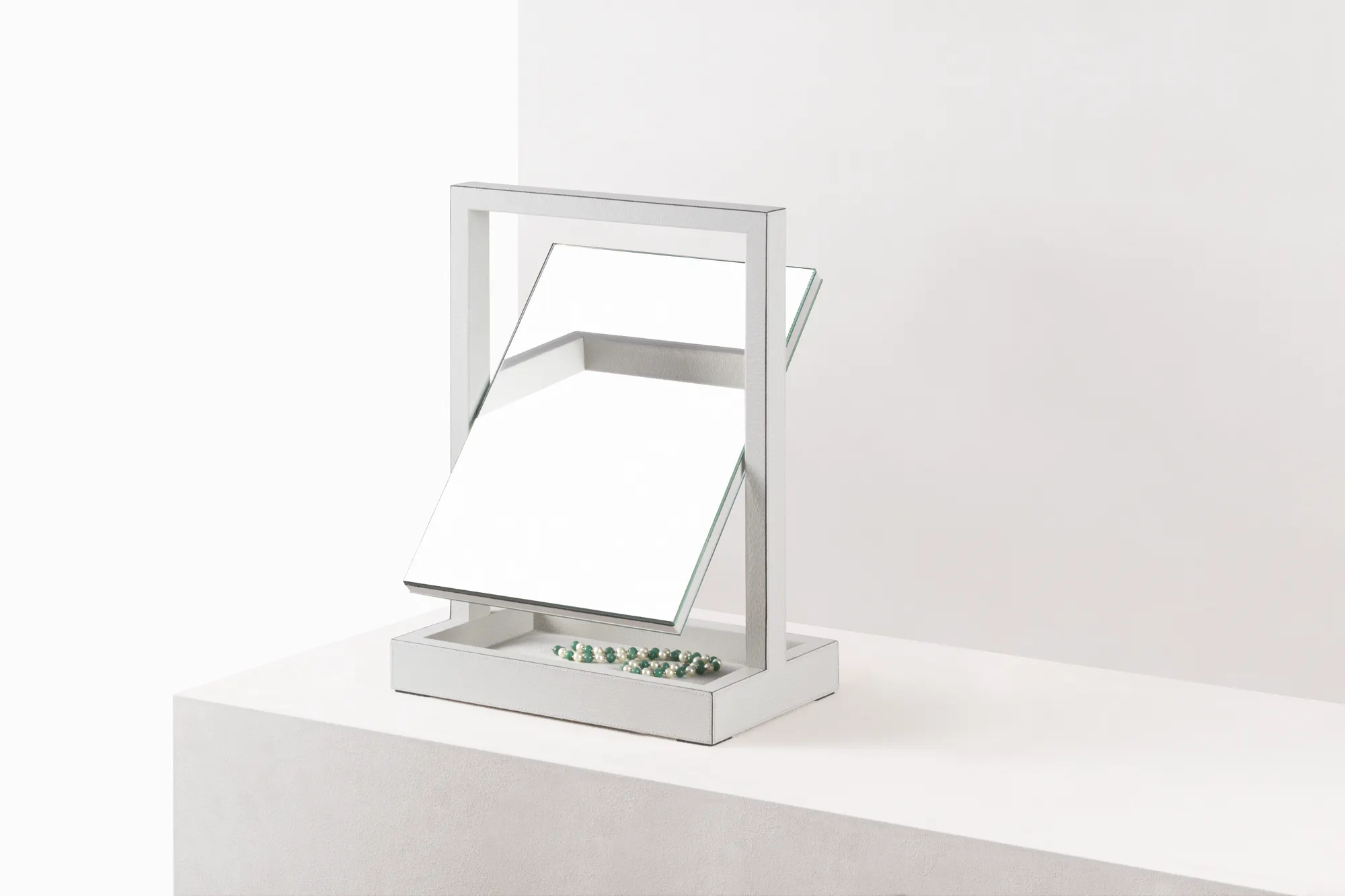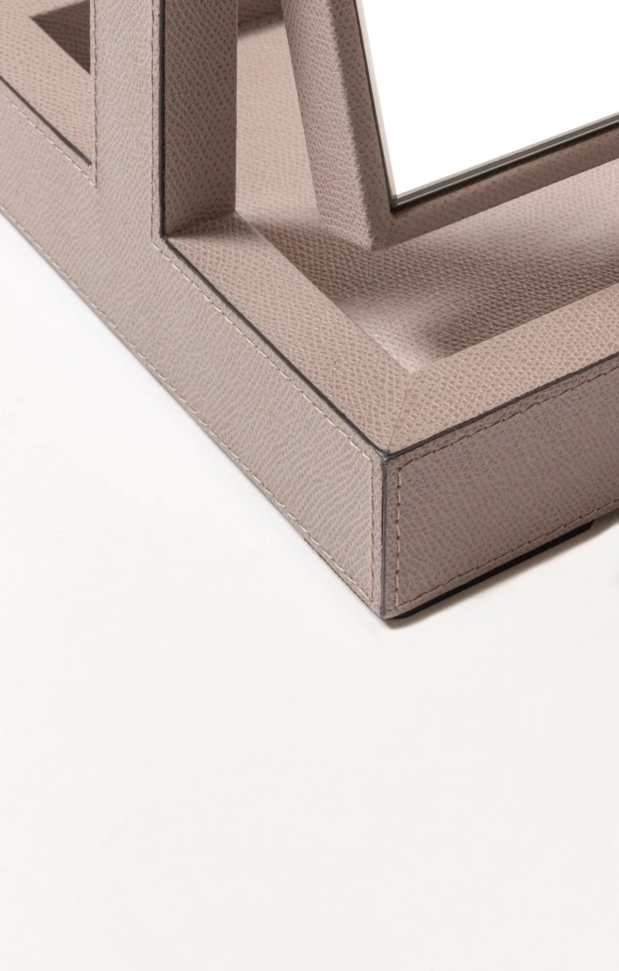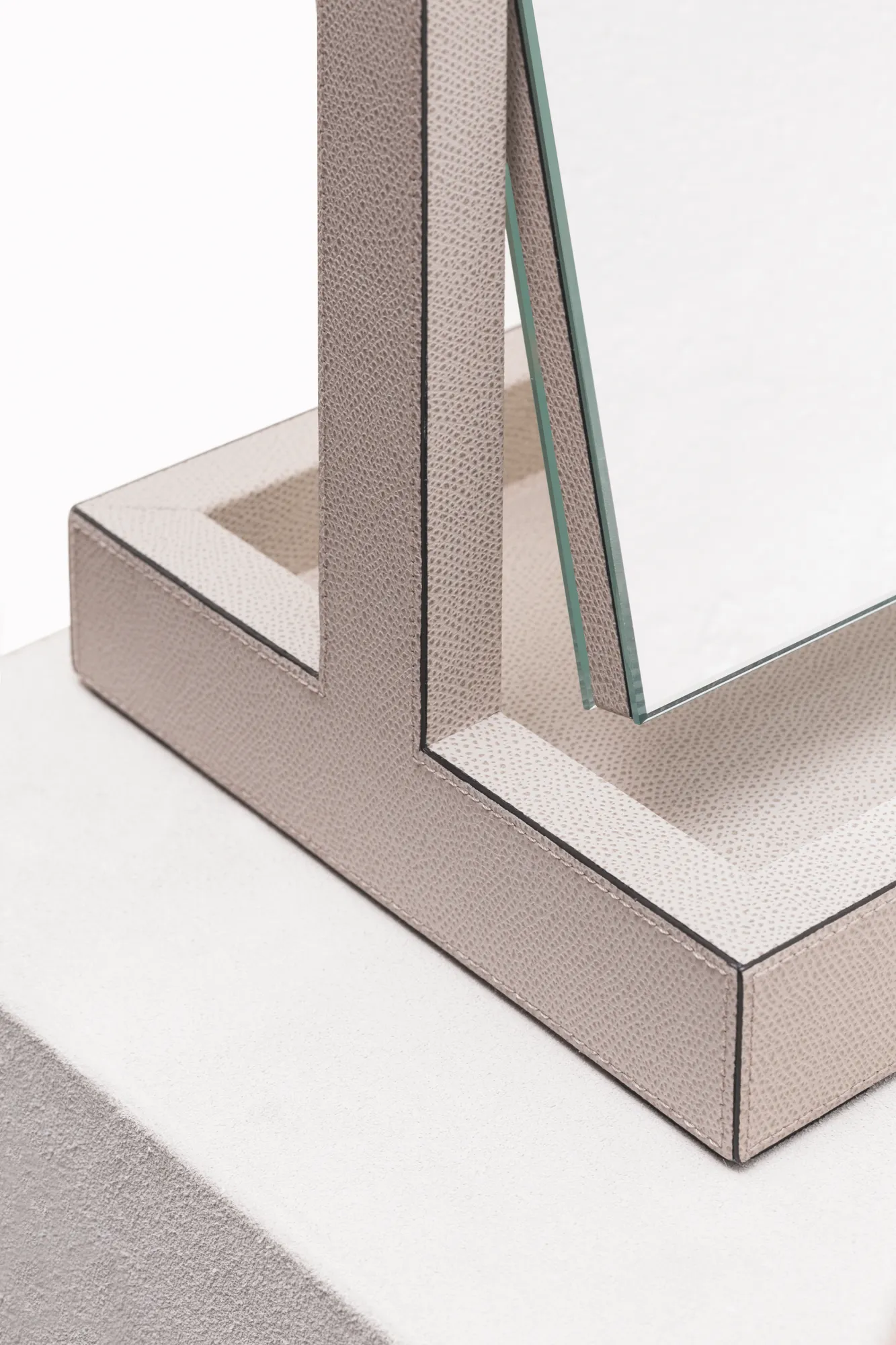 Leather covered wood base fixed on a metal plinth and metal mirror-holding structure. The mirror rotates for a choice of magnification or standard reflection. Includes a valet tray and features a heavy base that ensures stability.