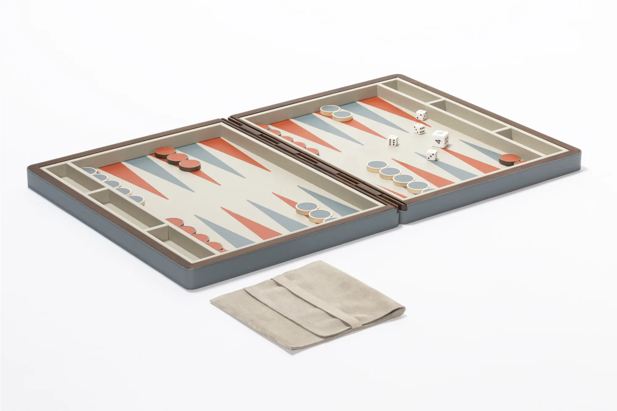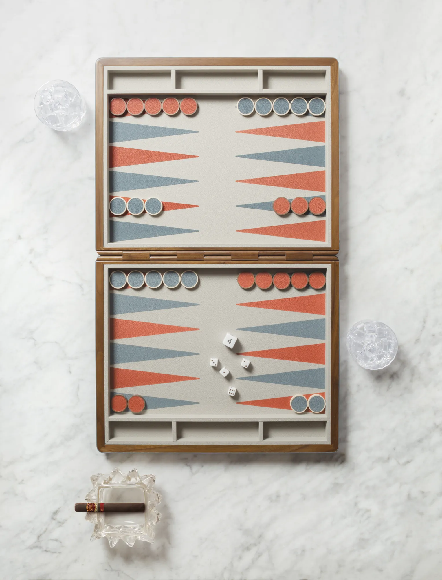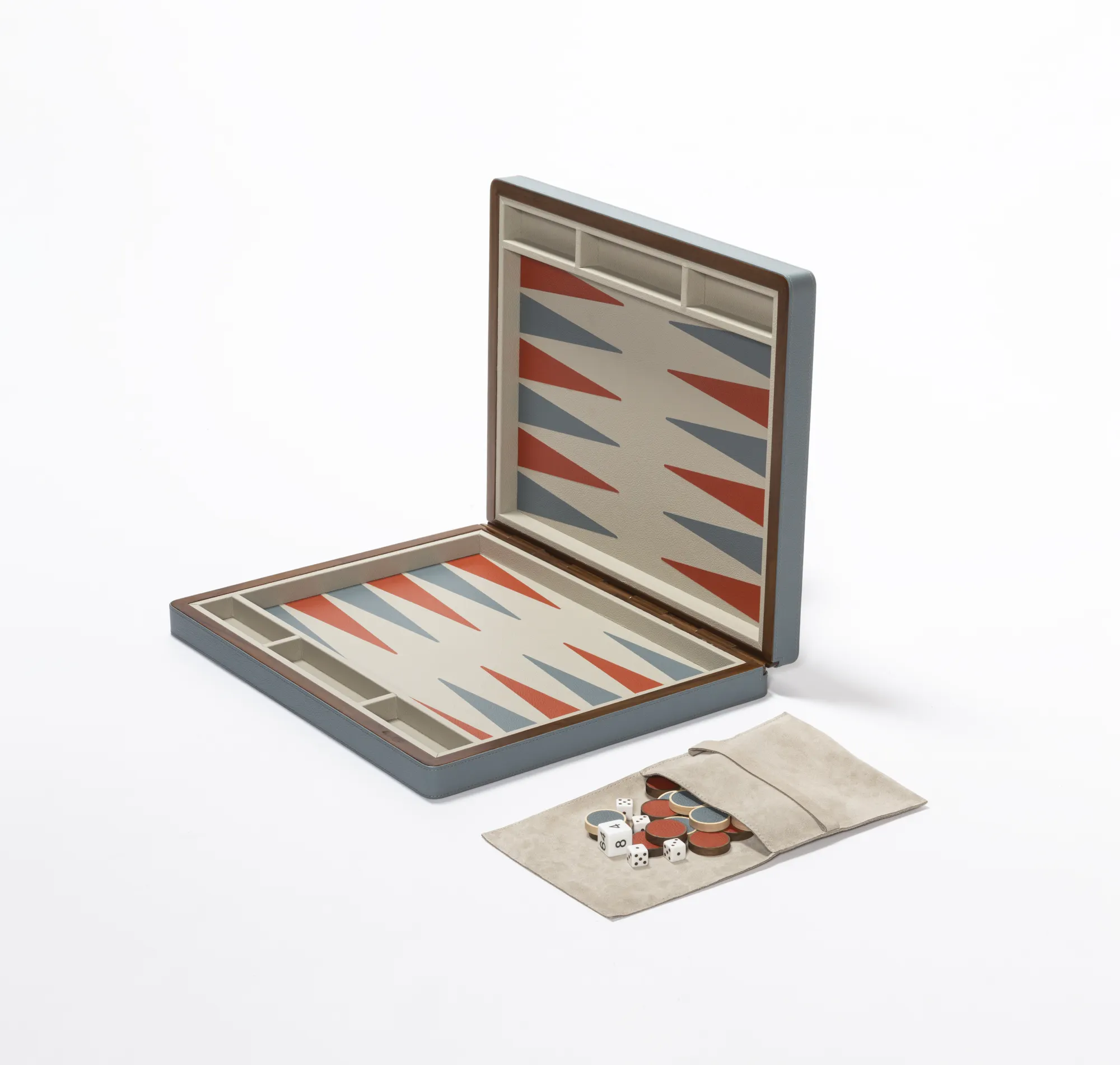 Backgammon is one of the oldest board games in existence. As a refined leather-covered walnut and mahogany case with a masterly inlaid leather playing surface, this board game is designed to provide a tangible and aesthetically pleasing playing experience. The ensemble includes maple and walnut checkers and a set of opaque plexiglass dice and doubling dice, all stored in a fine suede pochette. Entirely made in Pelle Frau®.
