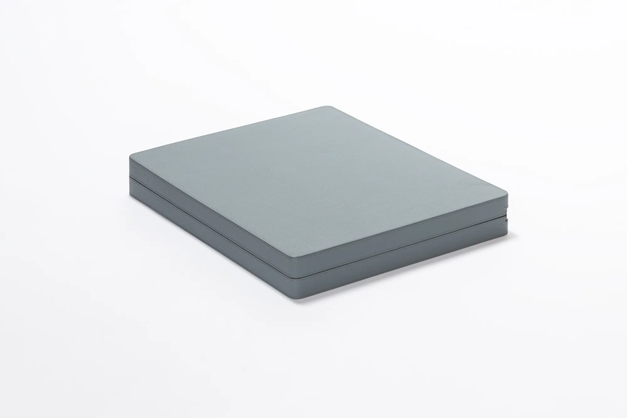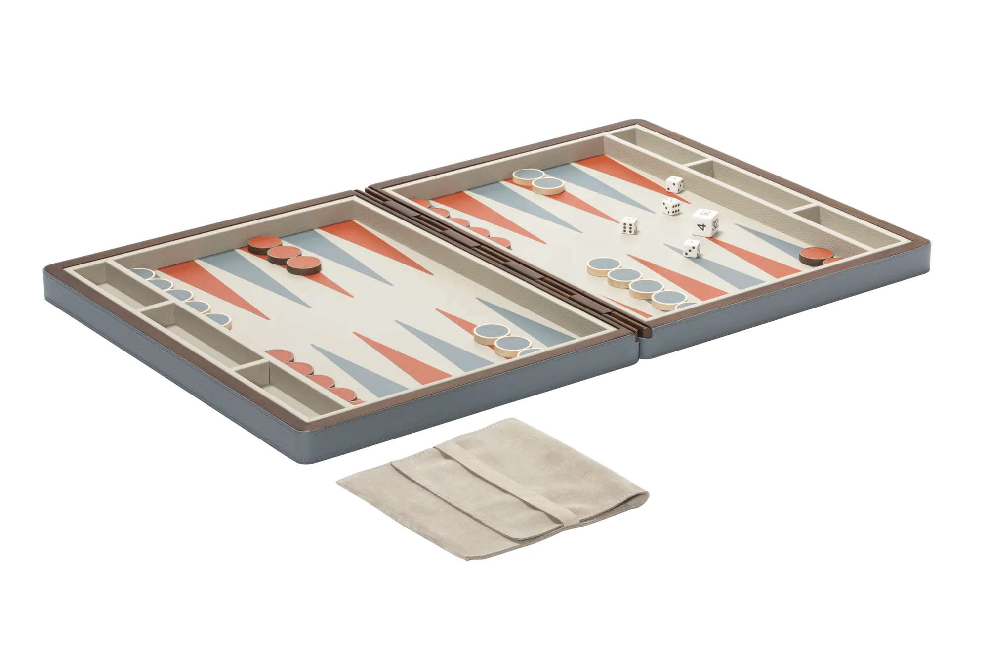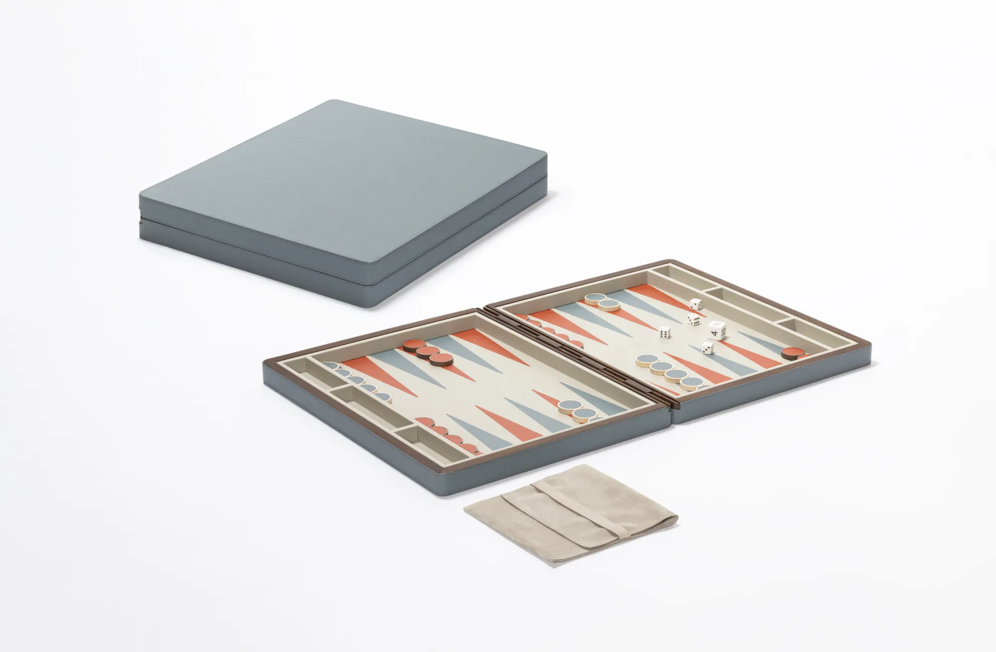 Backgammon is one of the oldest board games in existence. As a refined leather-covered walnut and mahogany case with a masterly inlaid leather playing surface, this board game is designed to provide a tangible and aesthetically pleasing playing experience. The ensemble includes maple and walnut checkers and a set of opaque plexiglass dice and doubling dice, all stored in a fine suede pochette. Entirely made in Pelle Frau®.