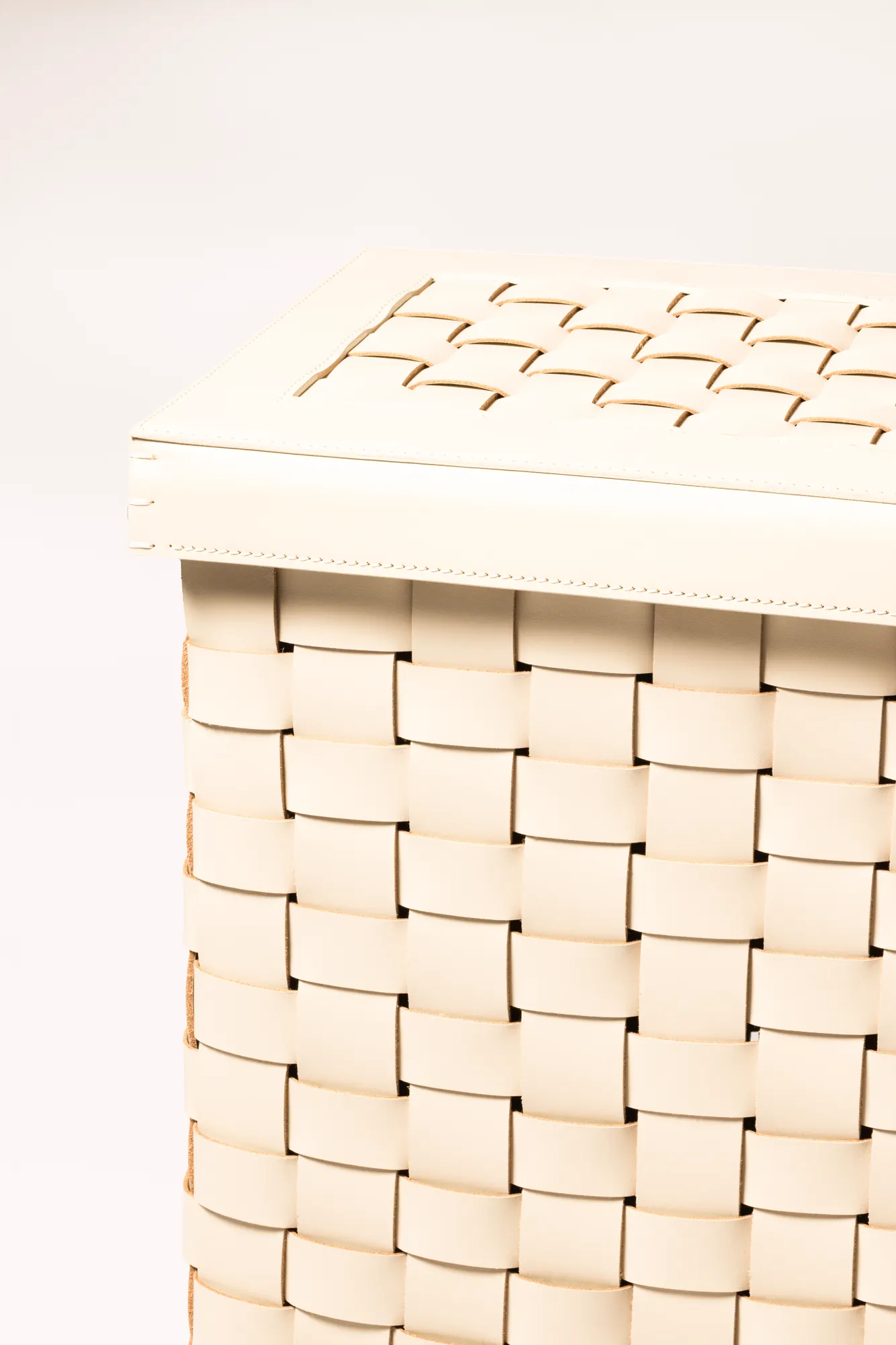 Woven leather laundry baskets either with or without lid. Provided with removable transparent plexiglass inner structure for easy cleaning.