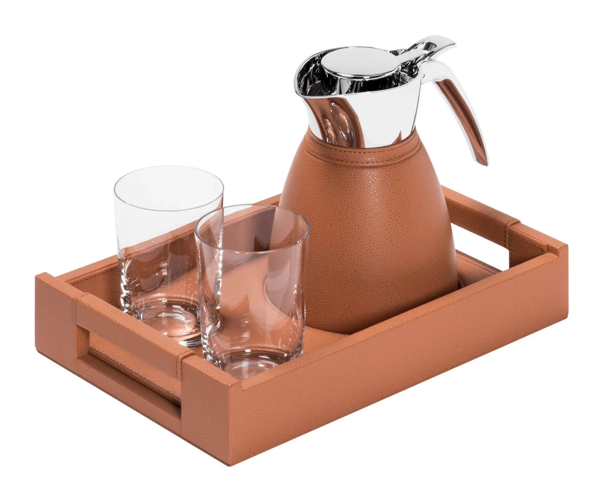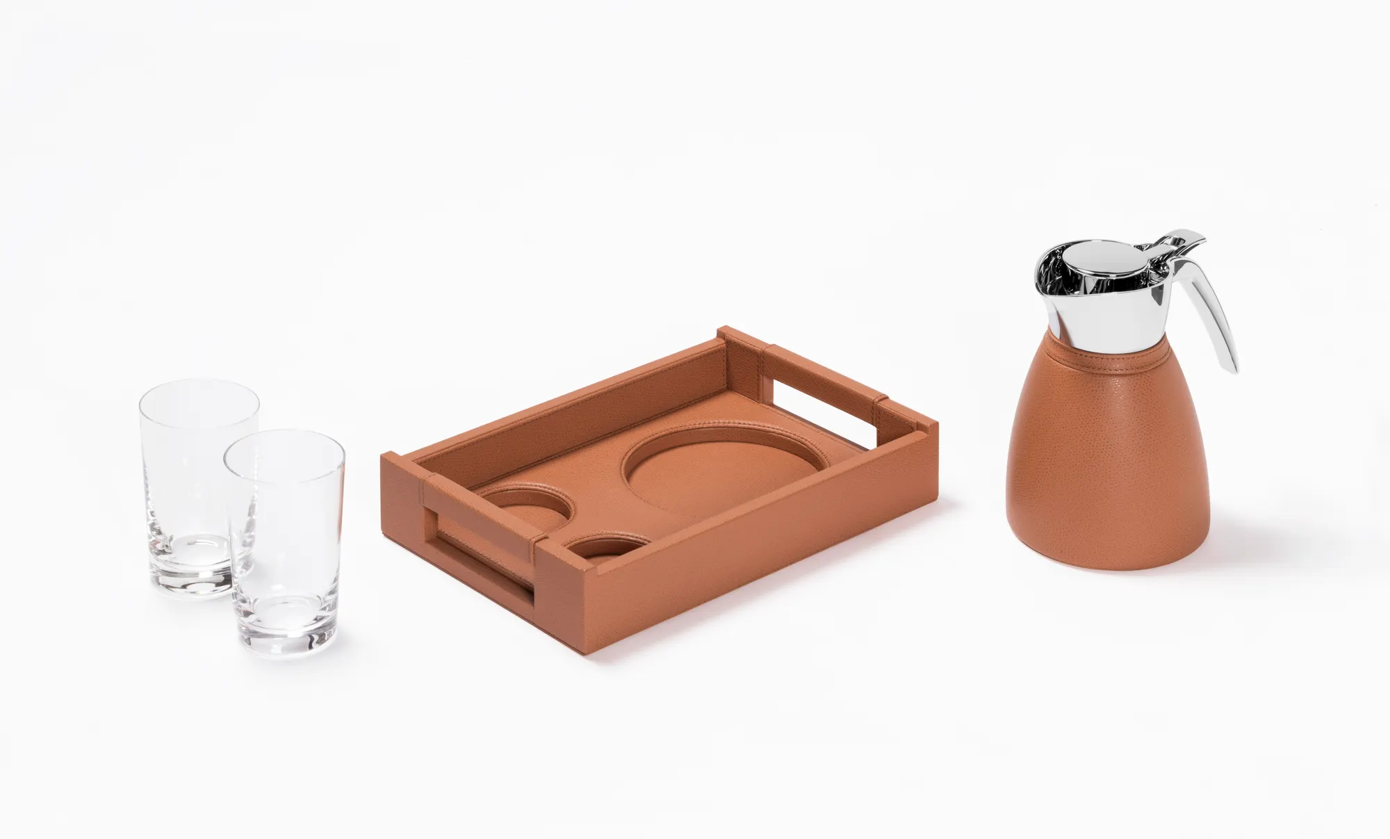 The set includes a small Beaubourg tray (PFV021) with spaces to host, with perfect stability, two fine crystal glasses and one carafe among the following: Chantilly 0.6 LT (PFC051), Monceau 0.6 LT (PFC141), Vincennes 0.6 LT (PFC015).