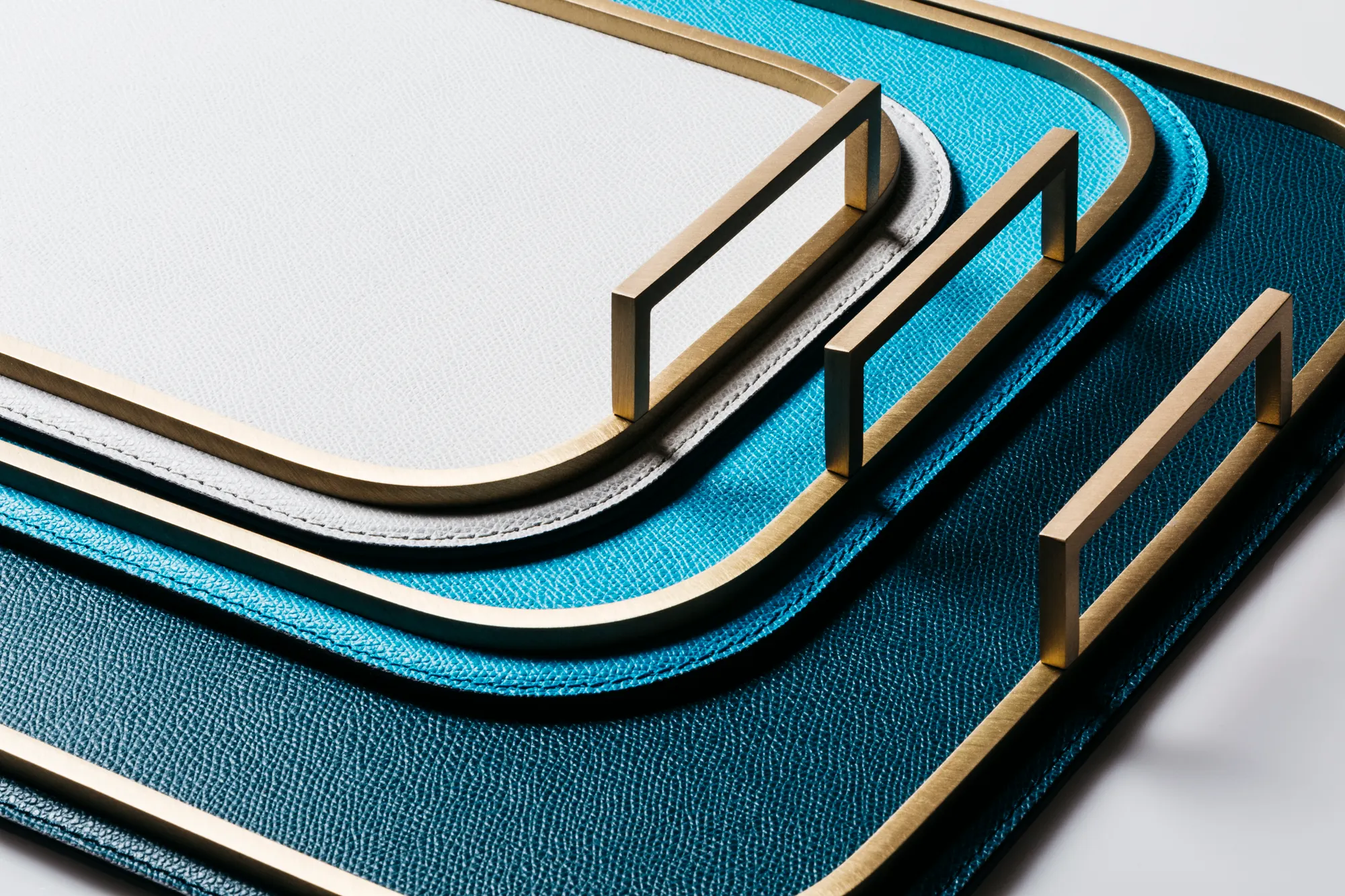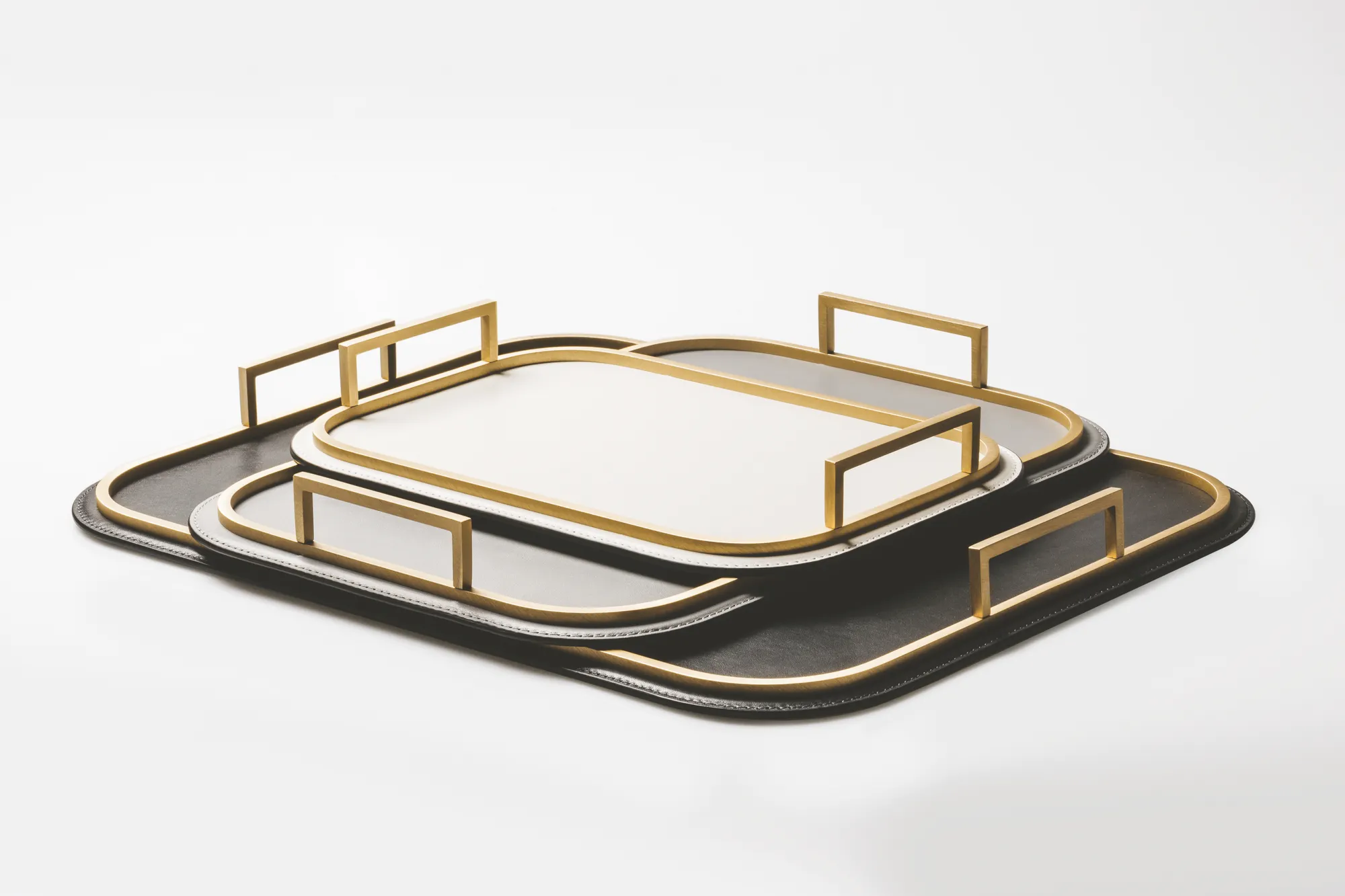 Leather covered metal structure with brass frame and handles.