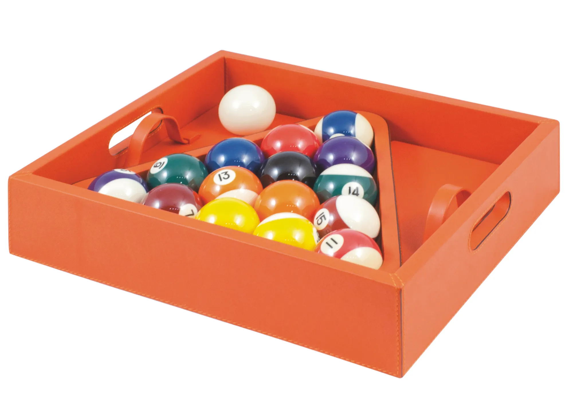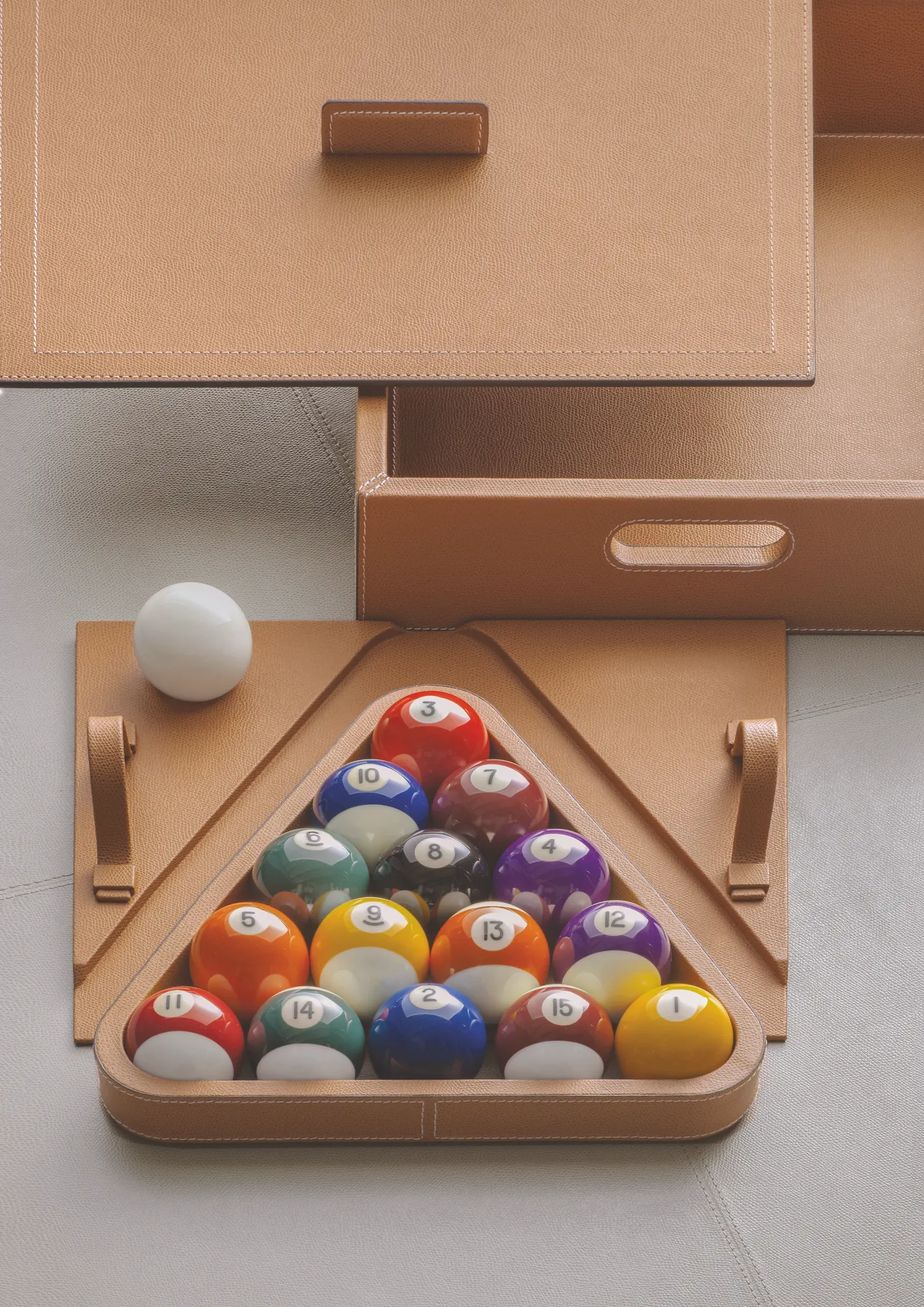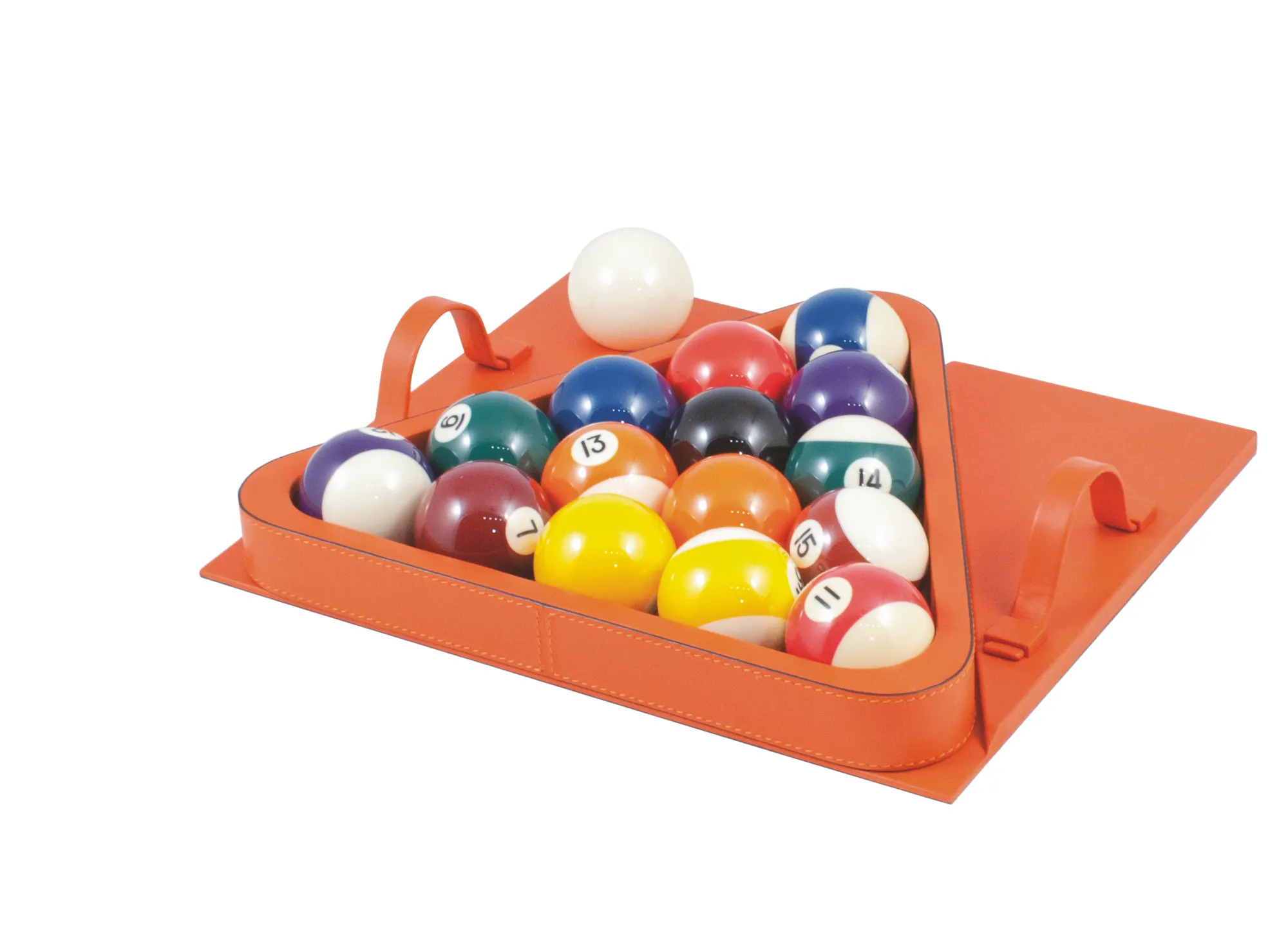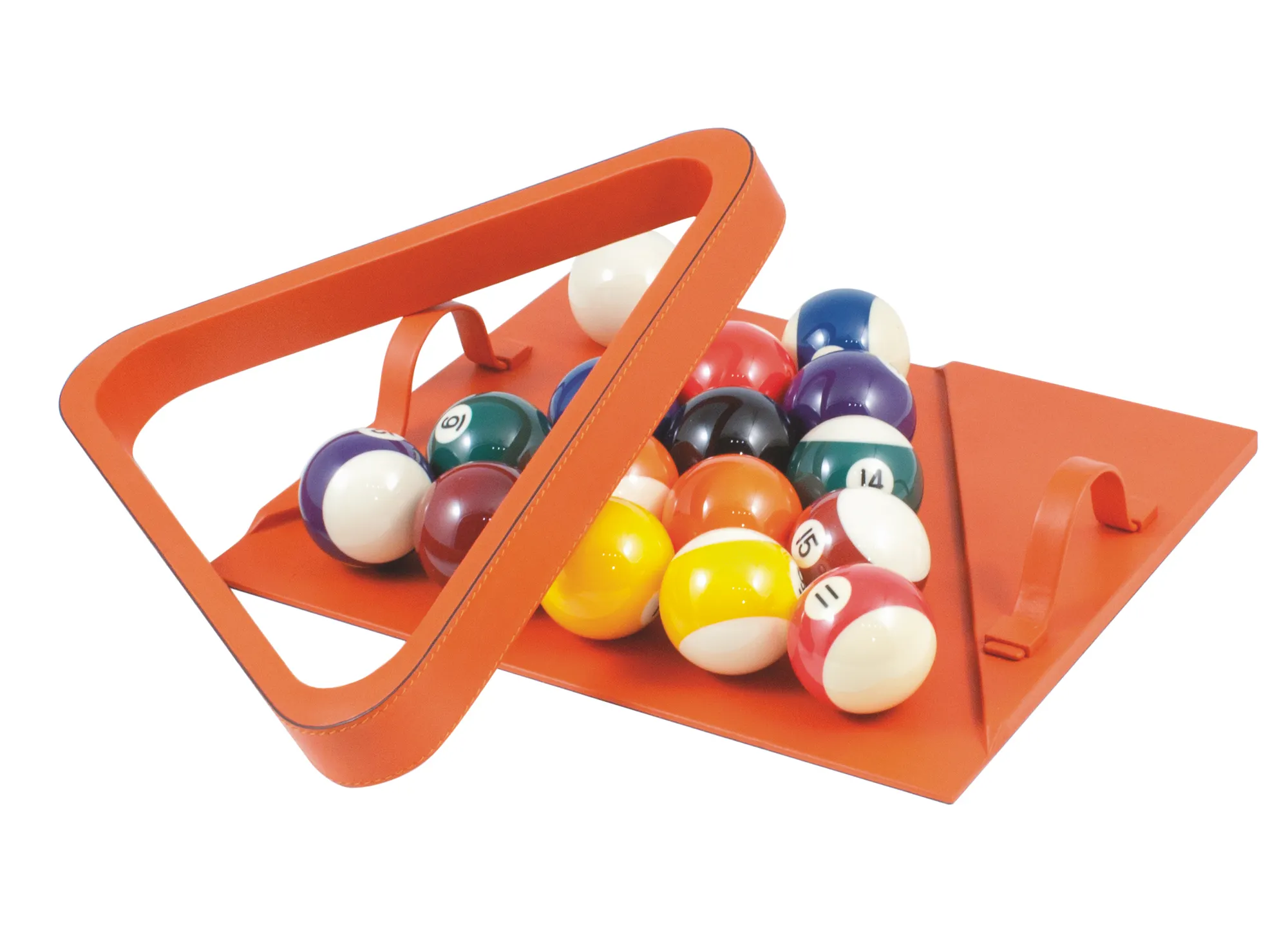 Leather covered wood structure. Removable tray with handles for billiard balls and leather covered wood triangle. Includes professional top quality 57.2 mm balls made of phenolic resin by Aramith.