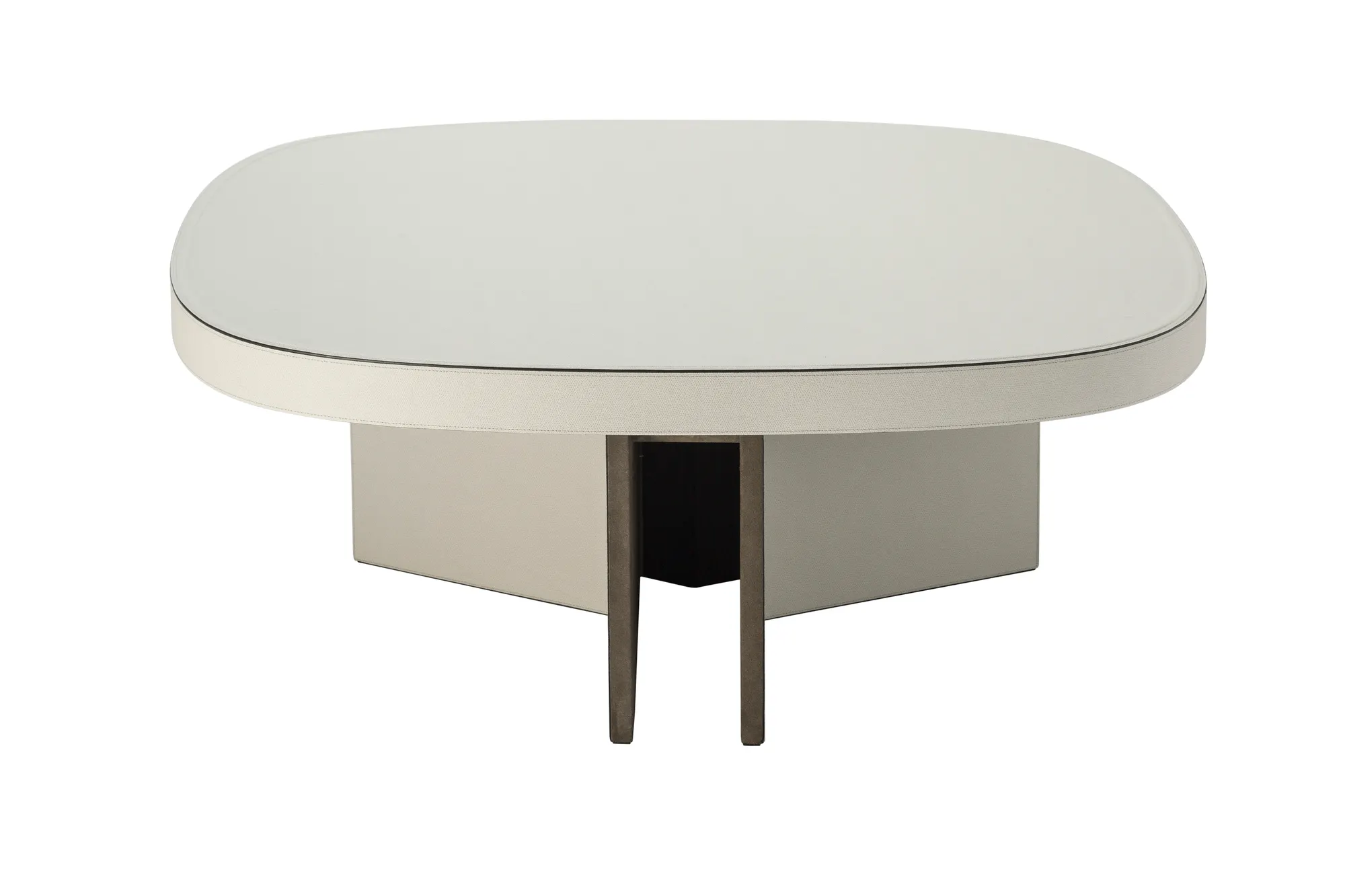 Bivio (meaning “junction” in Italian) collection is characterized by an architectural base made of three folded wooden slabs lined in suede and leather. Combined with tops of various shapes, these elements possess a restrained beauty as well as a strong presence that reminds the futuristic shapes of Villa Girasole, an icon of the 20th century Italian architecture.