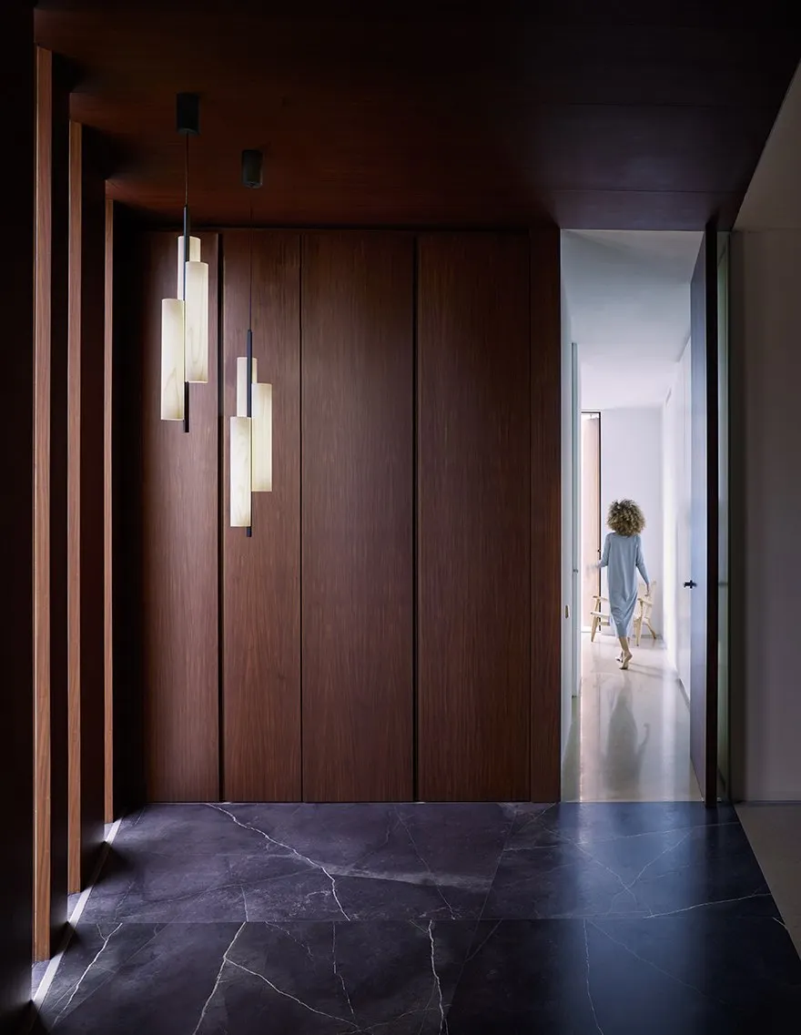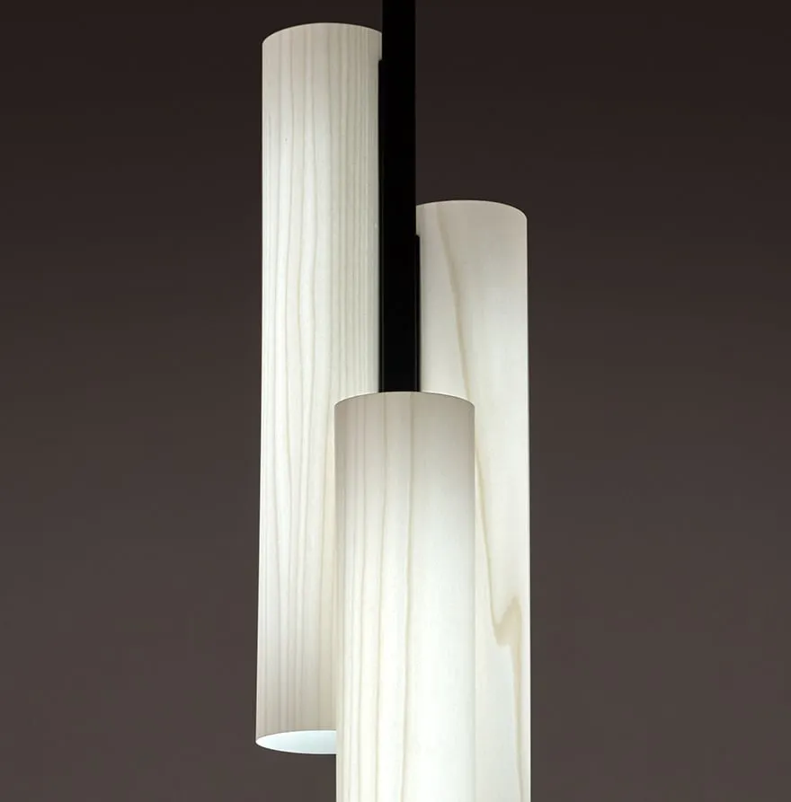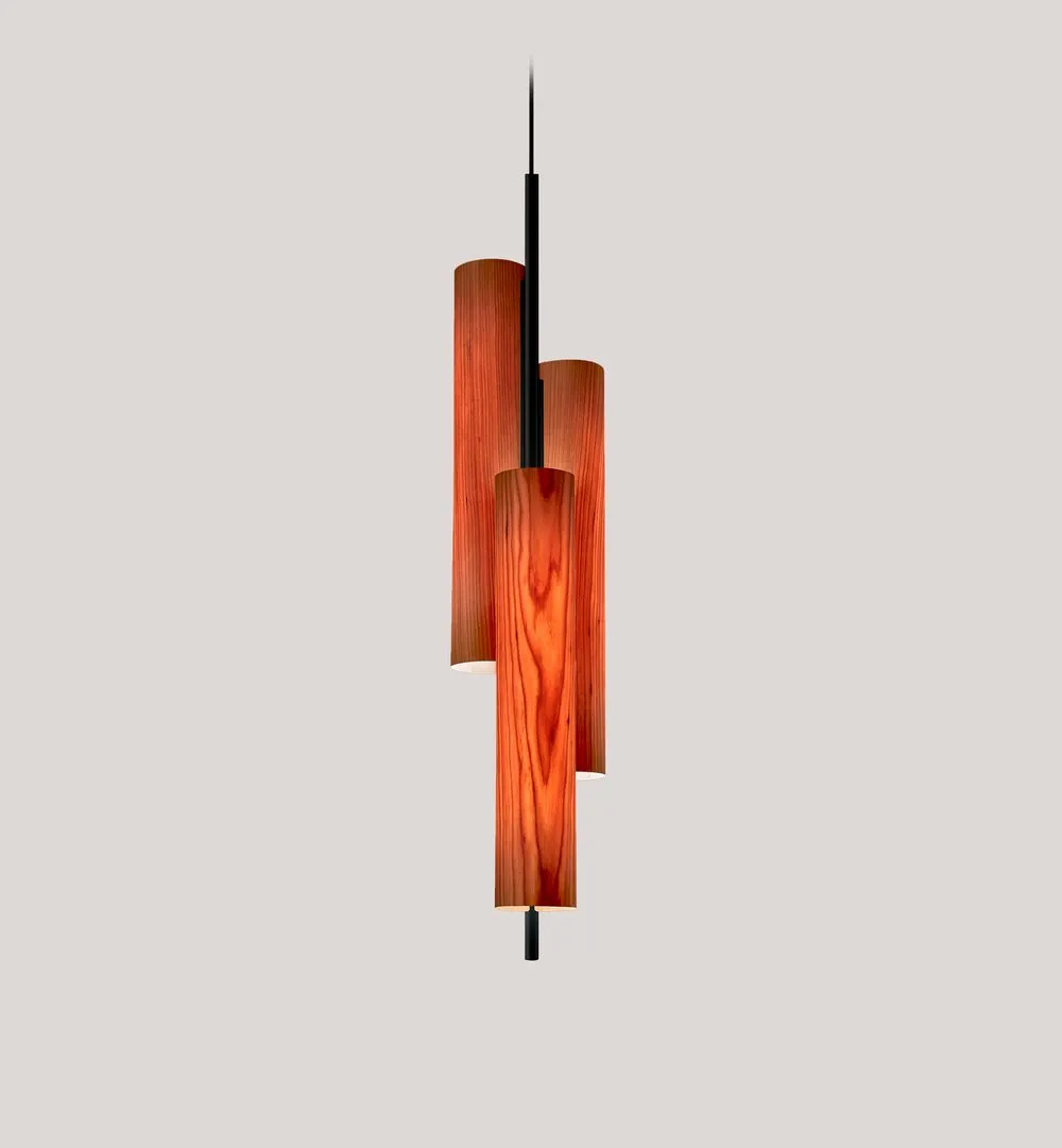 BLACK NOTE TRIPLET THE RHYTHMIC LIGHT. Designed by Ramón Esteve, Black Note is an architectural lamp whose perpendicular shades rise and fall in harmony. Black Note’s rhythmic arrangement is inspired by a piano’s black keys, their sharps and flats used to add a dramatic effect. The Black Note Triplet Suspension lamp places three upright wood veneer shades at varying heights on a metal frame. The arrangement is striking in its simplicity, especially when suspended from a high ceiling or stairwell. Black Note Triplet Suspension is available in three wood veneers: Natural Cherry, Ivory White y Natural Beech. Its metal finishes are Matt Black and Gold.