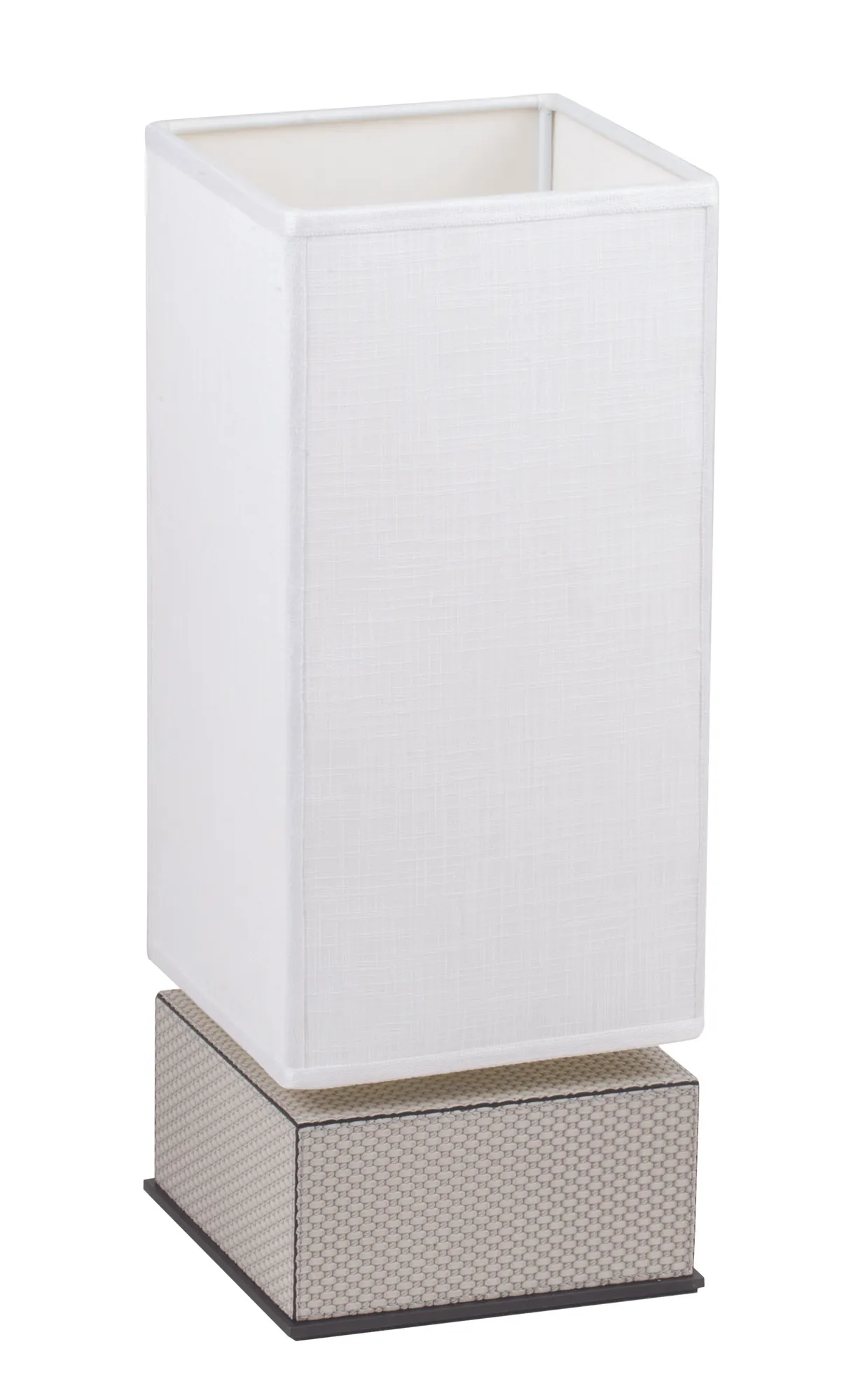 Leather covered wood lamp holder fixed on a metal base available in three finishes (polished chrome, brushed bronze, brushed brass). White linen lampshade with fireproof diffuser.