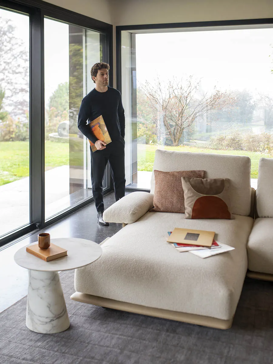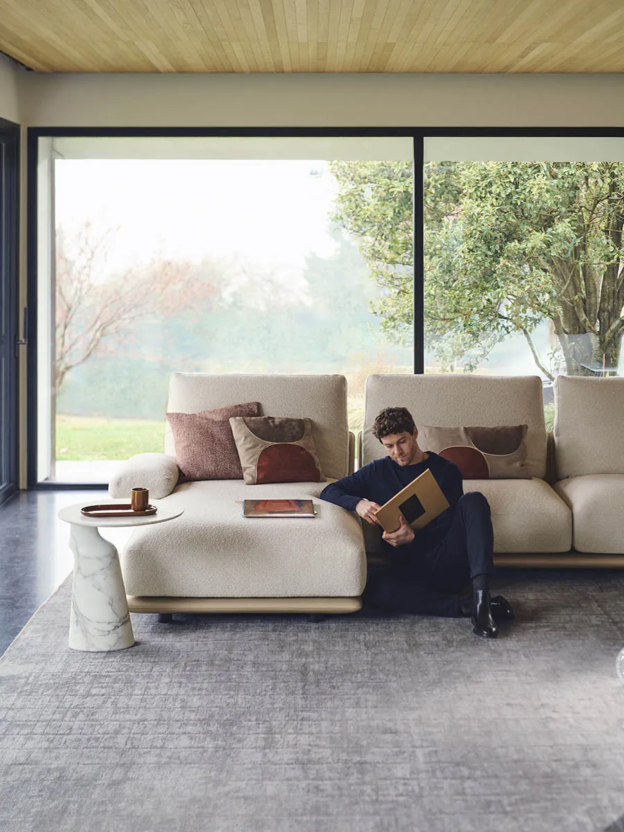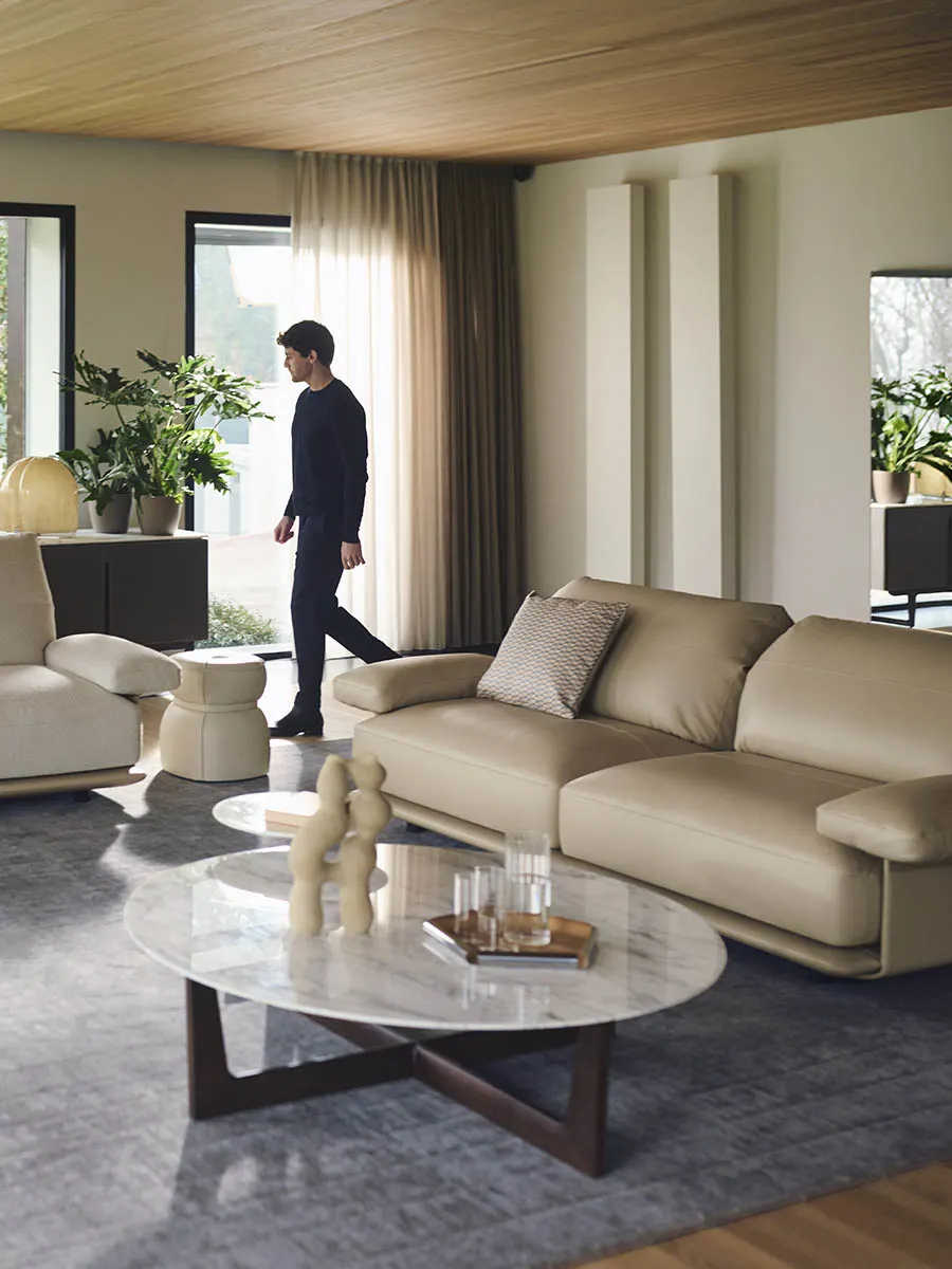 The name comes from “Bliss + Escape”, meaning “a blissful getaway”. A perfect definition for this seating system designed by Ludovica Serafini + Roberto Palomba, which embodies the essence of modern-day comfort and well-being. The Blisscape sofa and pouf are in fact defined by an elegant, sculptural leather structure that serves as the base for soft, welcoming cushioning. They are characterized by generous padding, resting on a Pelle Frau® leather base that appears to float just a few inches above the floor. The Blisscape collection is modular and customizable, offering multiple configurations to suit any space or lifestyle needs.