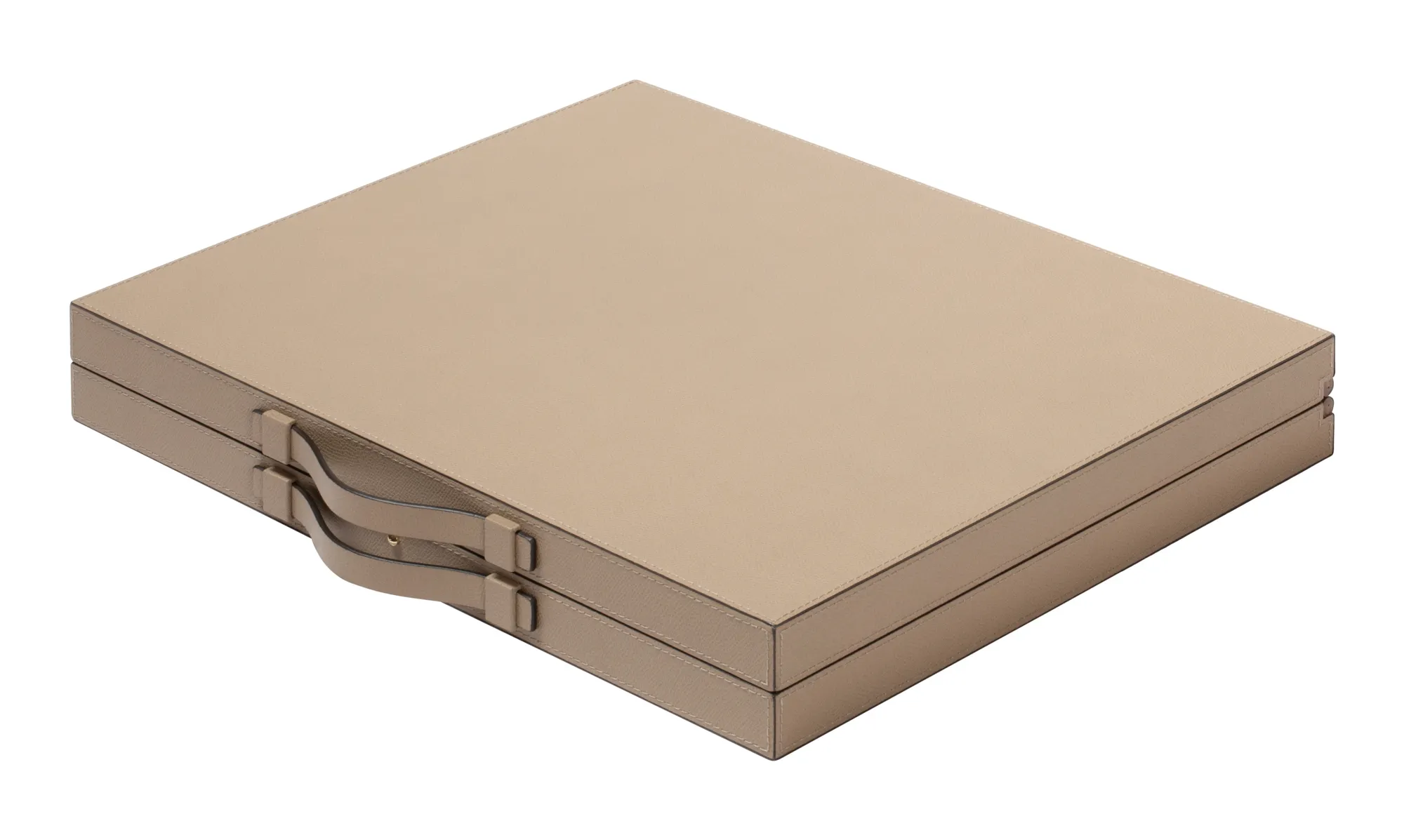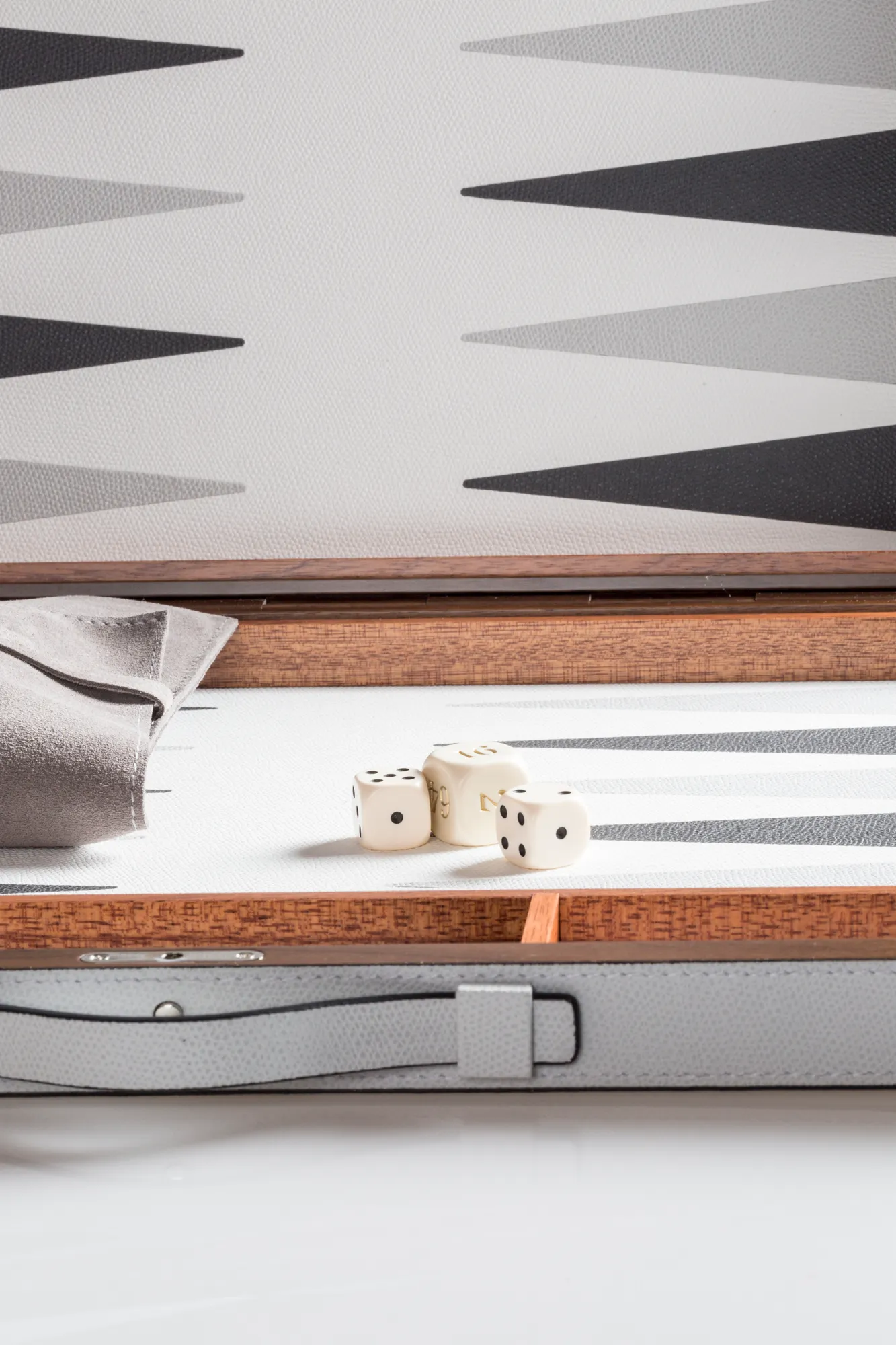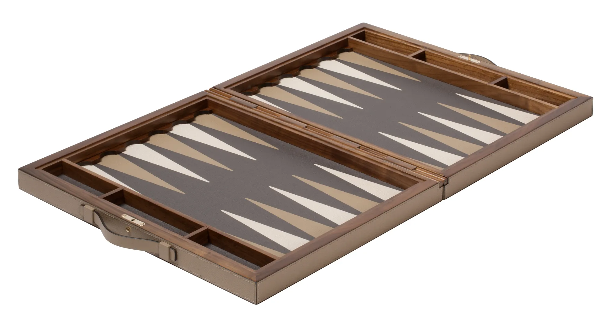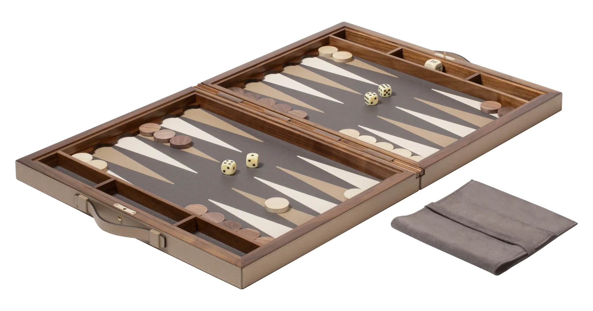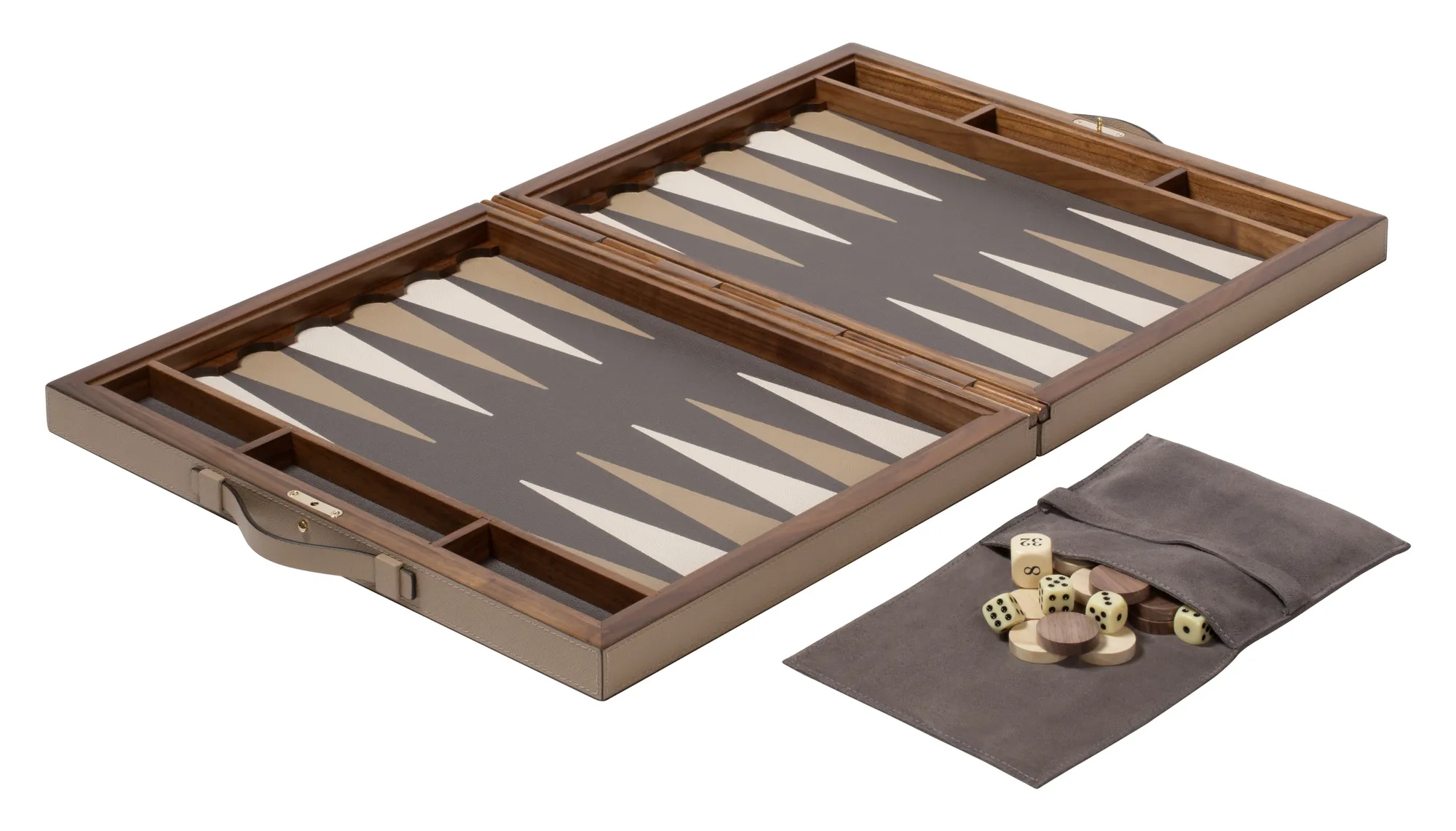 Leather covered walnut and mahogany case with inlaid walnut hinge and magnetic closing with button. Leather inlaid playing surface (it is possible to choose different colors). Includes boxwood checkers and dice. Provided with handles. Maple and walnut wood checkers can be upgraded with a fine leather inlay.