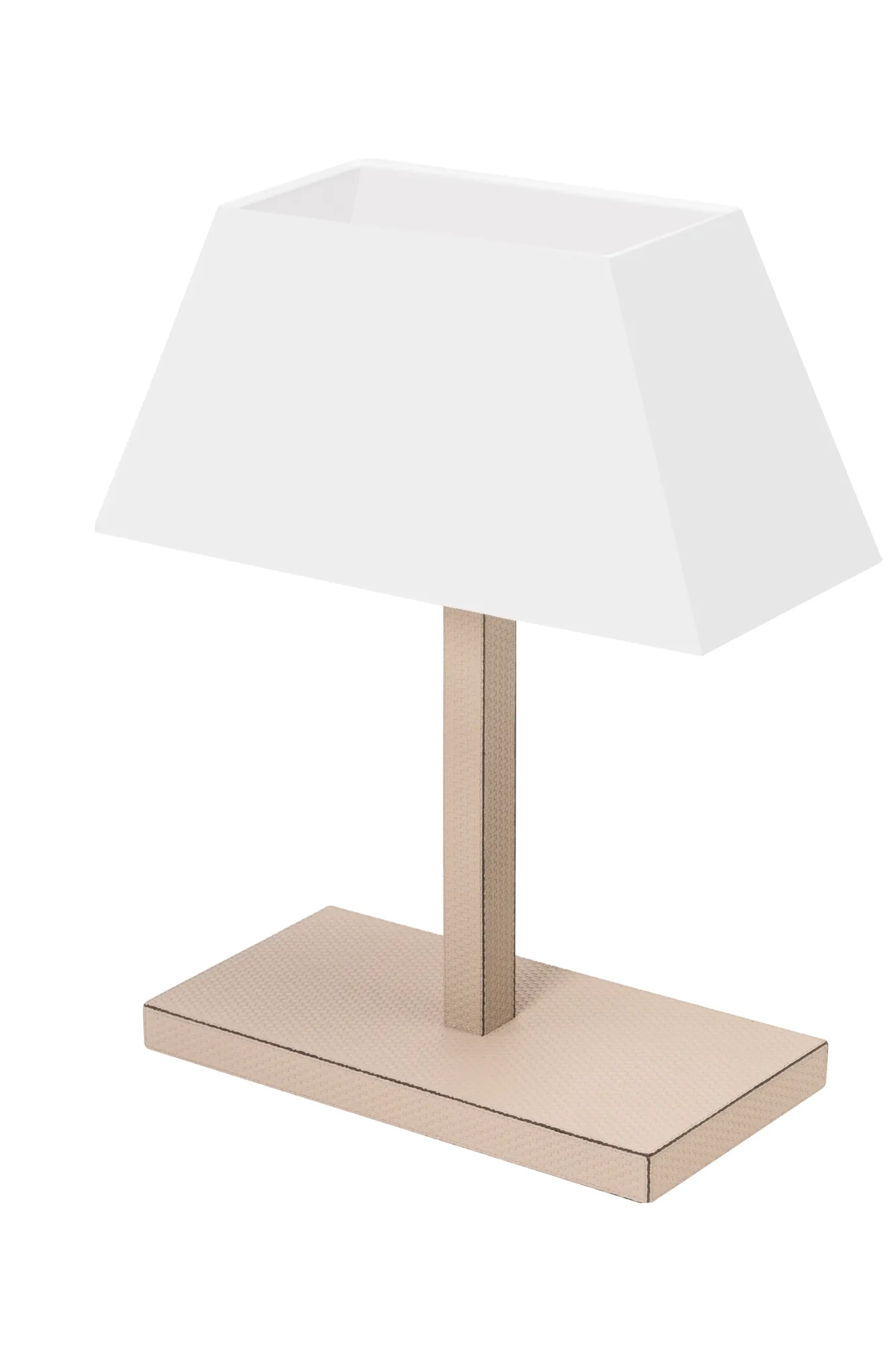 Leather covered wood structure and metal base. White linen lampshade with fireproof diffuser.