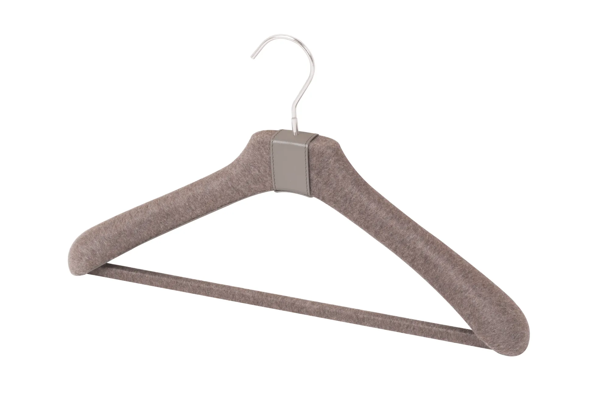 Suit hanger that provides optimum shoulder support. Wood structure covered with leather and finest quality sustainable cashmere by Fratelli Tallia Di Delfino. No "clanking". Perfect for airplanes and yachts.
