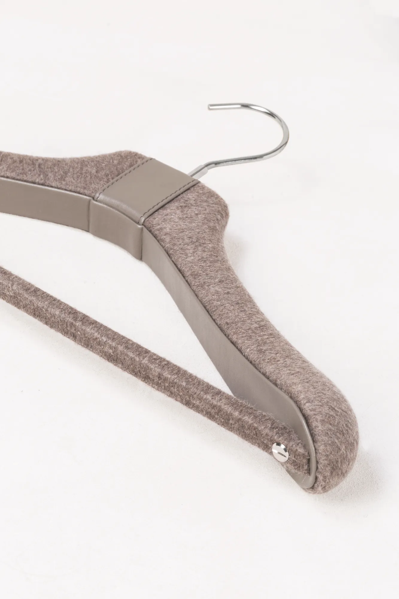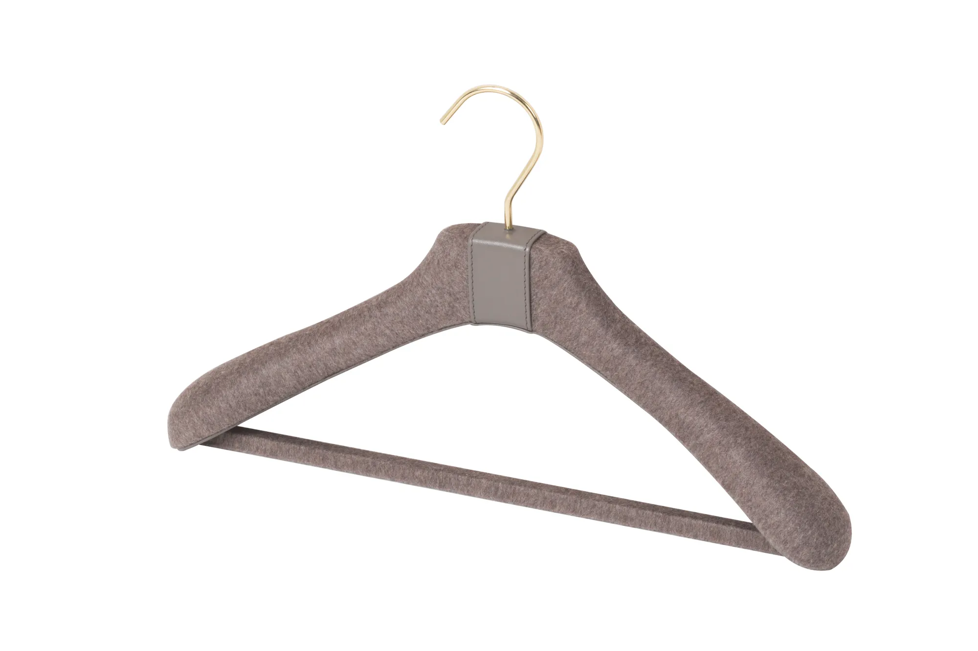 Suit hanger that provides optimum shoulder support. Wood structure covered with leather and finest quality sustainable cashmere by Fratelli Tallia Di Delfino. No "clanking". Perfect for airplanes and yachts.