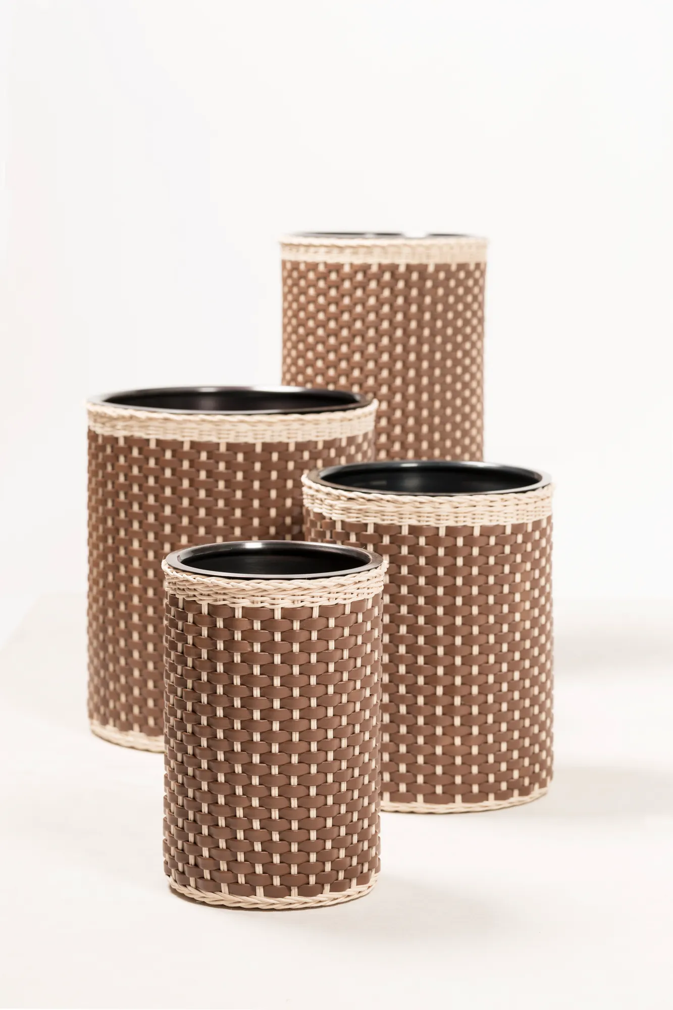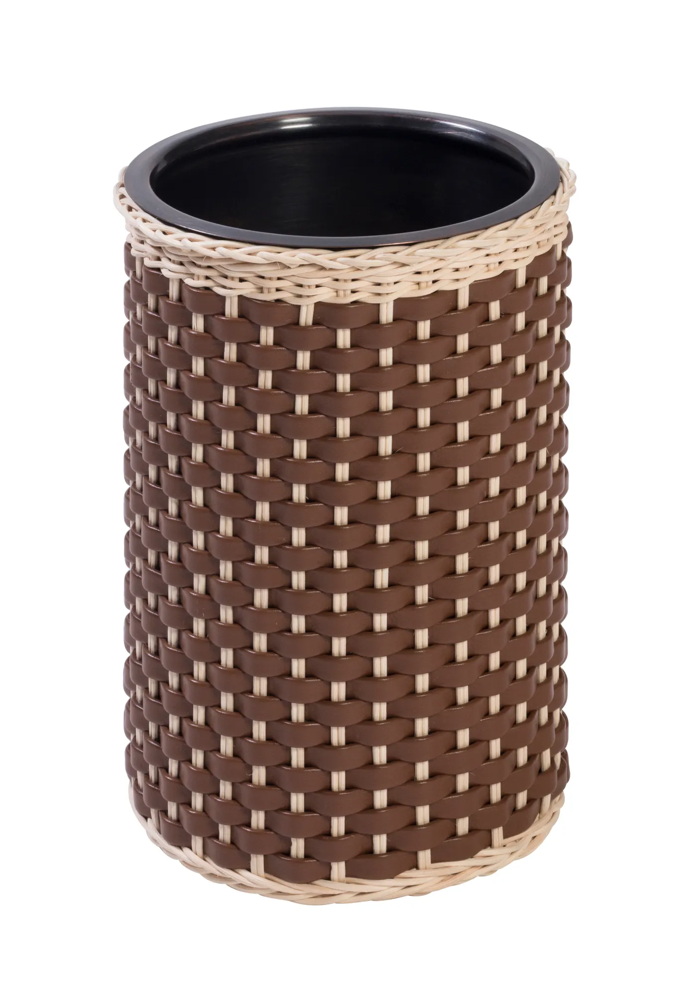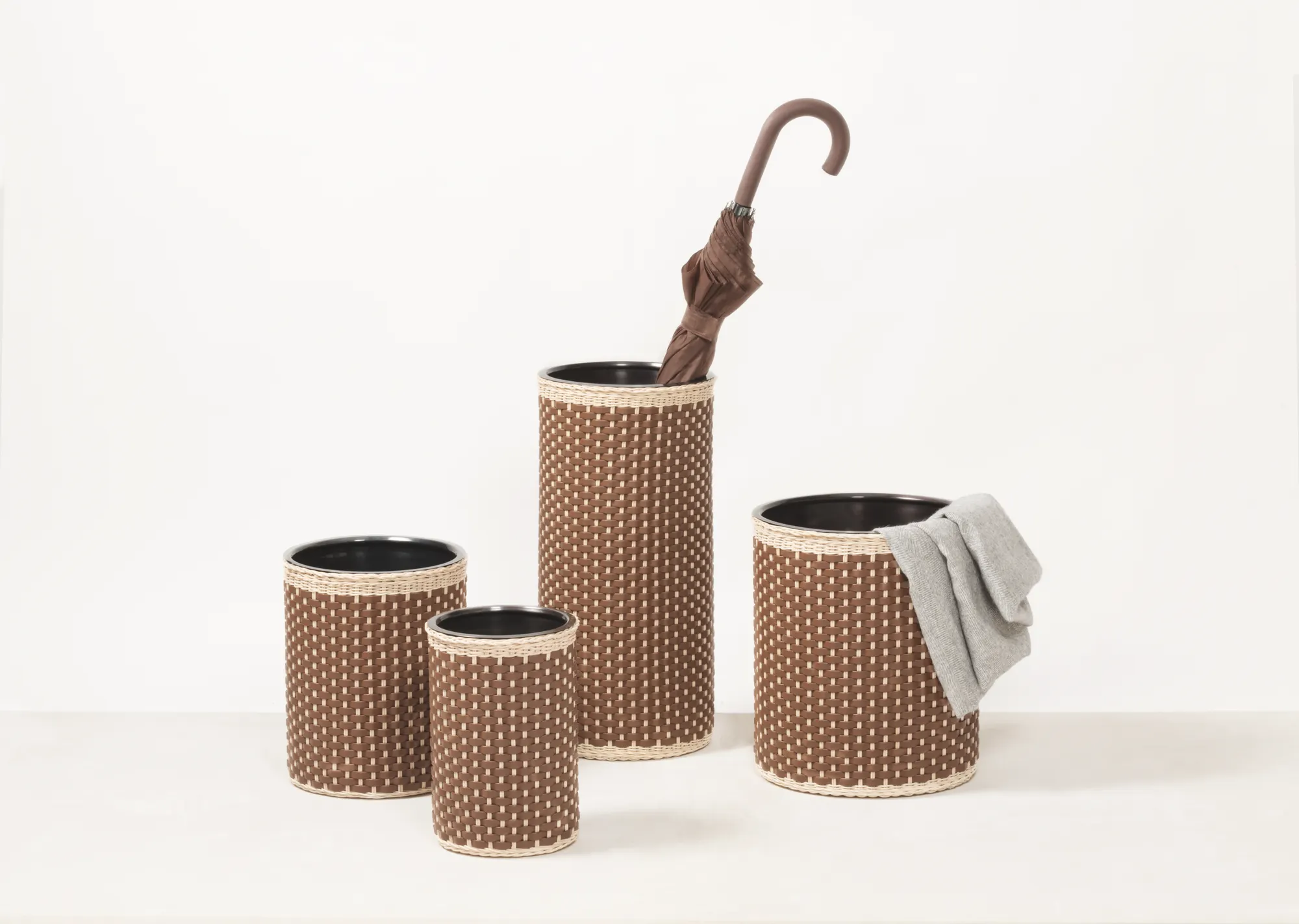 Structure made in woven leather and rattan. Metal container inside available in three finishes of choice: polished chrome, brushed brass and brushed bronze. Only available with natural rattan (RT06) combined with golf or nappa leather.