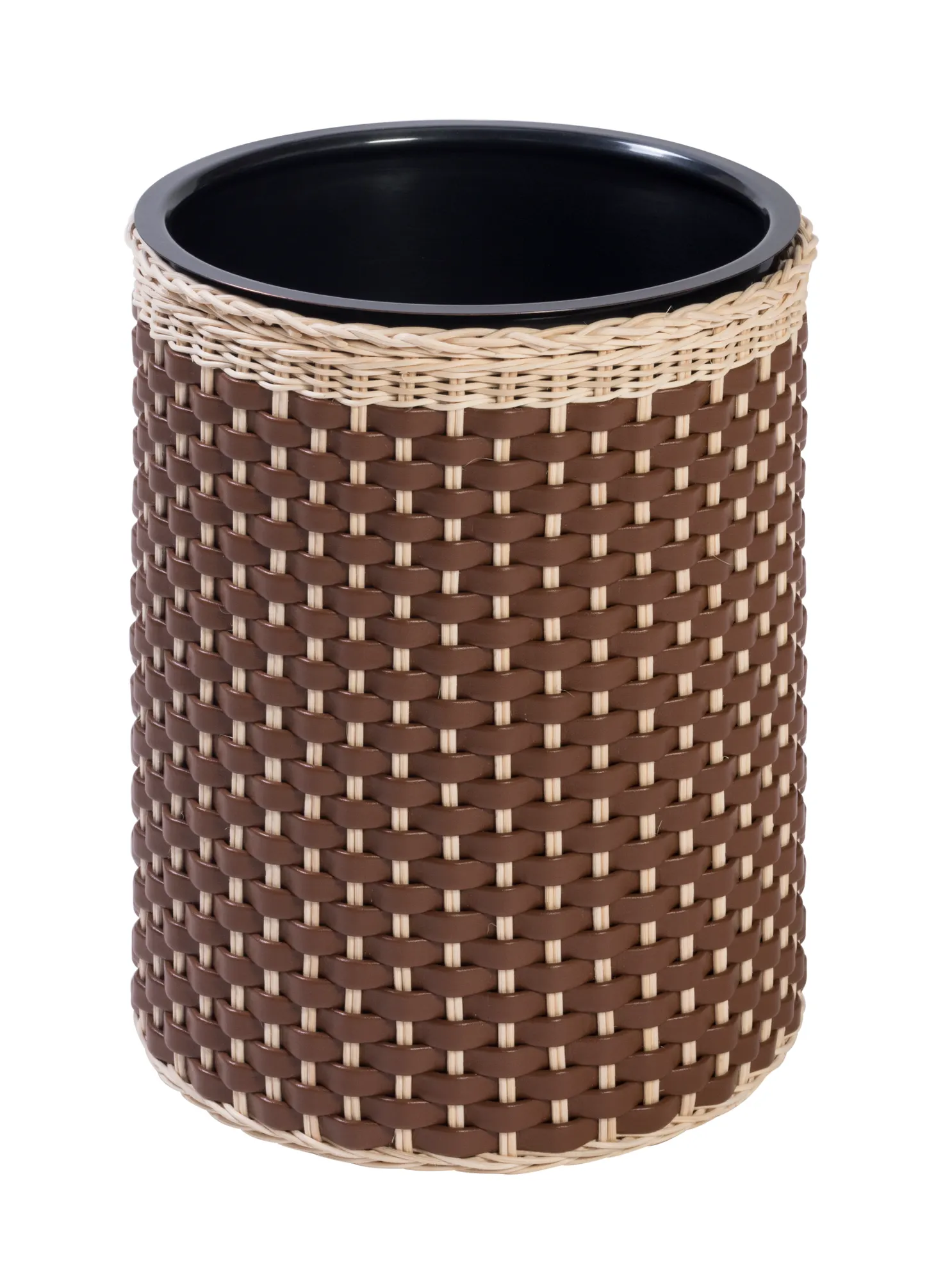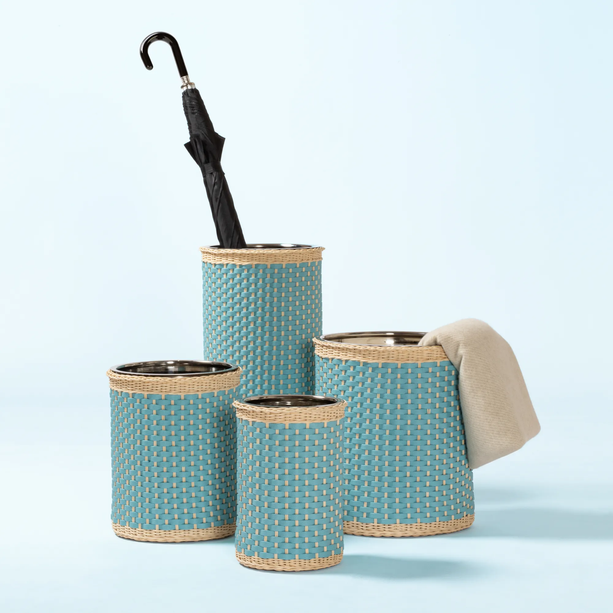 Structure made in woven leather and rattan. Metal container inside available in three finishes of choice: polished chrome, brushed brass and brushed bronze. Only available with natural rattan (RT06) combined with golf or nappa leather.