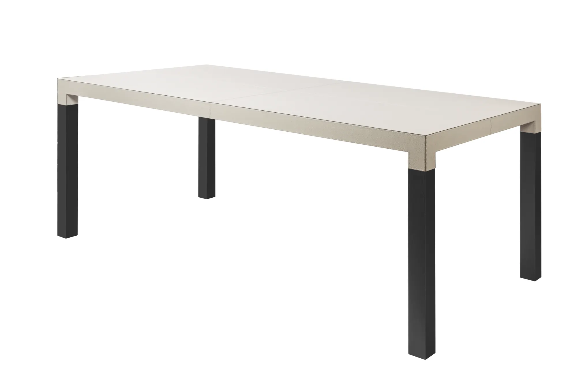 Leather covered oak structure (available in three finishes) with inlaid leather top. Removable legs. Leather covered plywood top.