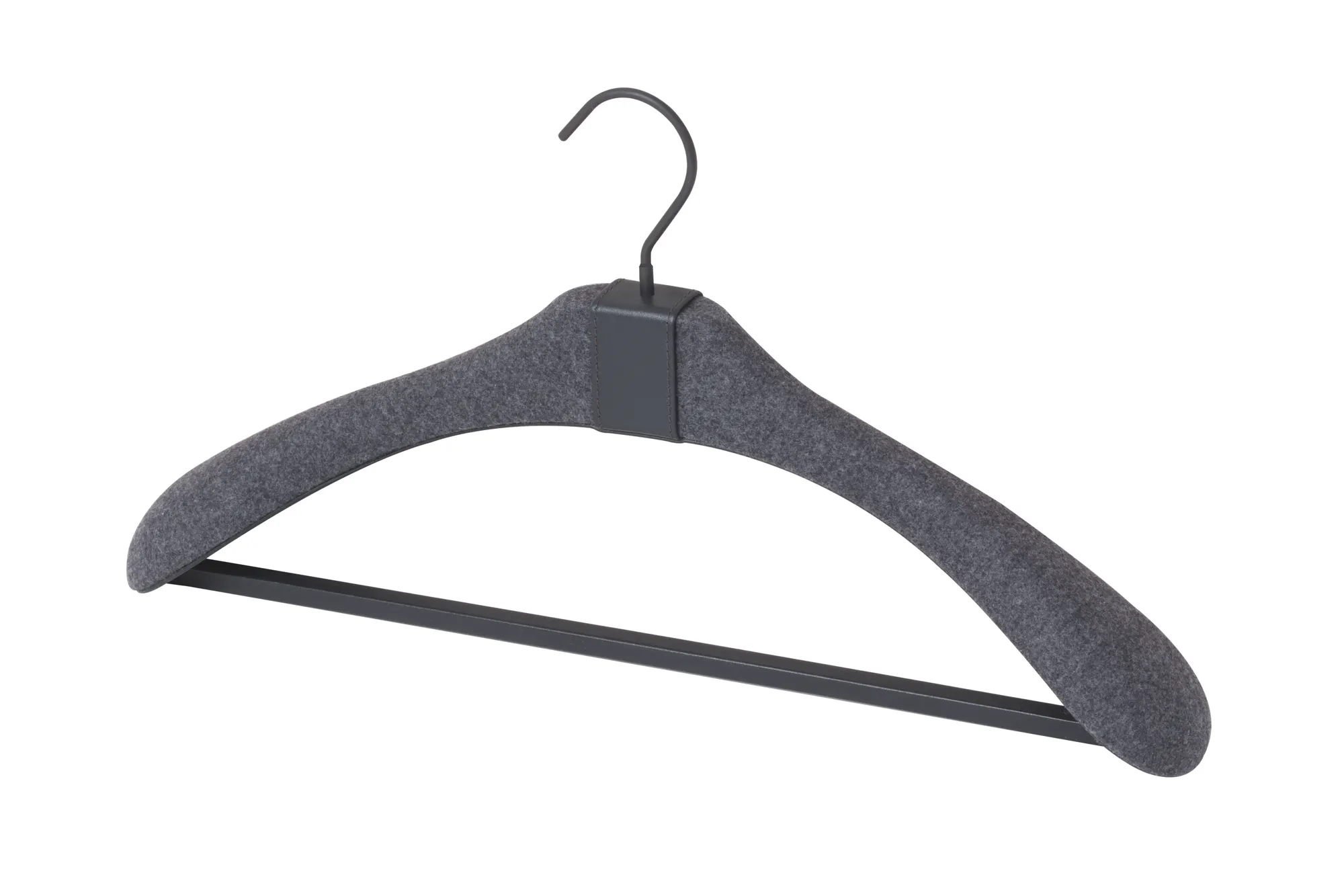 Suit hanger that provides optimum shoulder support. Wood structure covered with leather and finest quality sustainable cashmere by Fratelli Tallia Di Delfino. No "clanking". Perfect for airplanes and yachts.